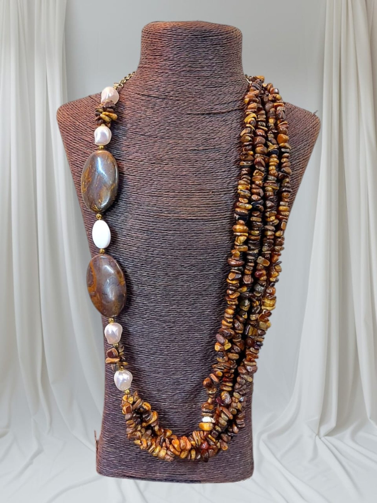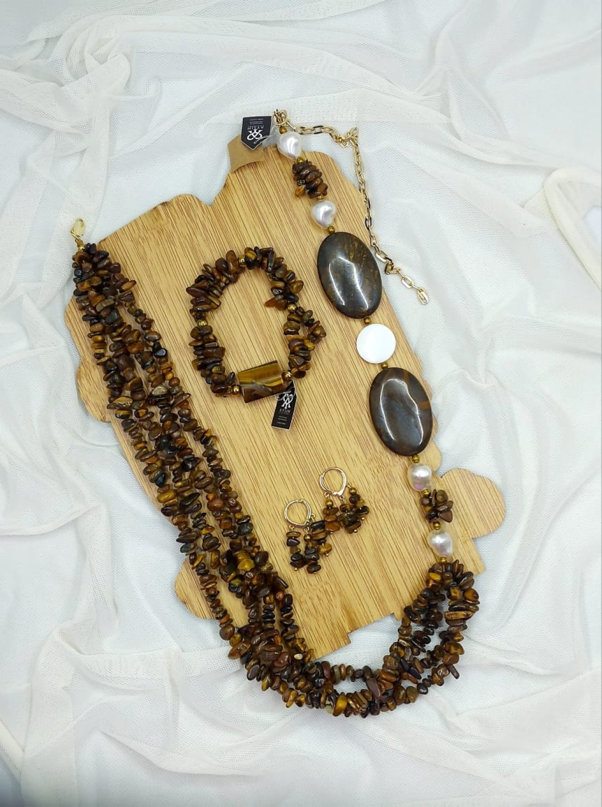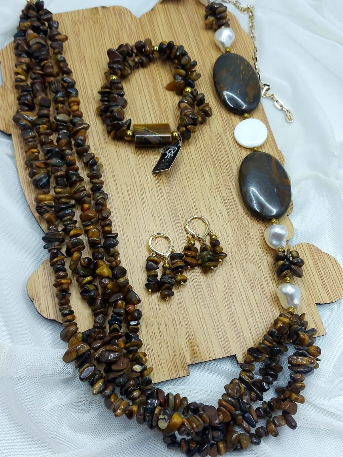A set consisting of a necklace, earrings, and bracelet made of Tiger's Eye stones .