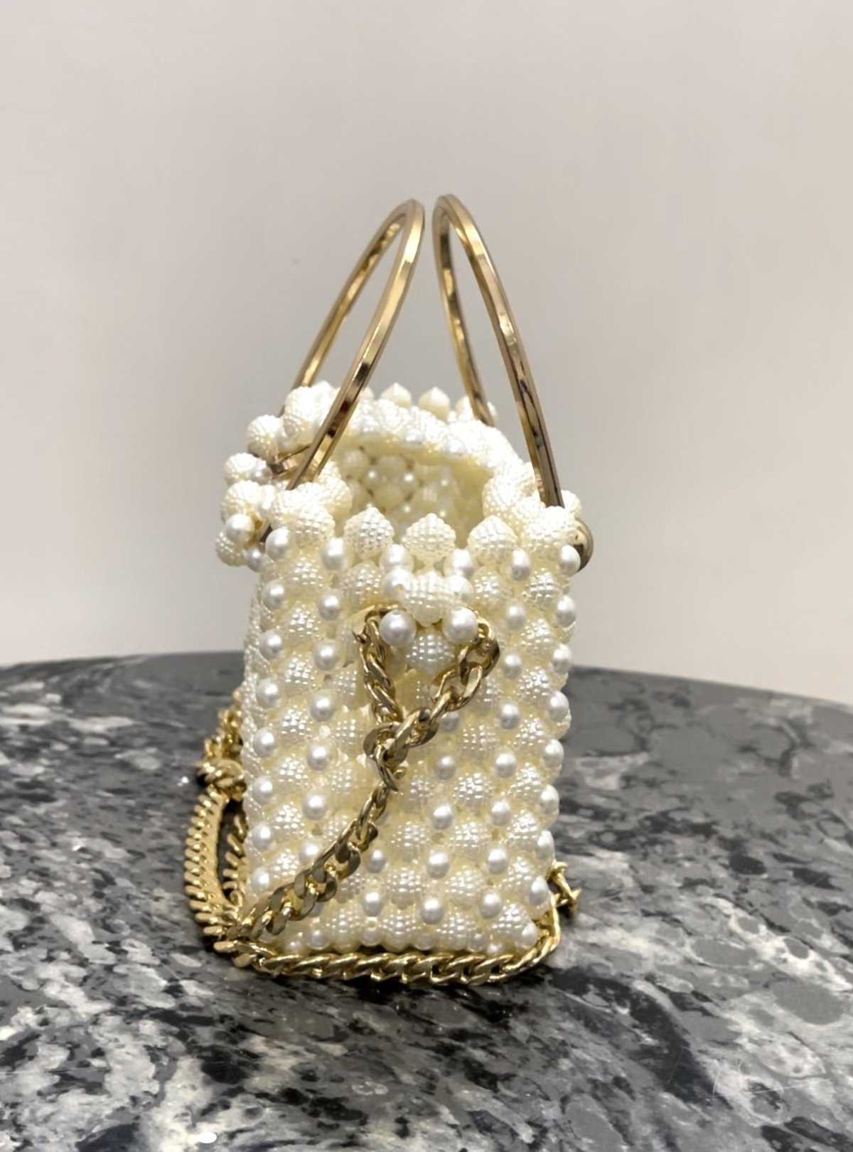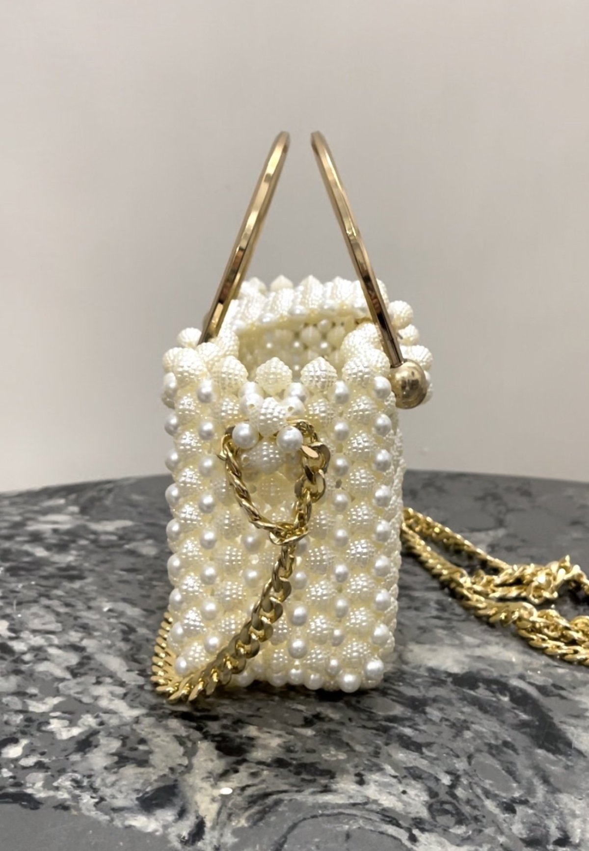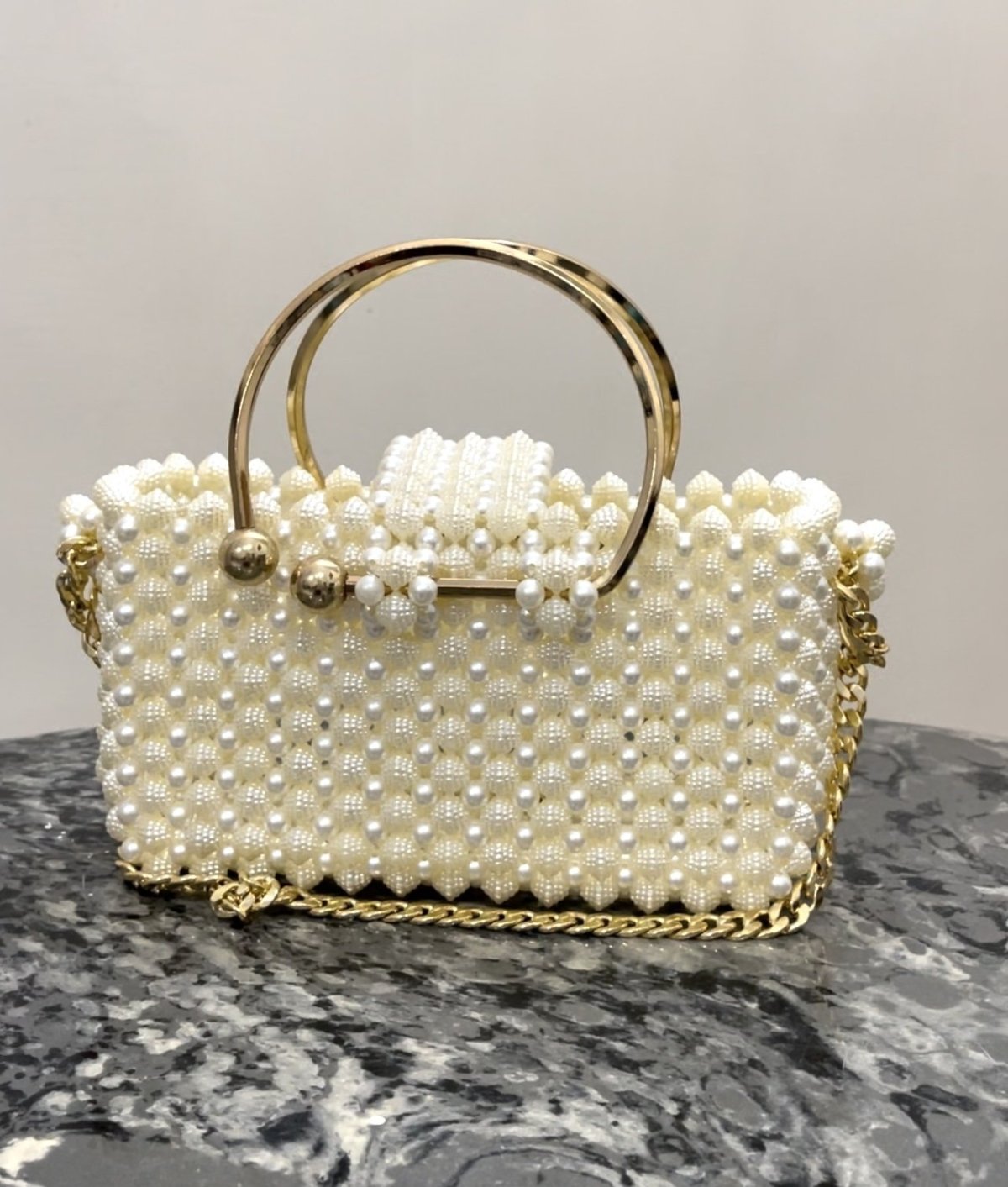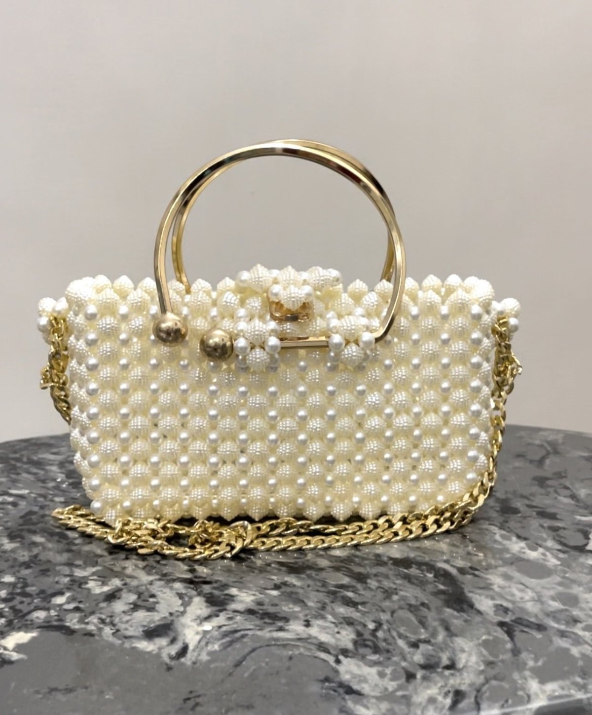 Sugar crumbs bead bag with round beads, equipped with 2 golden handles, with a golden belt and a magnetic clasp for closing. It is sufficient for 2 mobile phones, a wallet and keys. Width: 19 cm, length: 10 cm.