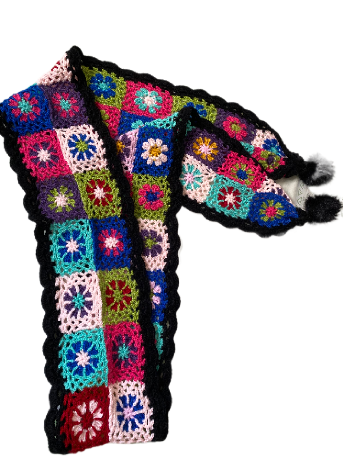 colored motif crochet scarf. size 2m long x 20 cm wide. available to design different colors and sizes.