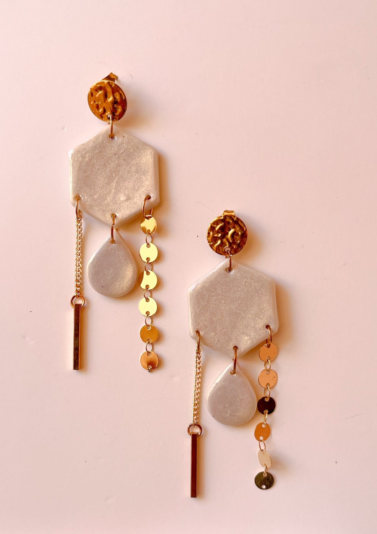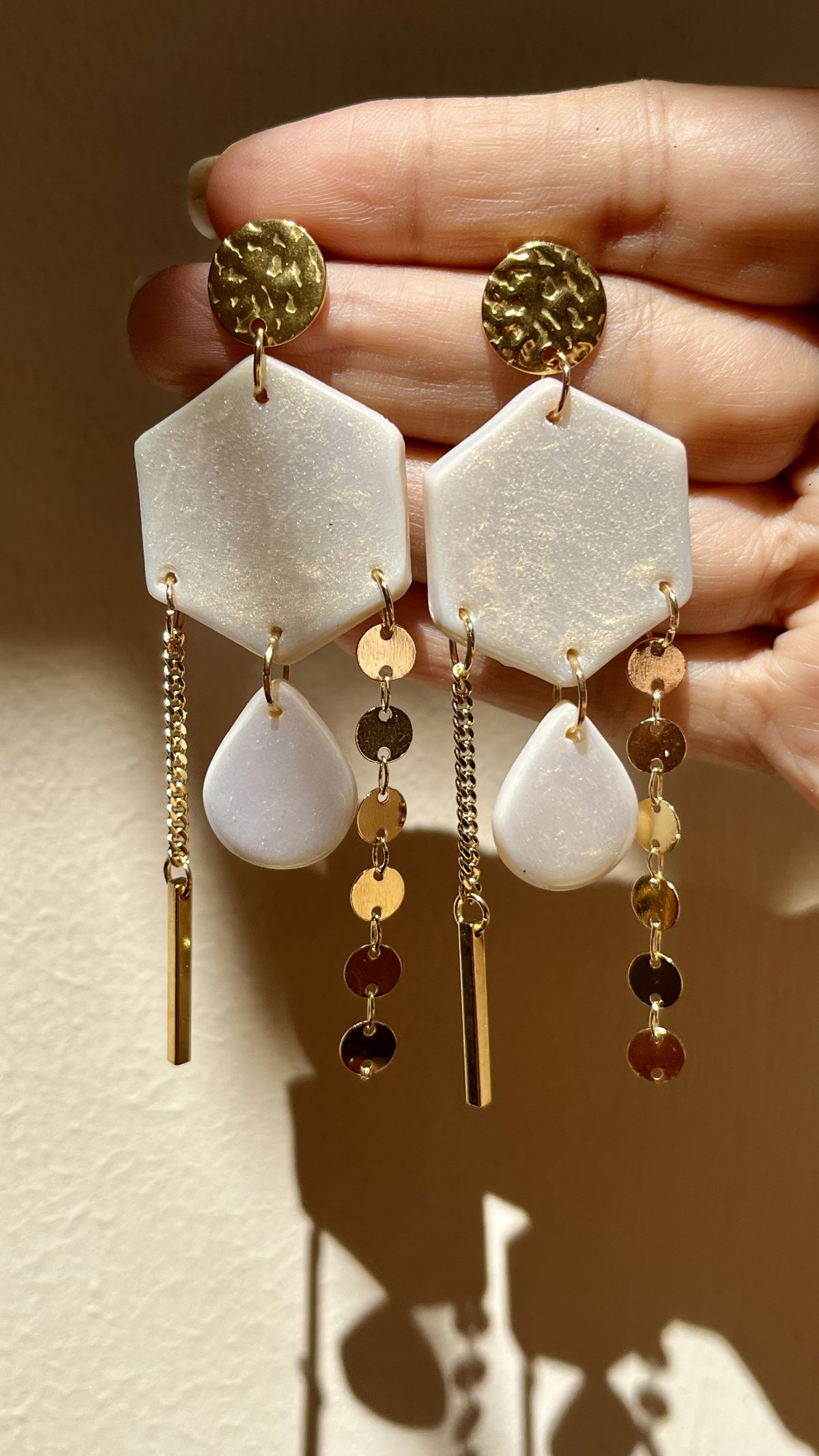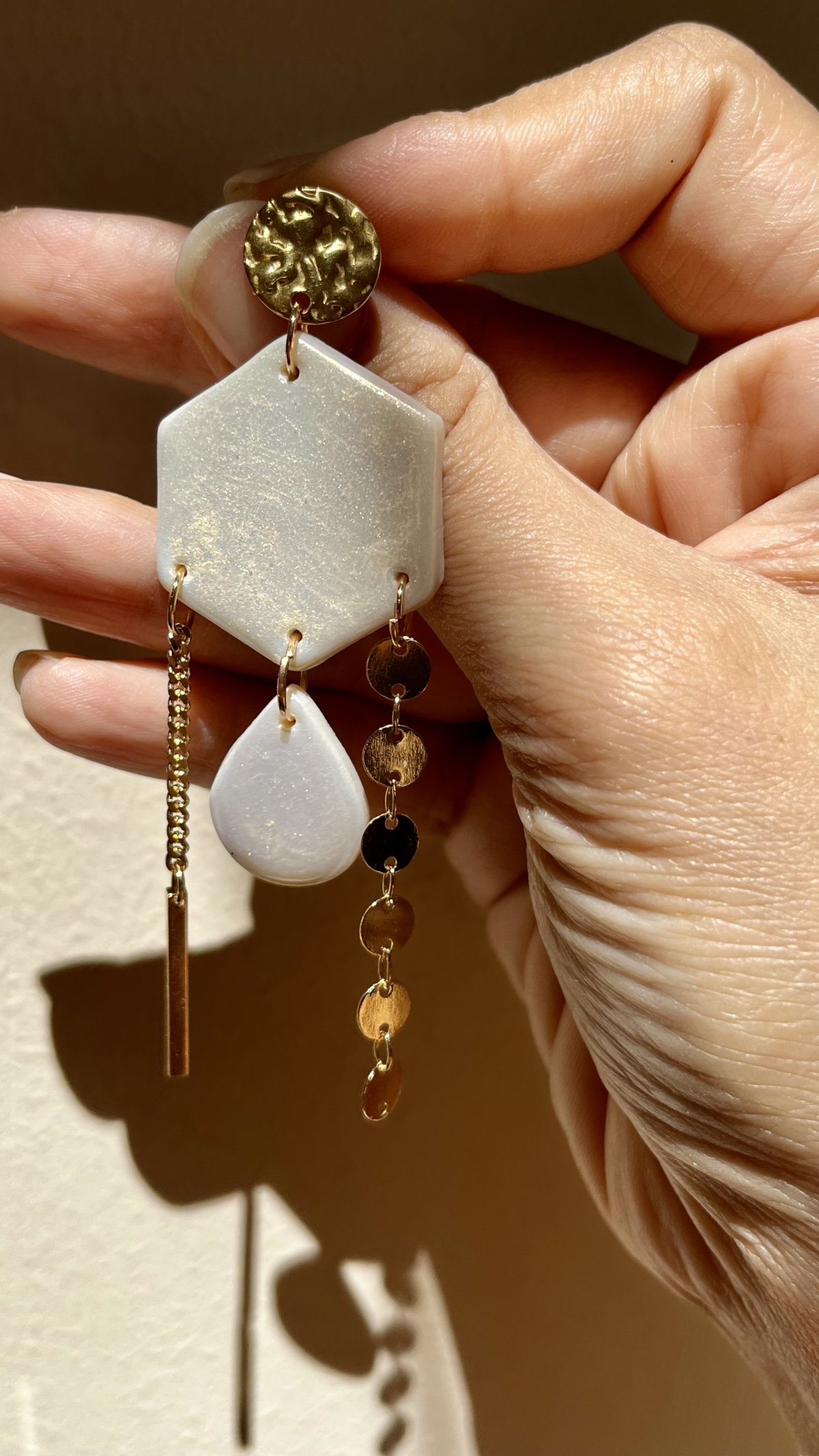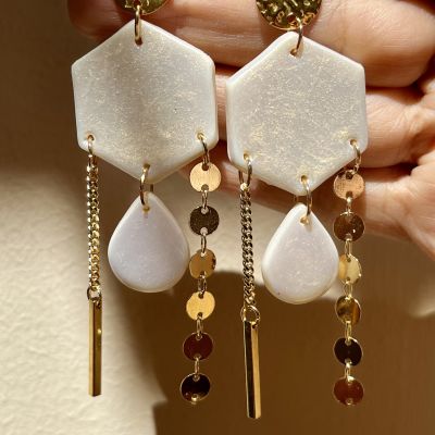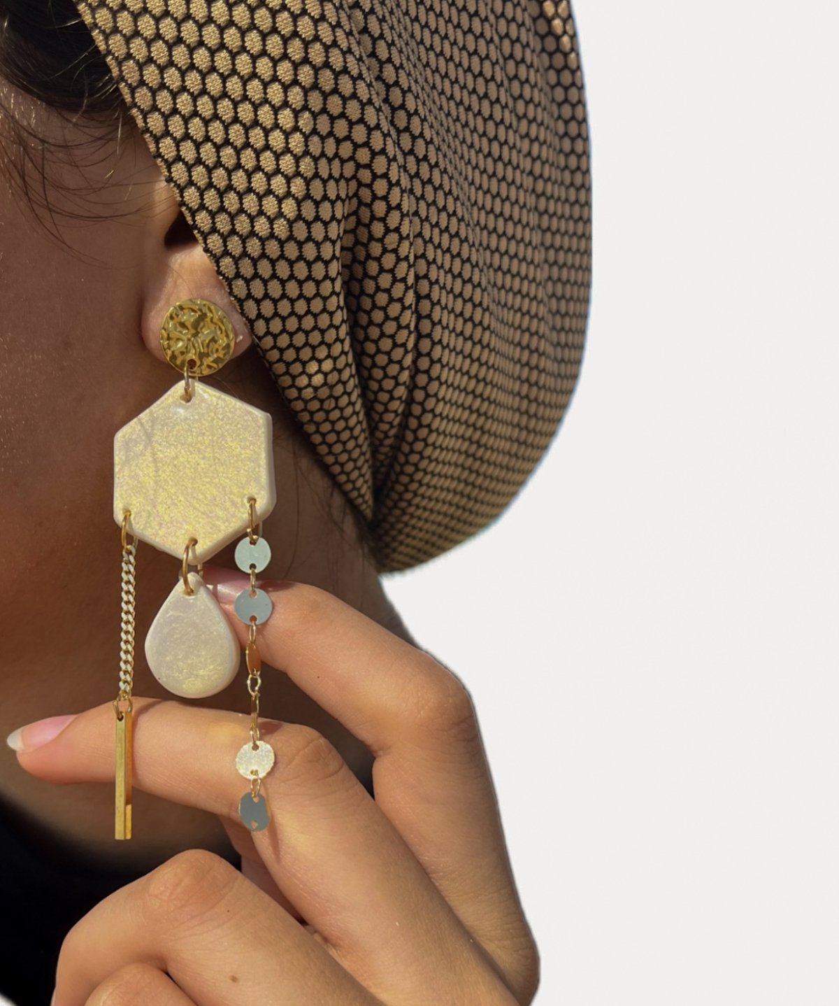 handmade from polymer clay covered with resin with a stainless steel studs , rust resistant and it doesn't cause allergies also with a yellow gold pieces ، very light weight