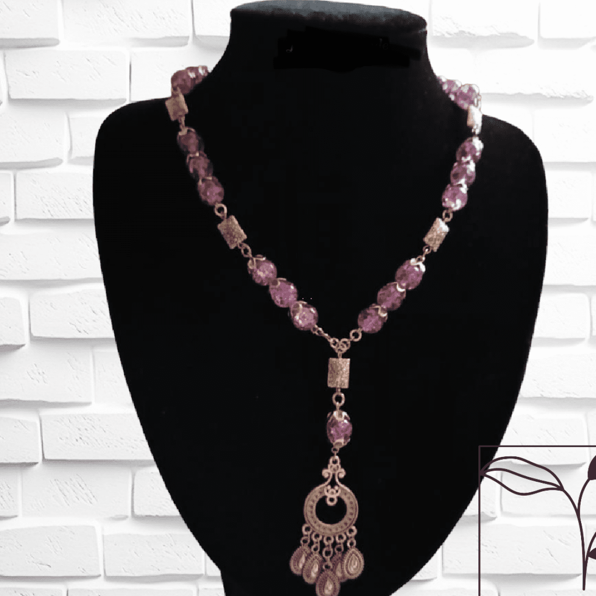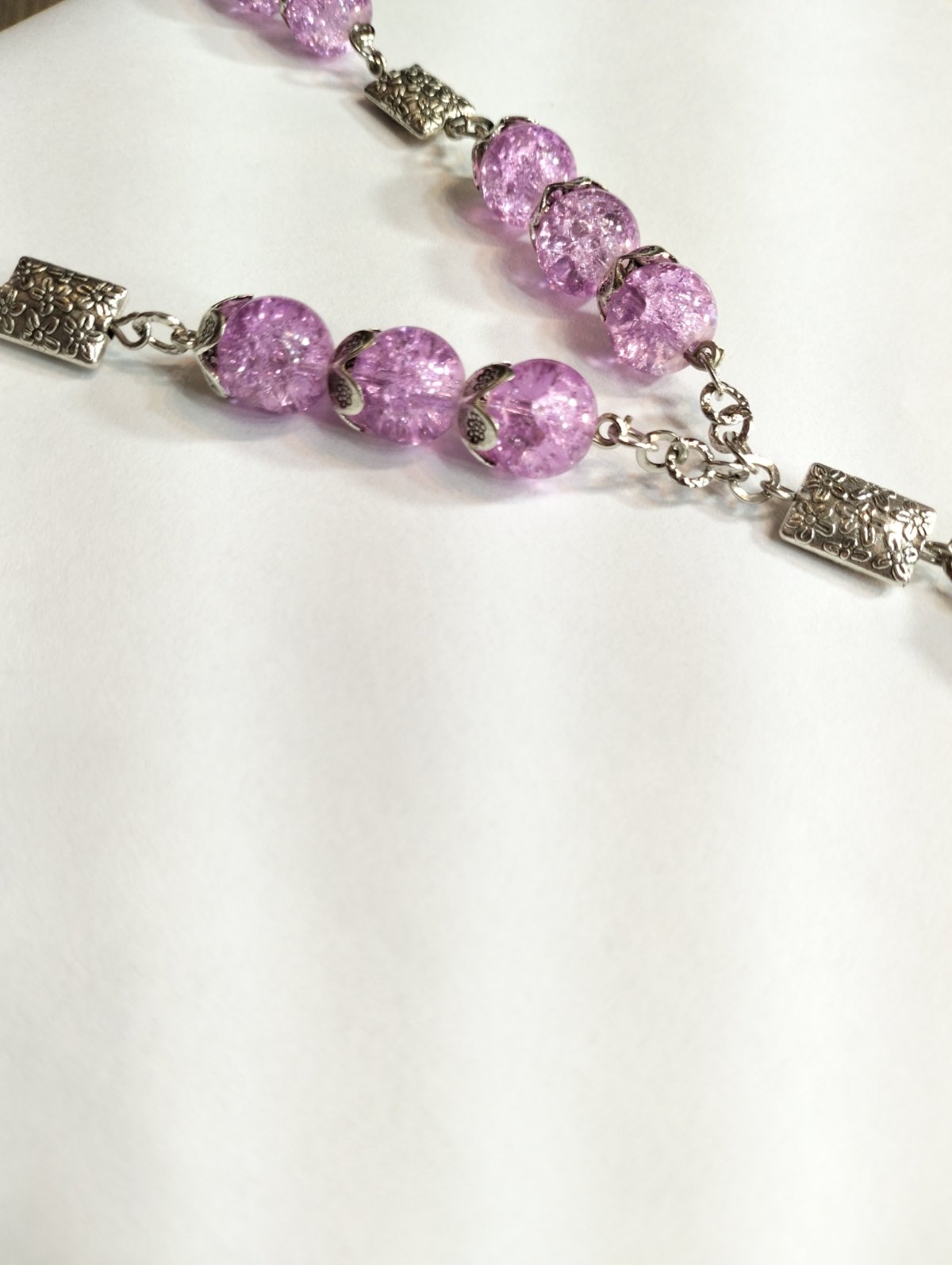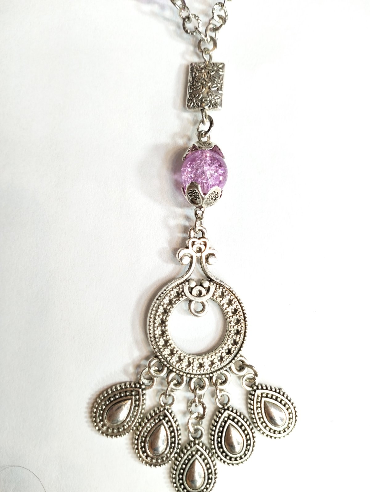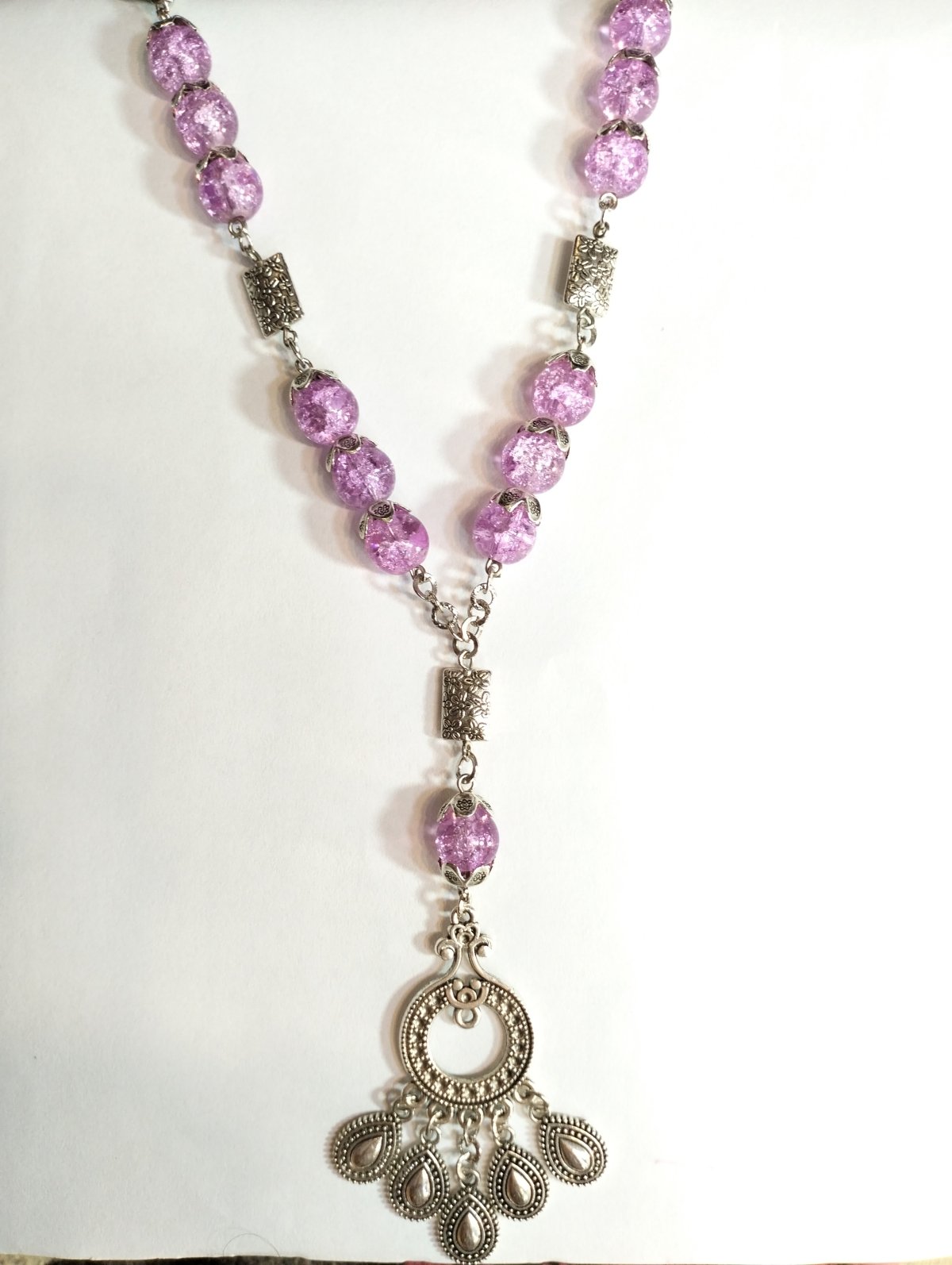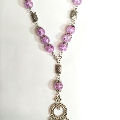 A necklace made of mauve alabaster stone, studded with silver spacers and a silver-colored metal compass, 42 cm long.