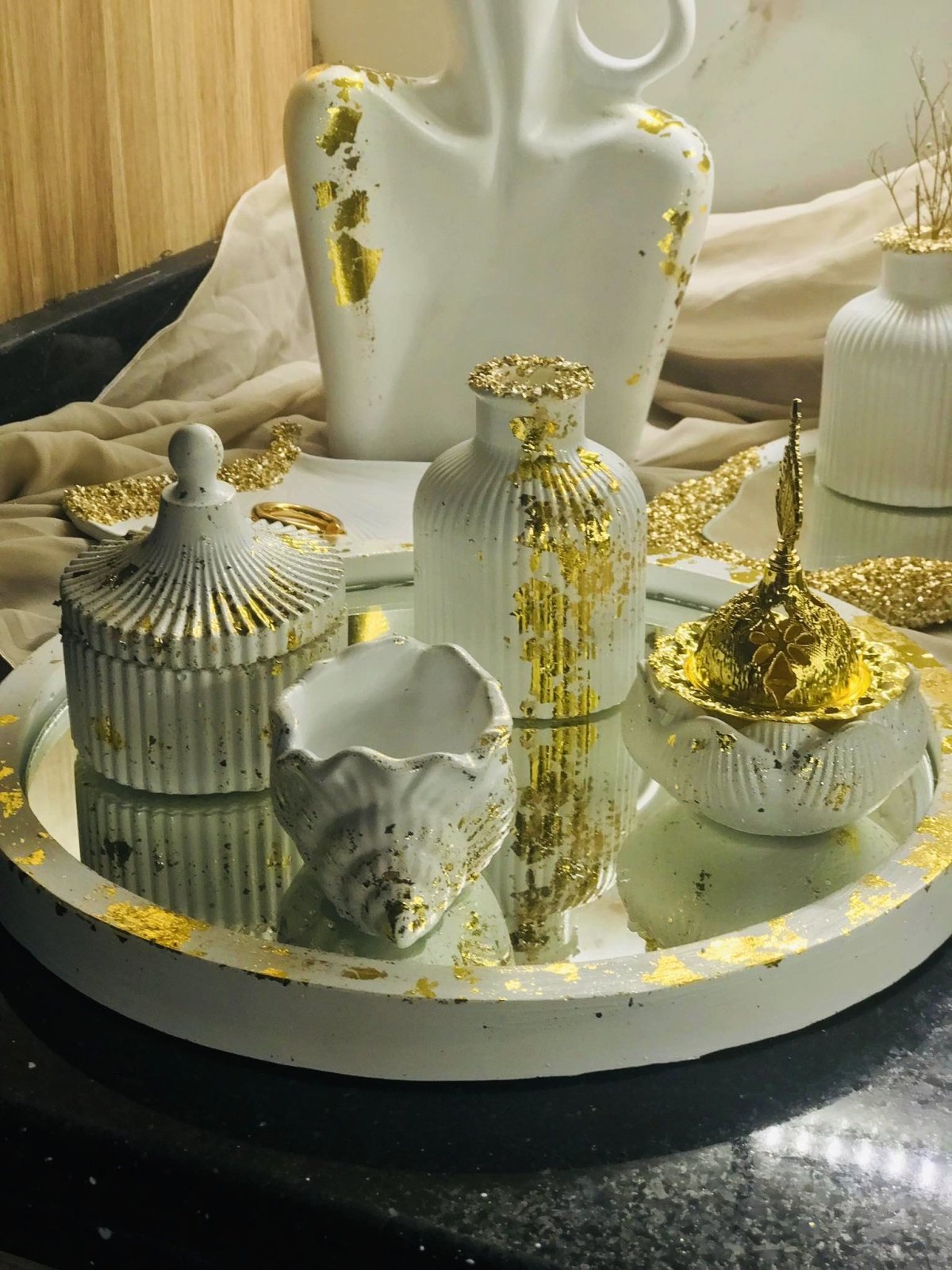 Set of 5 pieces of concrete 30cm tray with mirror Incense burner with metal piece Shell Bonbonniere