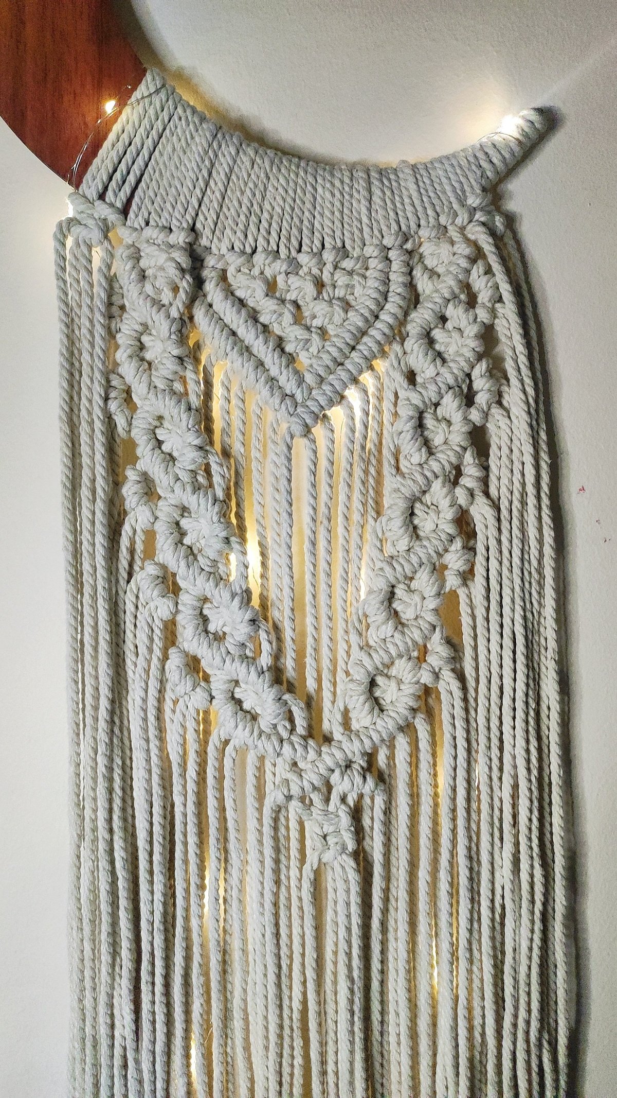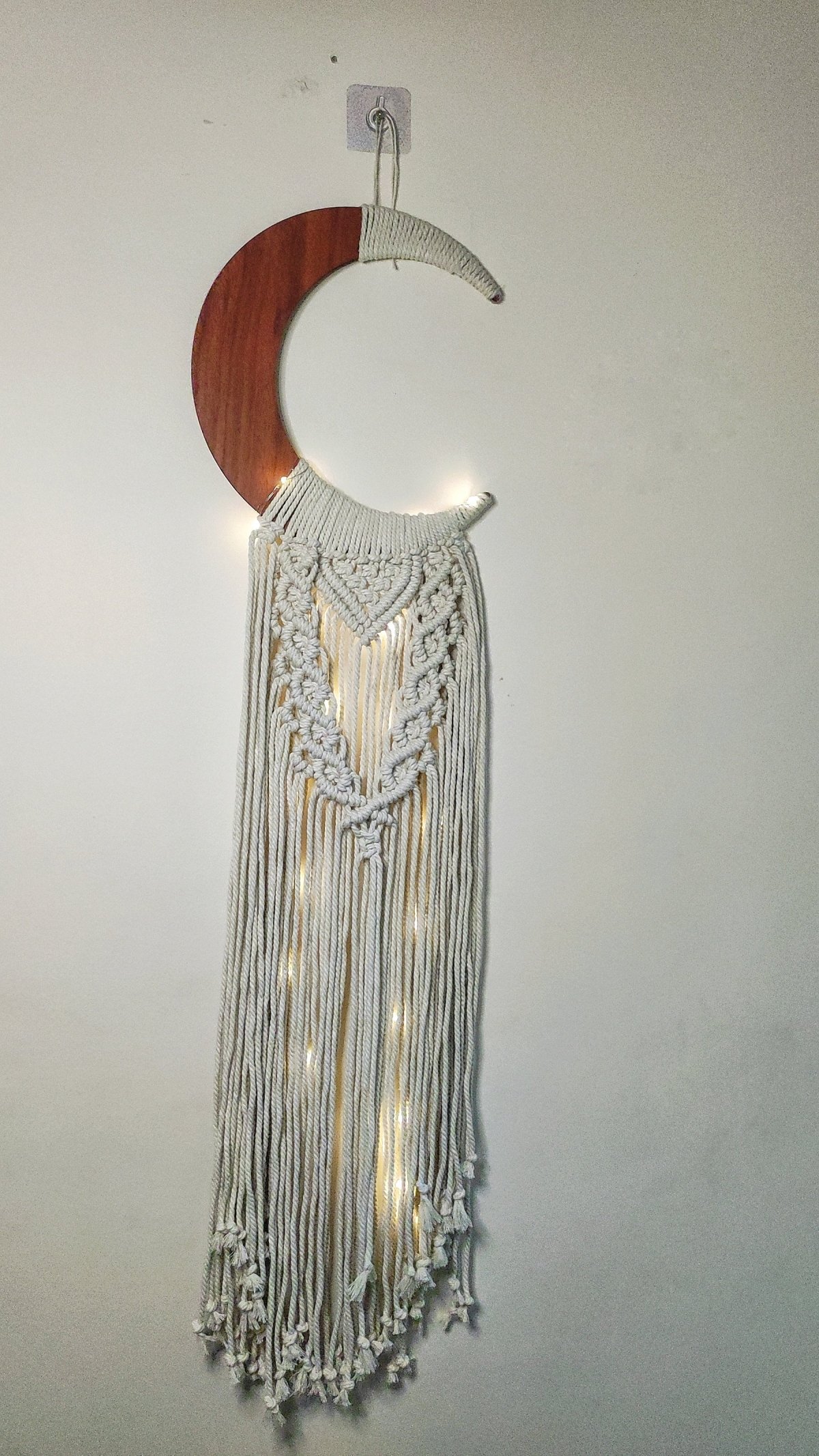 Wooden crescent moon with macrame work. Crescent size 30 cm Worked size 100 cm