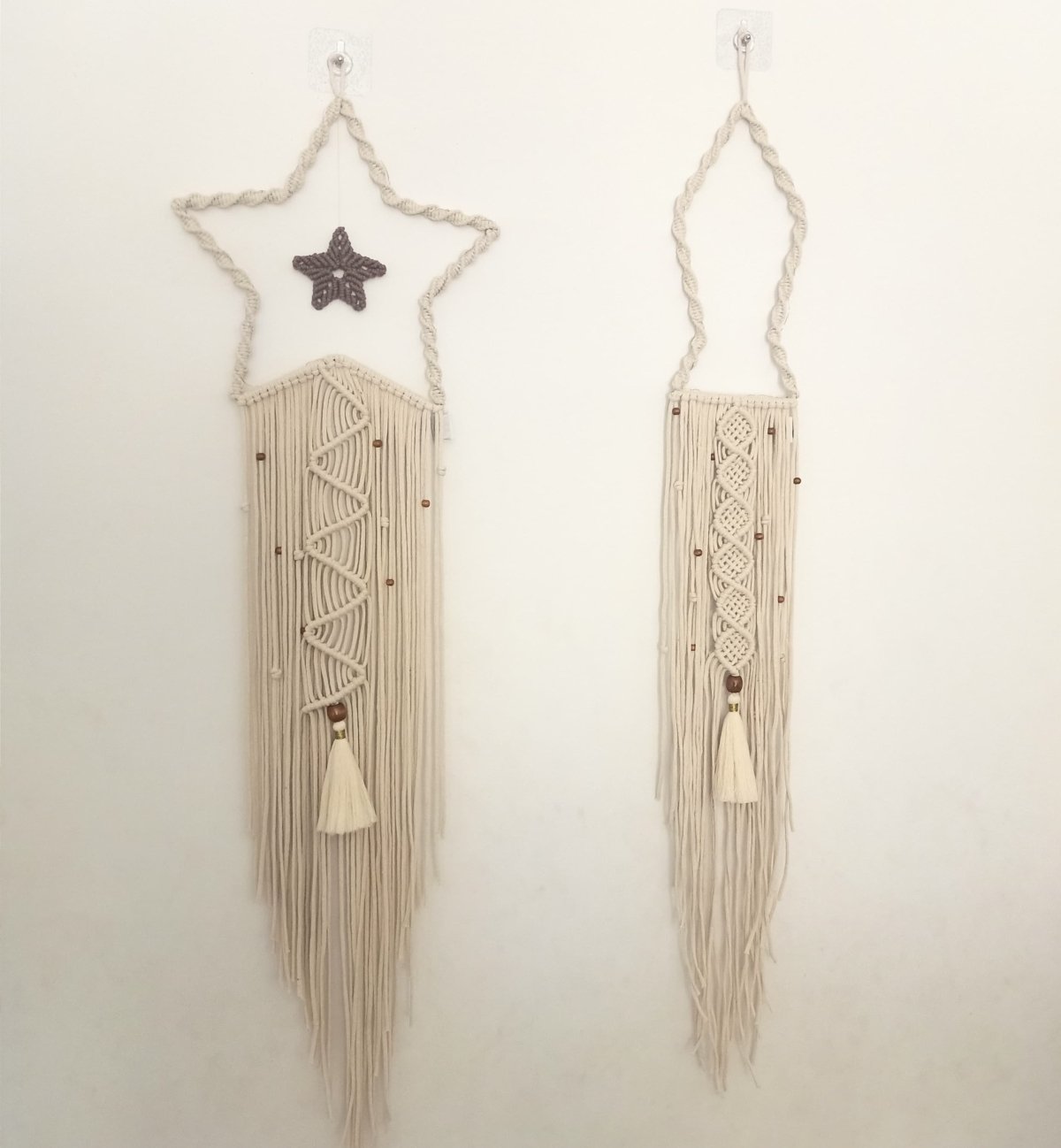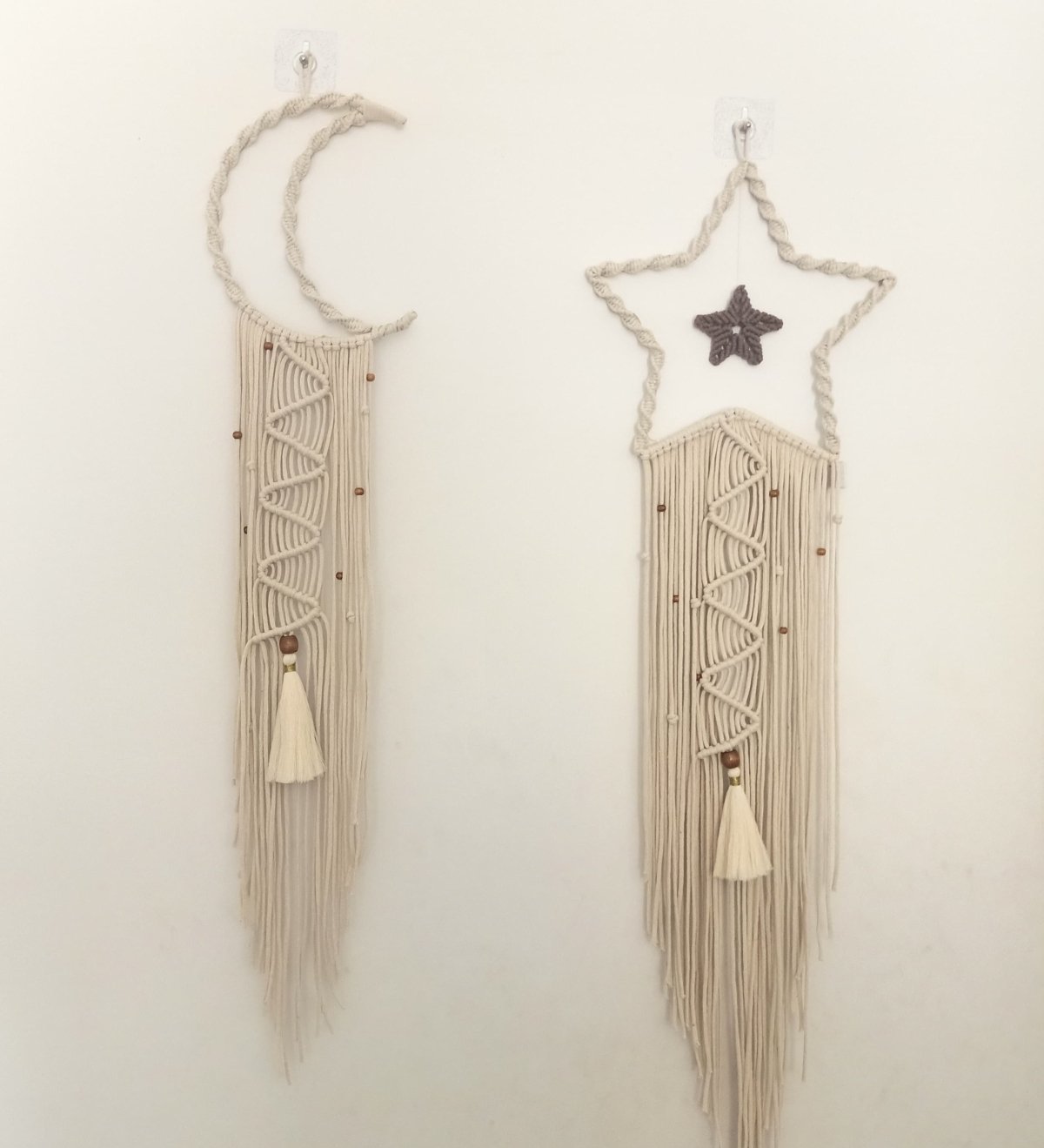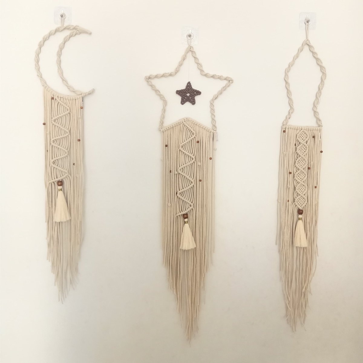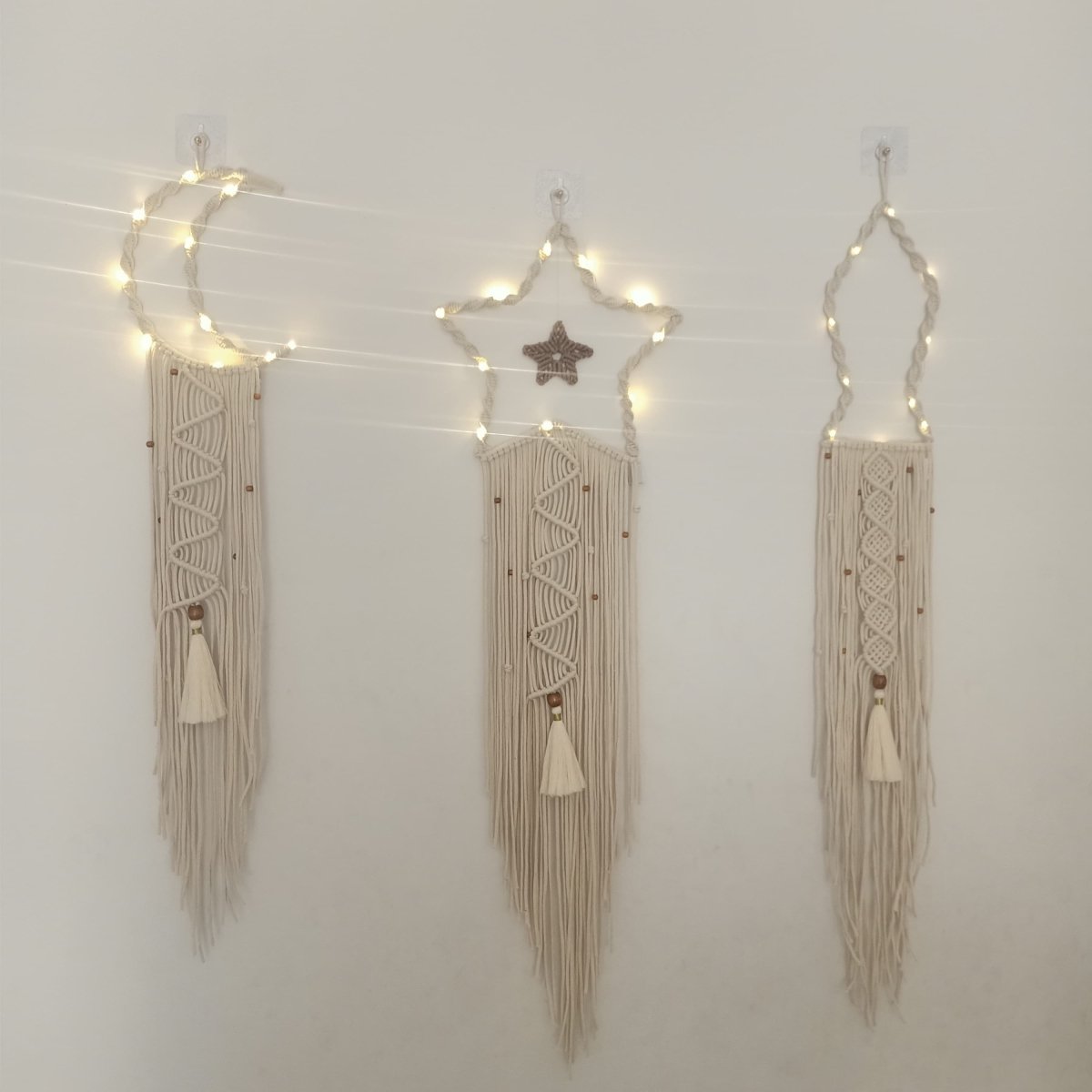 Macrame Ramadan set of star, crescent and Ramadan lantern of length 100 cm each… star width 30 cm, crescent width 20 cm and the lantern of 13 cm … contain small wooden beads and lighting Available each piece by itself
