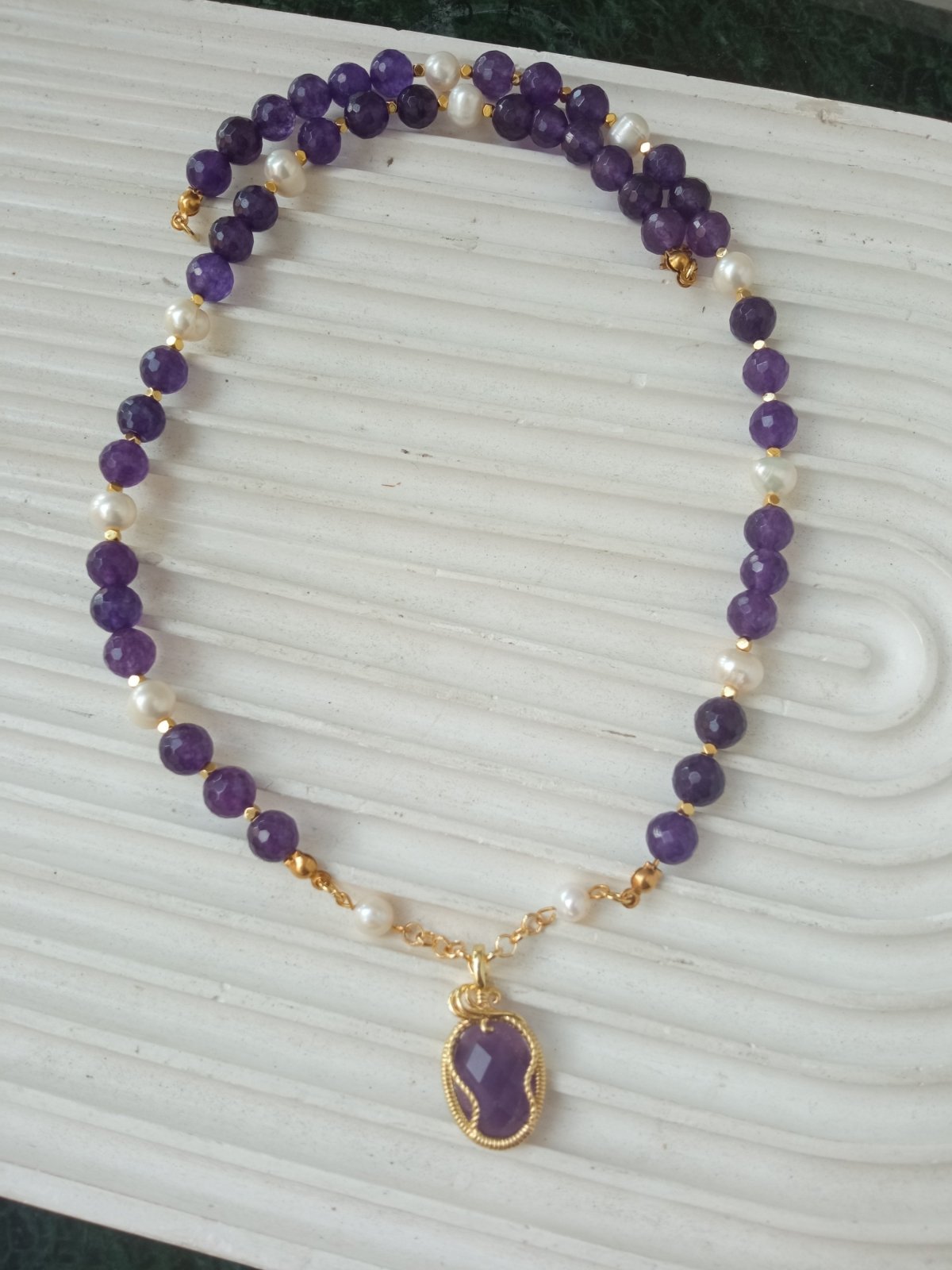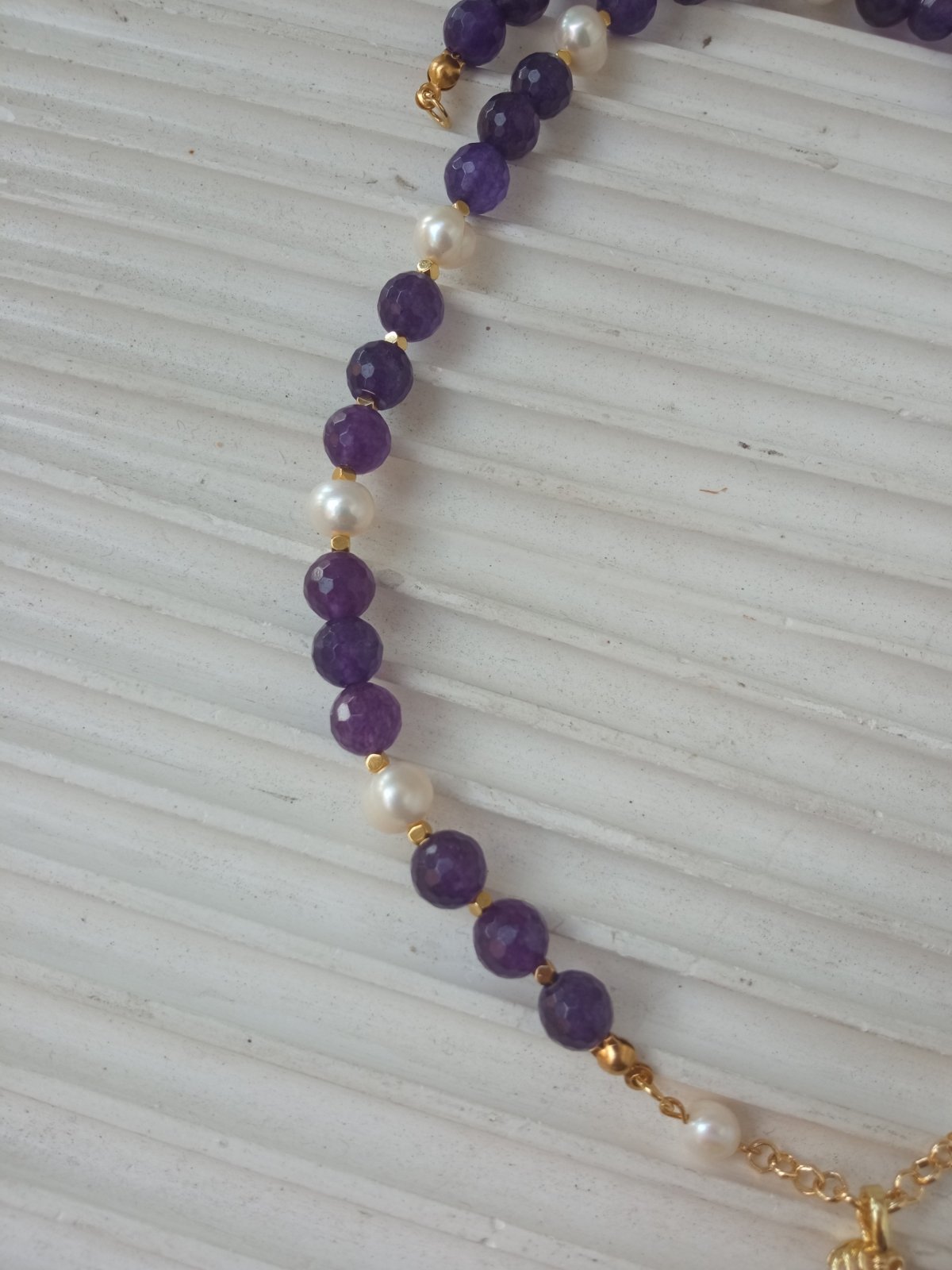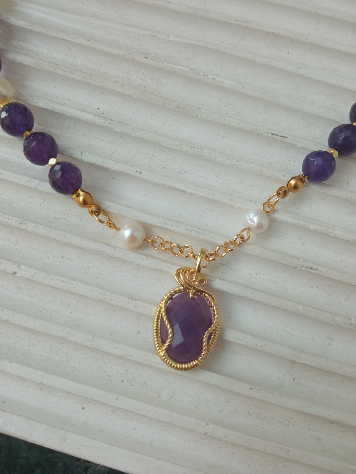 Agate necklace with natural pearls and Chinese gold spacers Necklace length is 61 cm