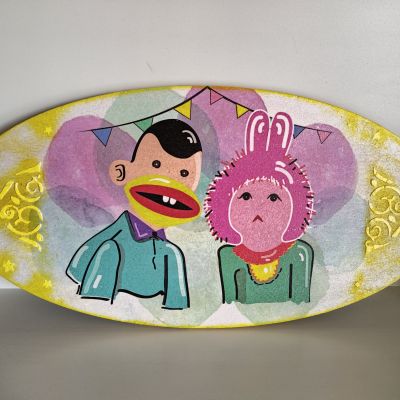 Wooden painting with a design of Bougy and Tamtam to decorate the house in the holy month of Ramadan
