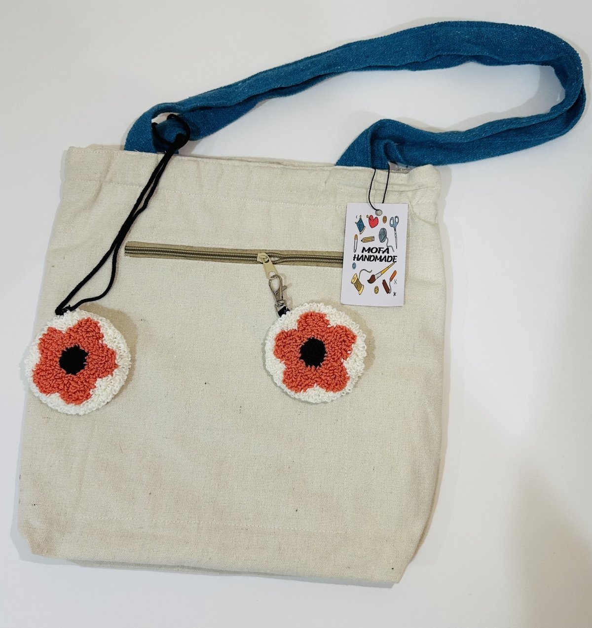 Fabric Tote Bag, size 35*40 , with a belt made of the same type of fabric, lined with fabric on the inside, and with internal pockets.