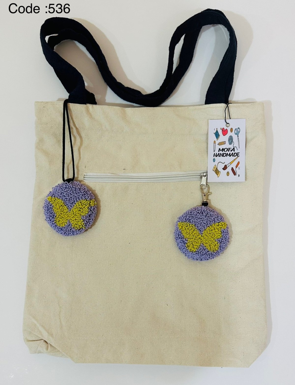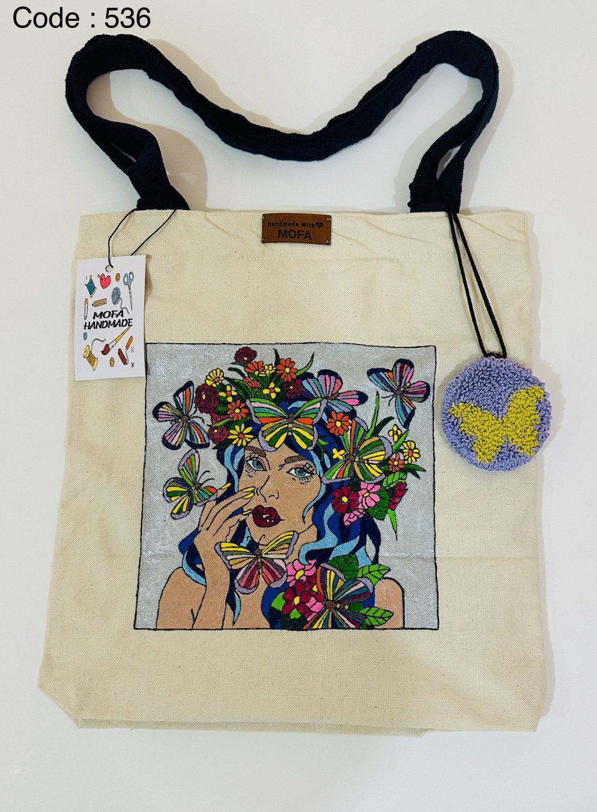 Fabric Tote Bag, size 35*40 , with a belt made of the same type of fabric, lined with fabric on the inside, and with internal pockets.
