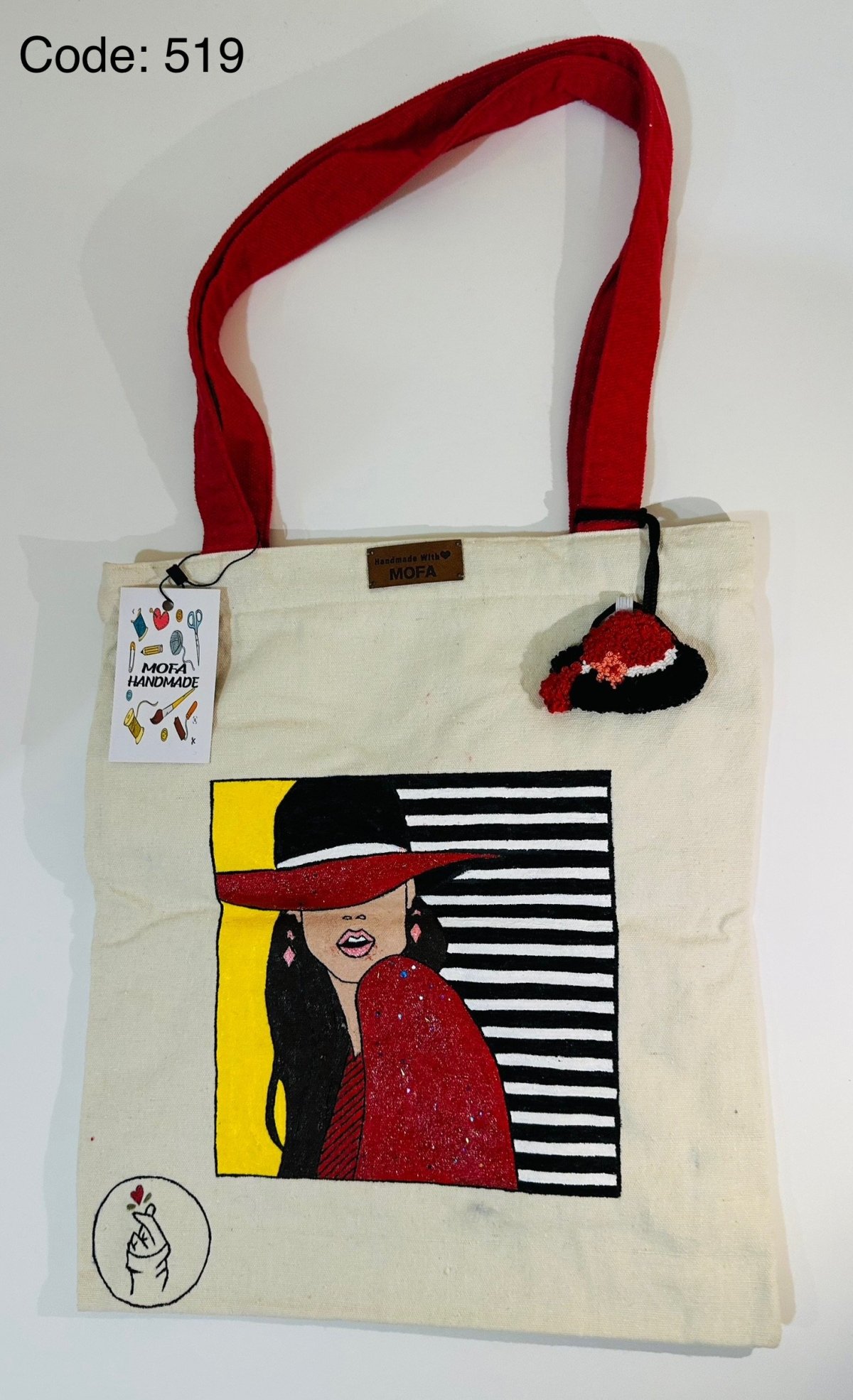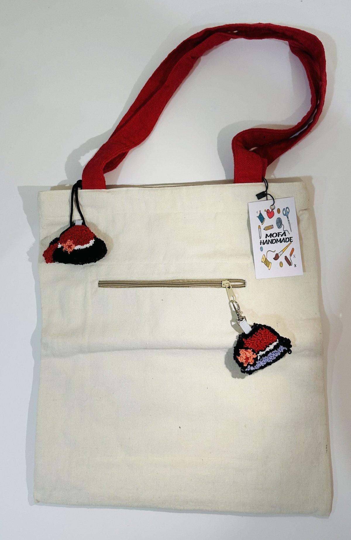 Fabric Tote Bag, size 35*40 , with a belt made of the same type of fabric, lined with fabric on the inside, and with internal pockets.
