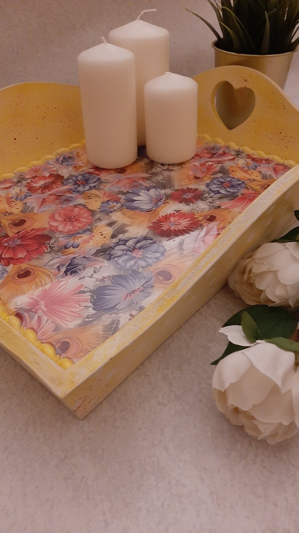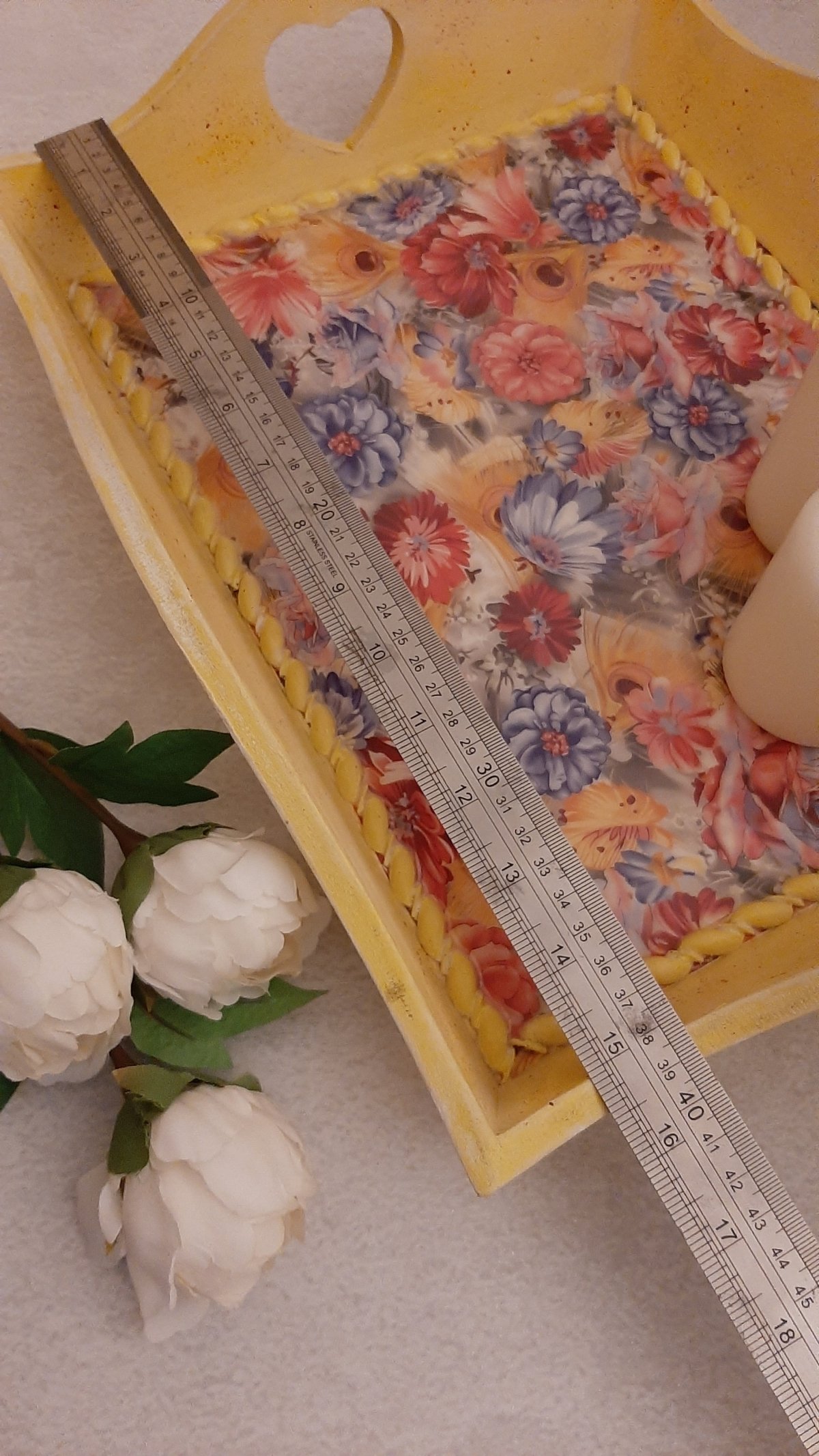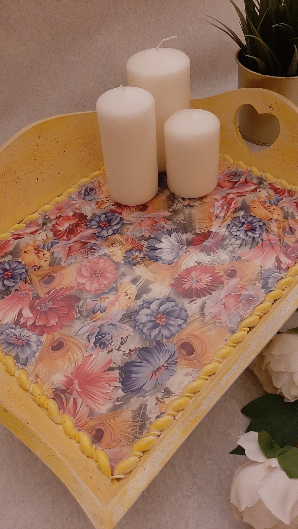 Decoupage MDF wood tray Rectangular Size 30*39 cm Yellow color, 100% handmade. With a waterproof protection layer With a transparent epoxy protection layer