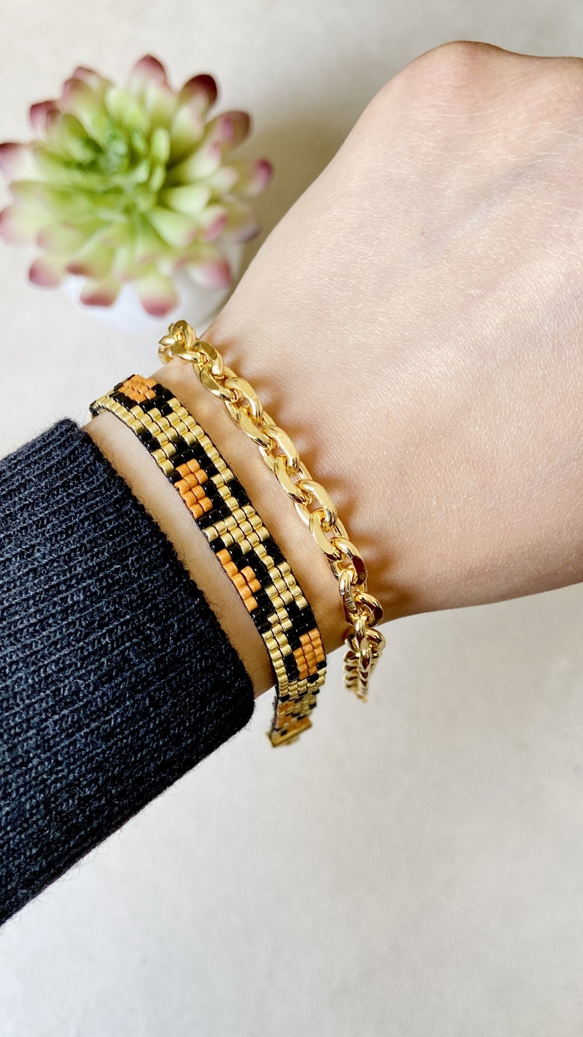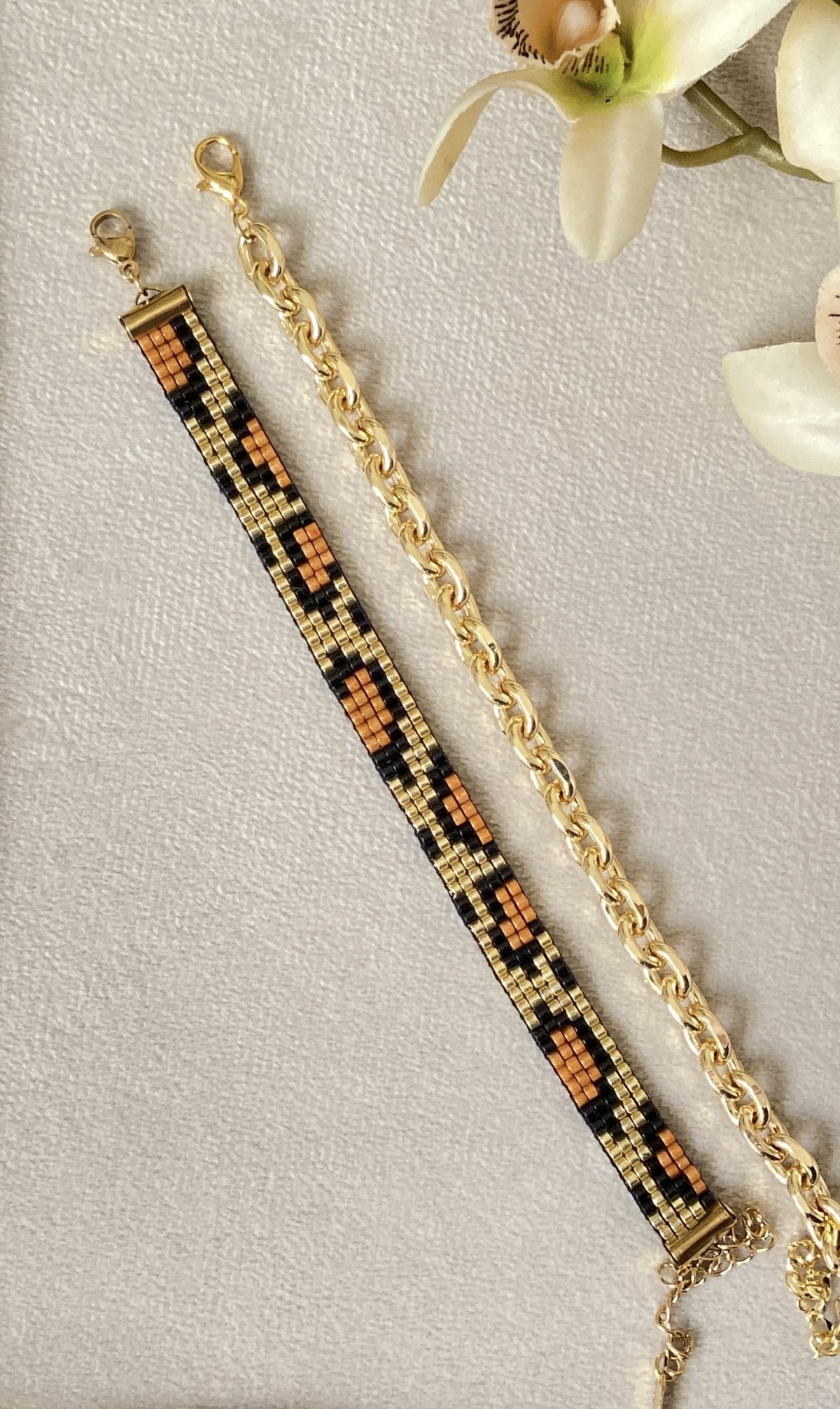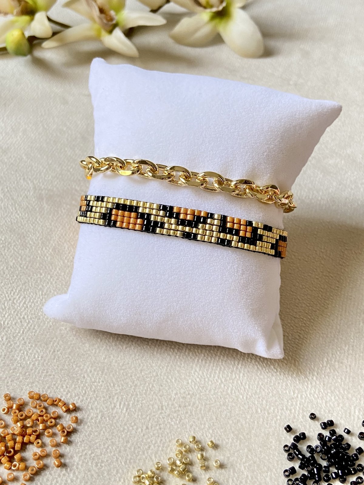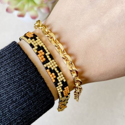 * Handmade Beaded Bracelets Set with Miyuki Beads * Set includes: 1 handmade bracelet + 1 Chinese gold bracelet * Bracelets Length : 20 cm * 1 cm width * Keep them away from perfumes , creams and other chemicals to stay in perfect condition