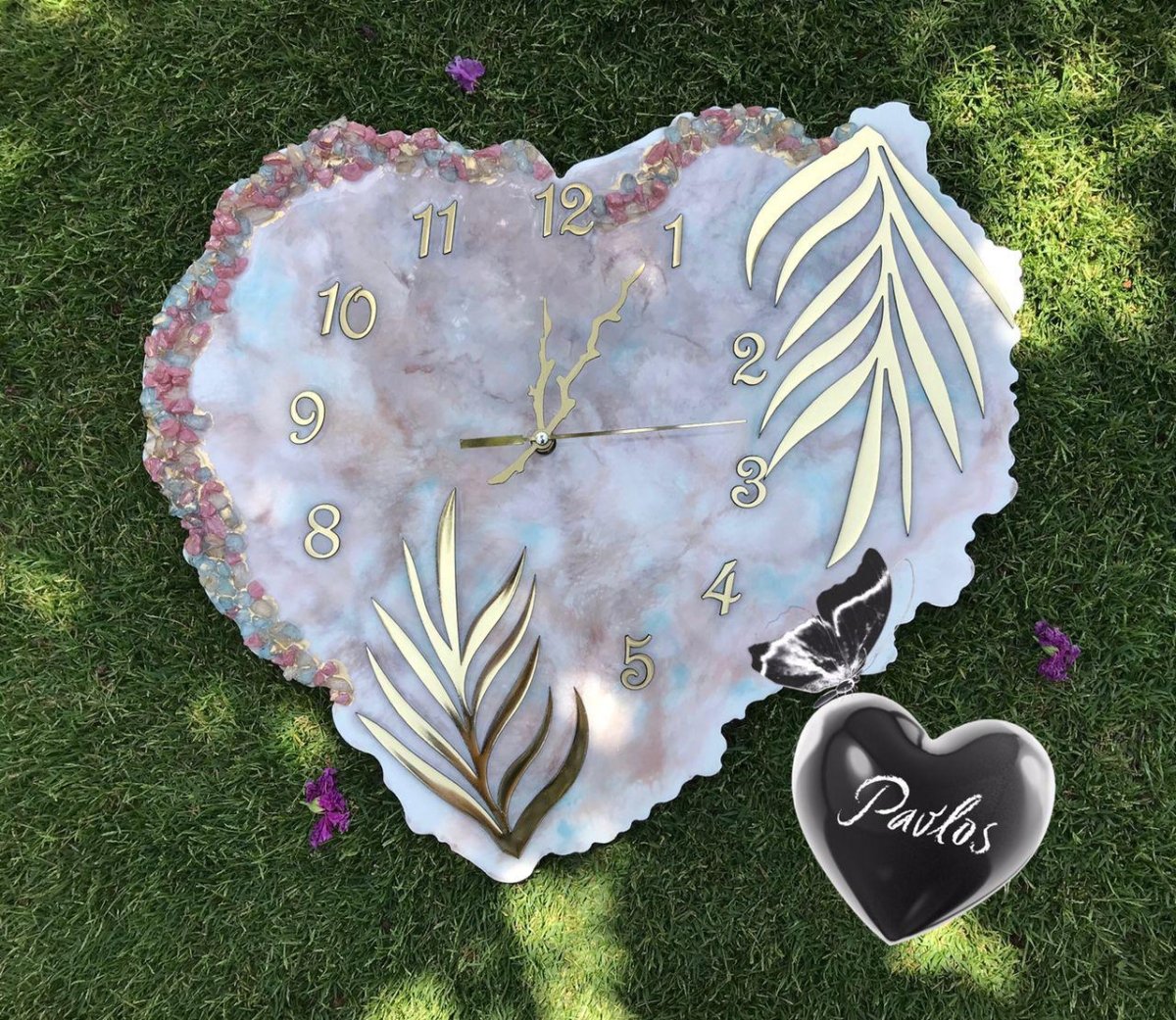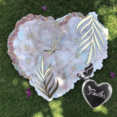Resin wall clock size: 60cm Body: wooden Colors: off-white, beige & turquoise shades decorated with stones Additions: 2 golden acrylic pieces (leaf shaped) + golden acrylic numbers Hands: golden acrylic Clock machine: made in Taiwan