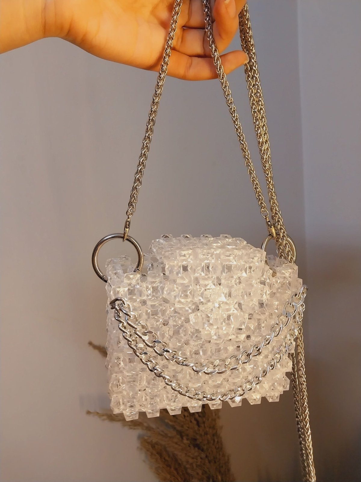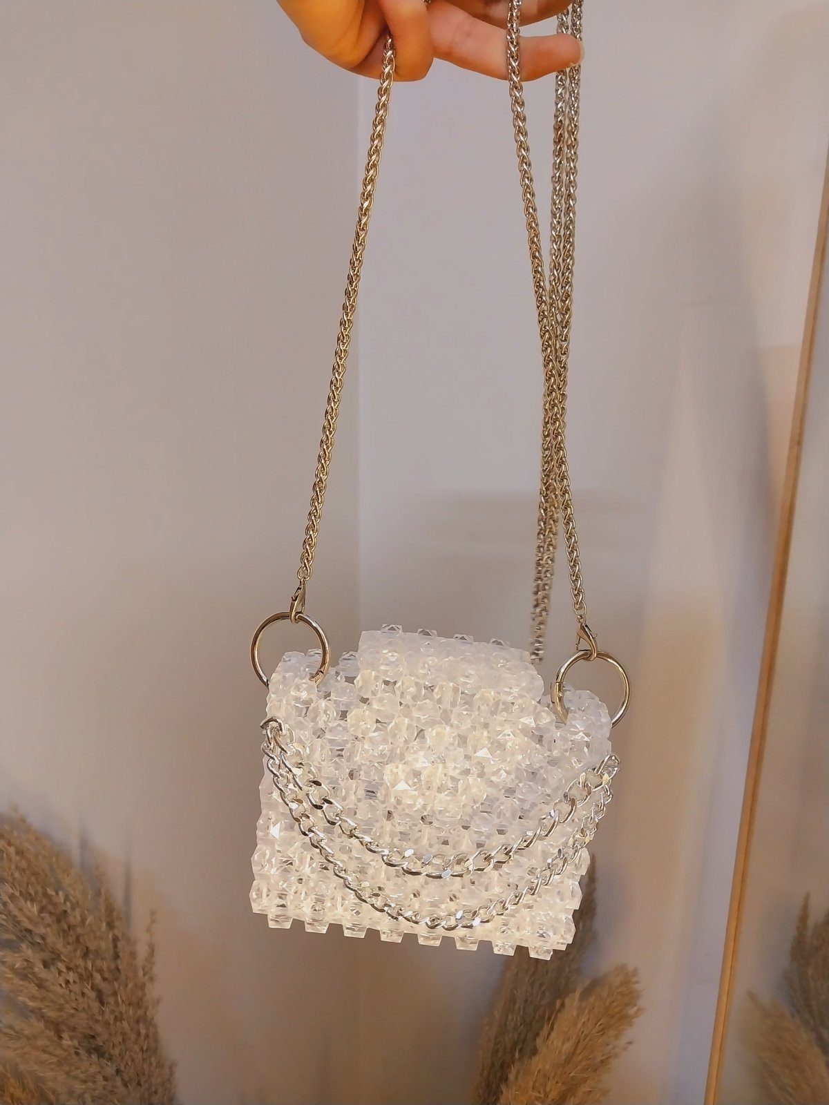 White bag encrusted with metal chains. Dimensions: - Width: 12 cm - Height: 10 cm - Depth: 5 cm