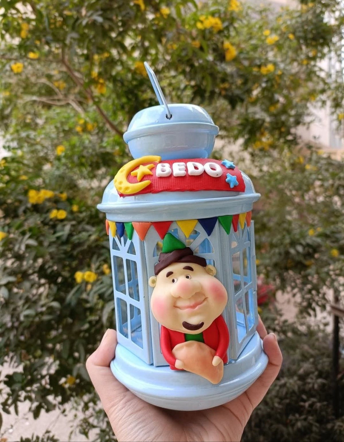 A baby blue-colored lantern with glass panels and a Fananis figure on it, some Ramadan decorations, a crescent moon, and stars.