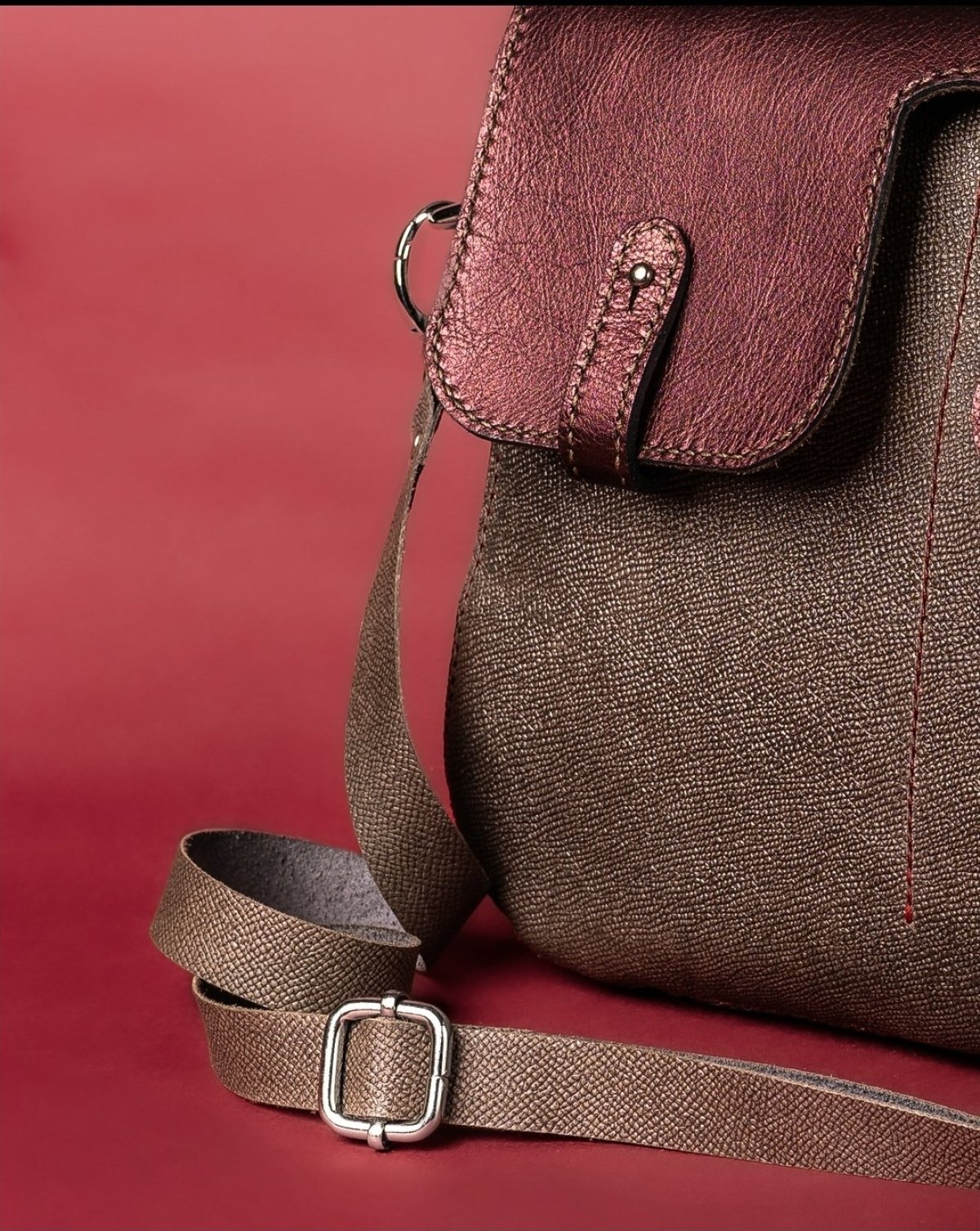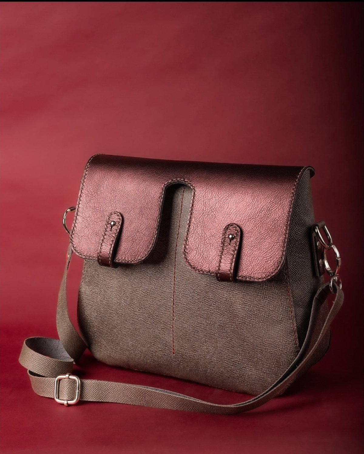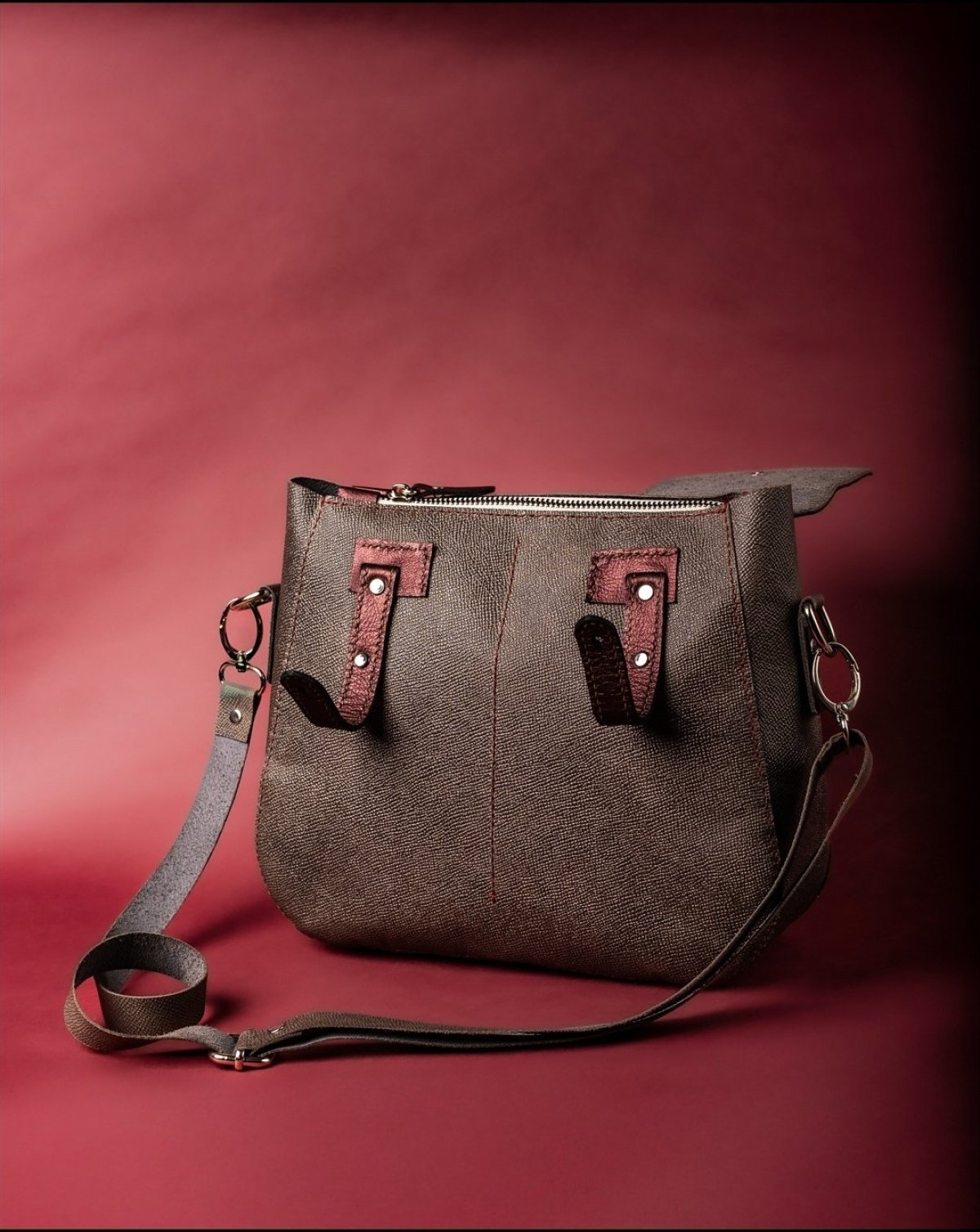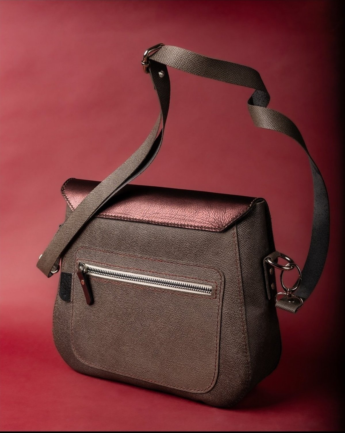 Genuine leather handmade cross bag with metallic colour and gray. Made of cow and buffalo leather. 27cm width, 23cm height and from 7cm to 9cm depth. Not lined. Has back zipper pocket. Has long strap.