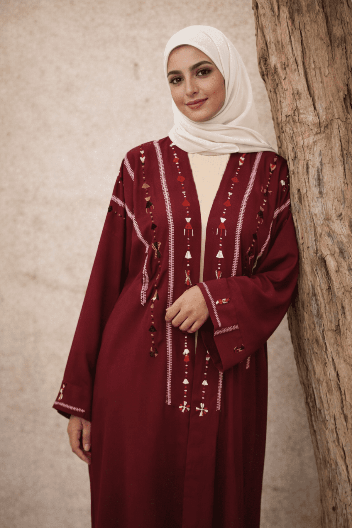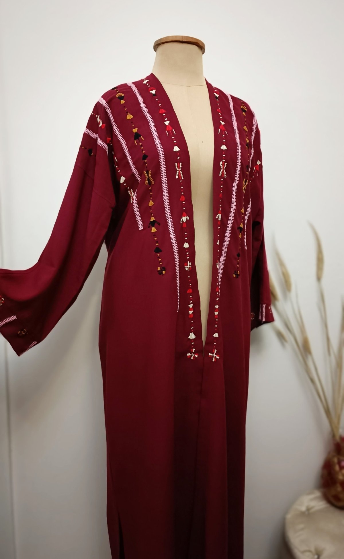 Linen Kaftan, hand embroidery by Siwa oasis women. Inspired from Siwa heritage. Burgendy color. Free size match L-XL. L144 cm,W 70 cm.