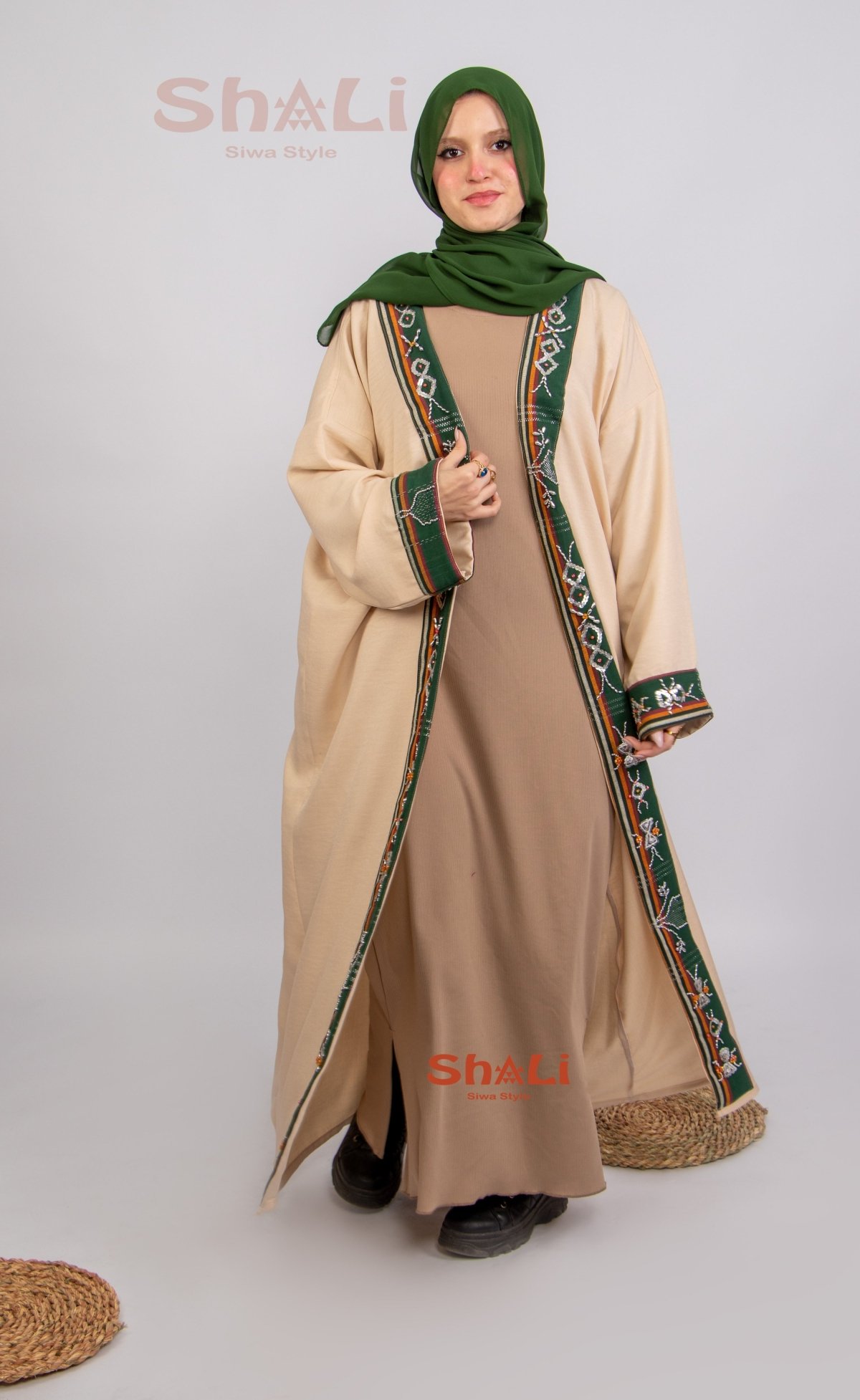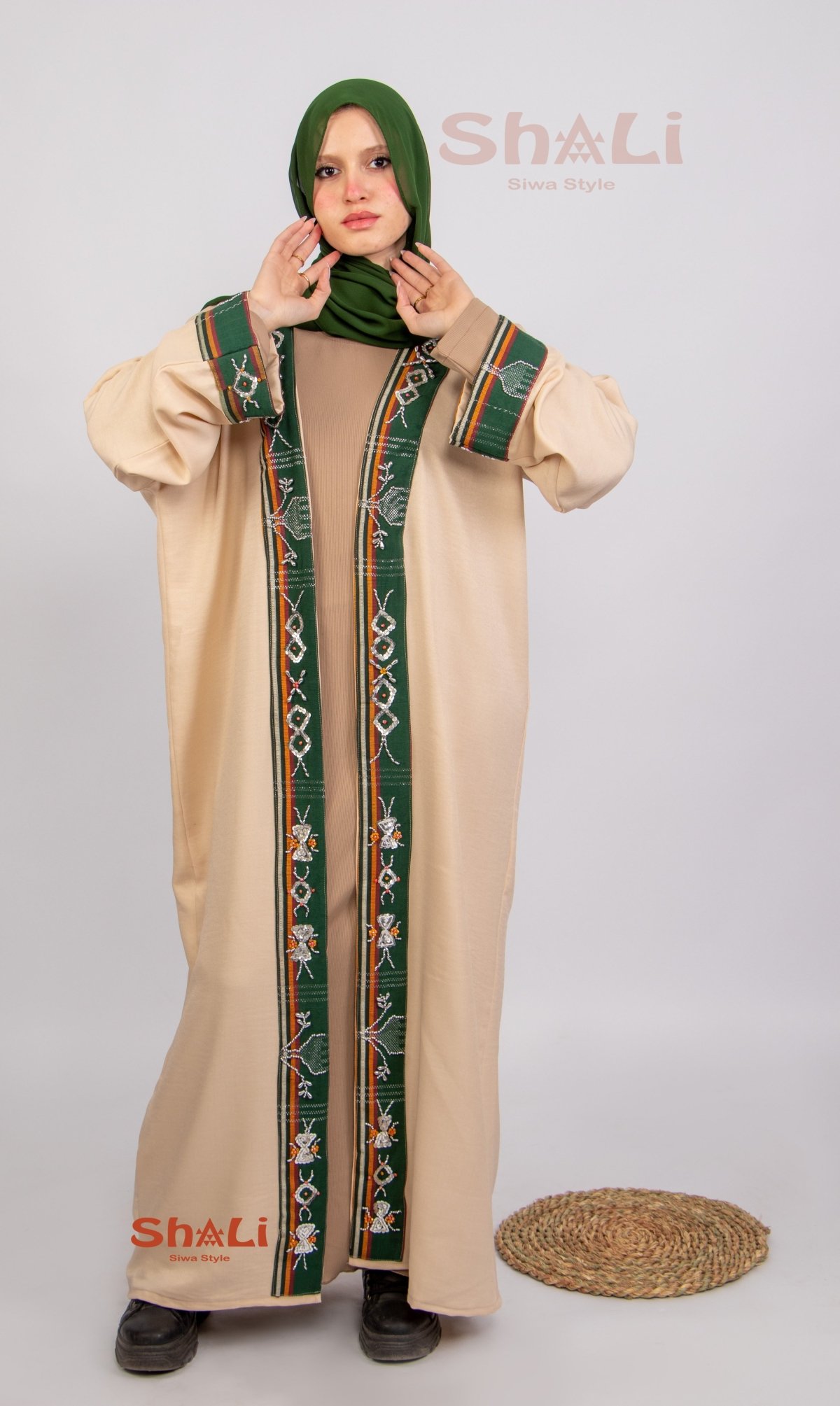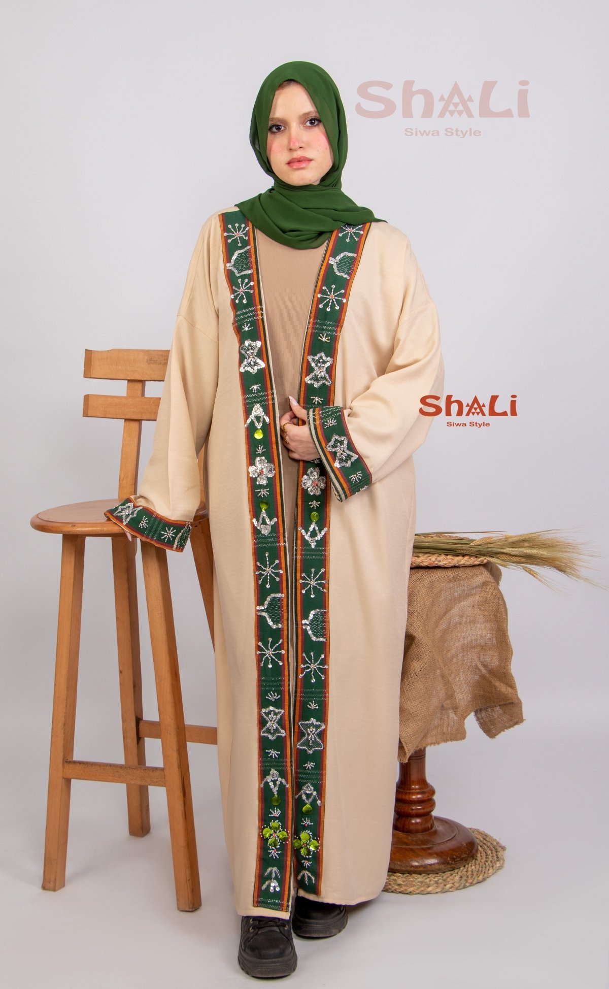 Oriental Abaya with distinctive hand embroidery from Siwa Oasis. Inspired by the bride's veil from Siwa Oasis, which is almost disappearing, and executed with skill by the hands of its ladies. Luxurious embroidery with beads and sequins on strips of bridal veil fabric woven on a hand loom. A very valuable heritage piece, suitable for evening parties and occasions. Material: Soft linen. Size: Free size. Dry clean.
