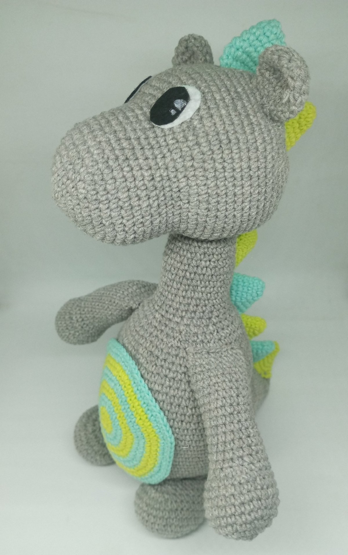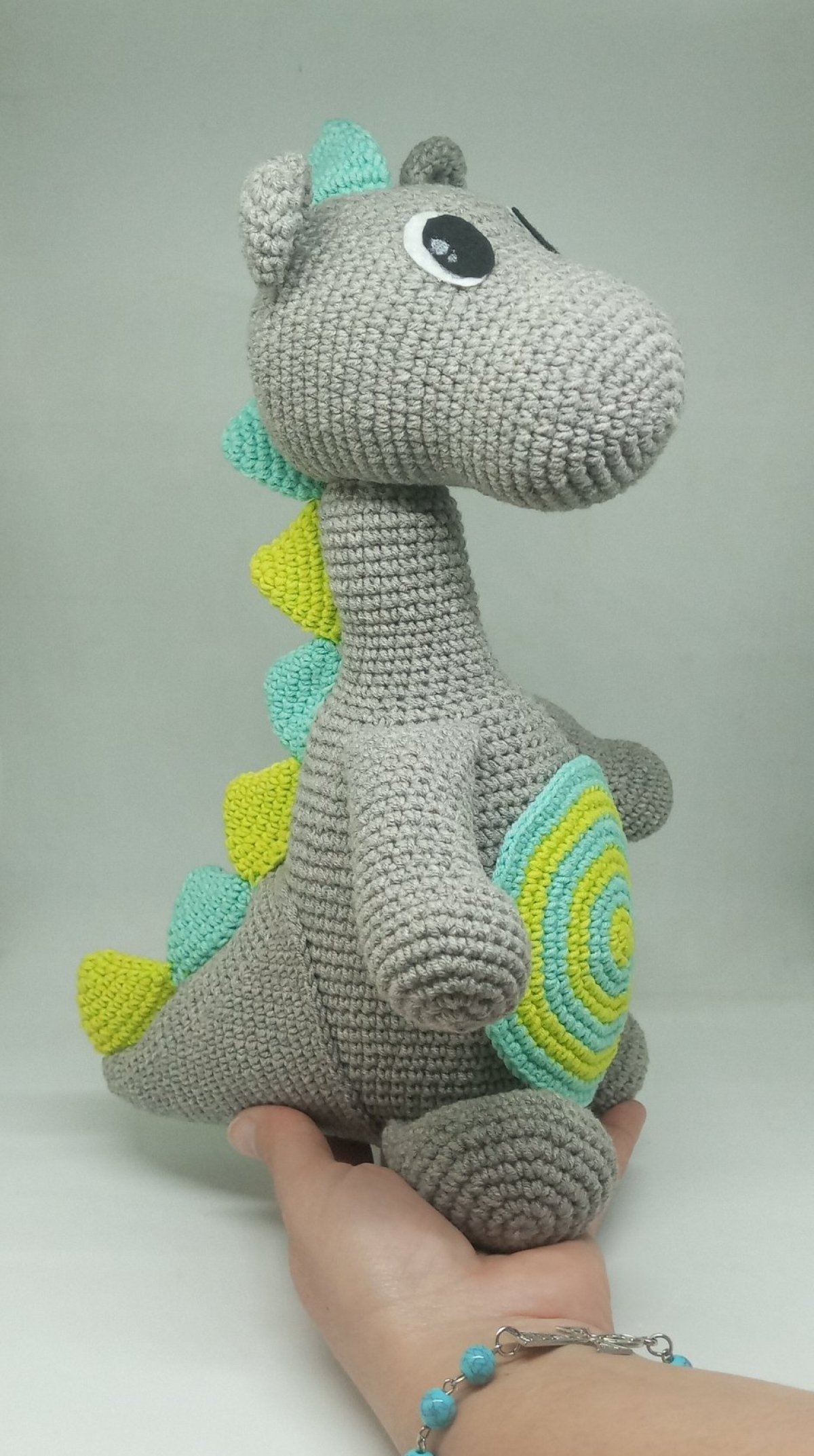 Dingo, an amigurumi dinosaur, made of Turkish cotton yarn and stuffed with fiber. Its length is approximately 33 cm.