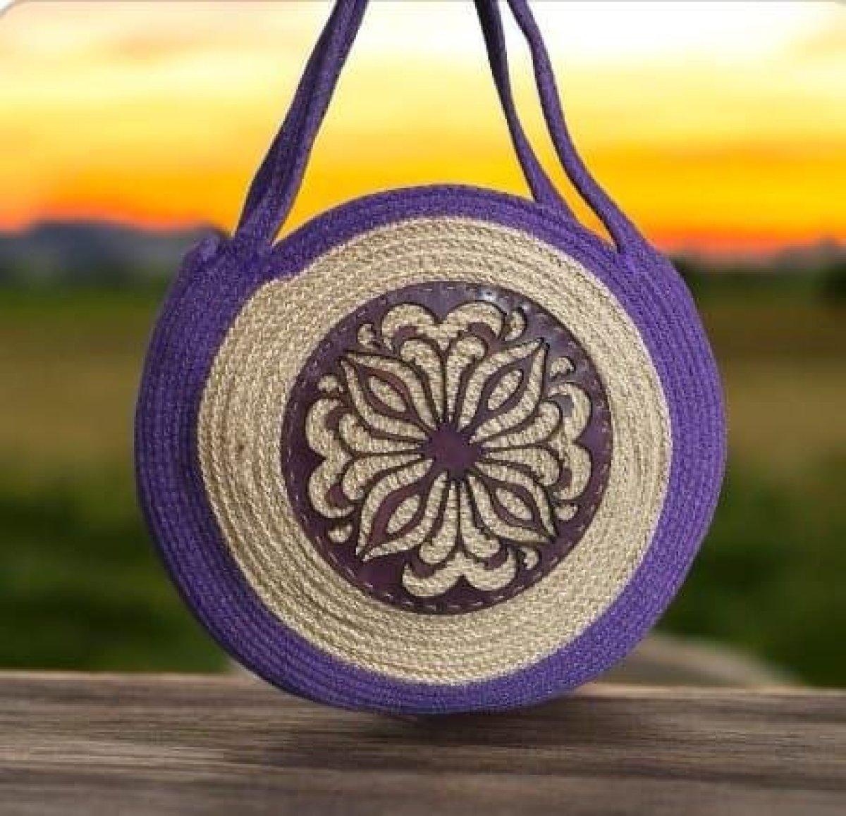 Violet Flower Bag A perfect blend of jute and cotton ropes combined with genuine leather. Handmade with 100% craftsmanship. The leather is cut manually, not by laser, and made with love to reach you with all affection. Bag diameter: 33 cm (length 33 cm, width 33 cm).