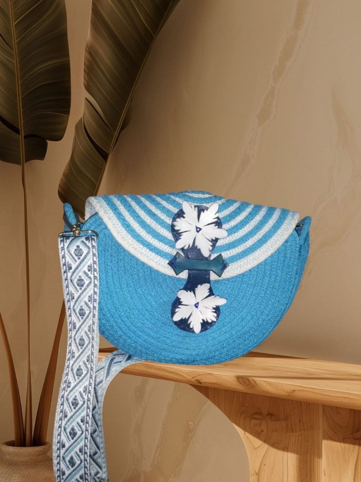 Gardenia Bag A beautiful blend of pure cotton ropes and genuine leather. Handmade with 100% craftsmanship, lightweight, and large in size. Made with love to reach you with all affection. Width: 28 cm, Length: 21 cm.