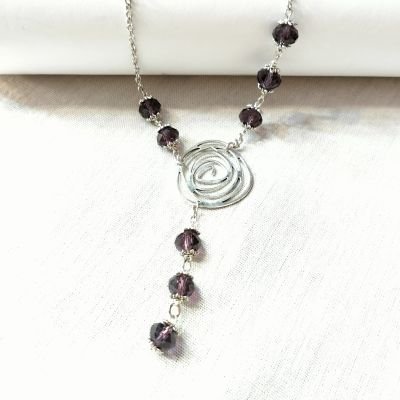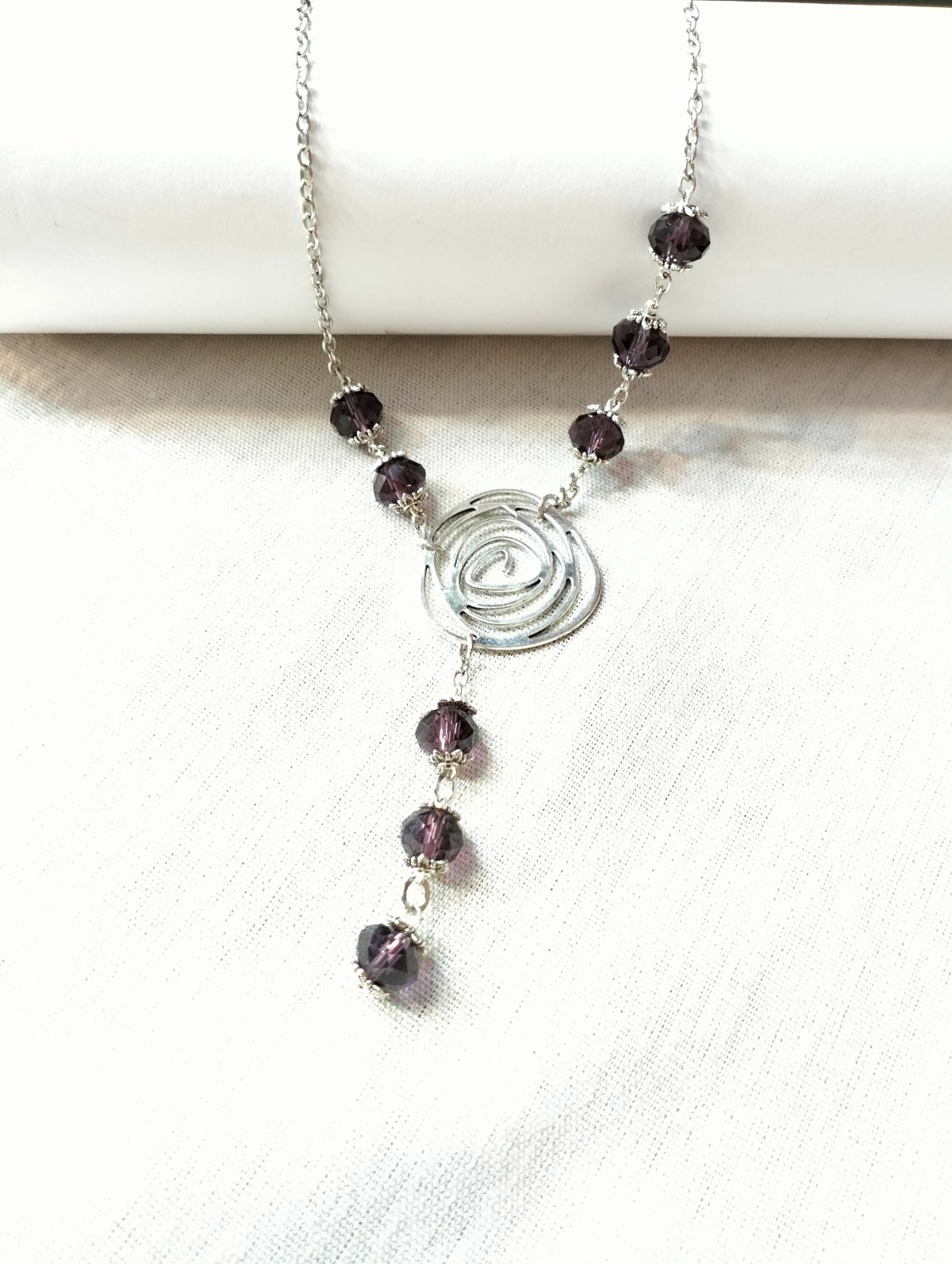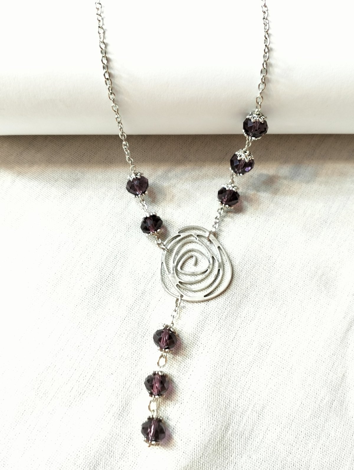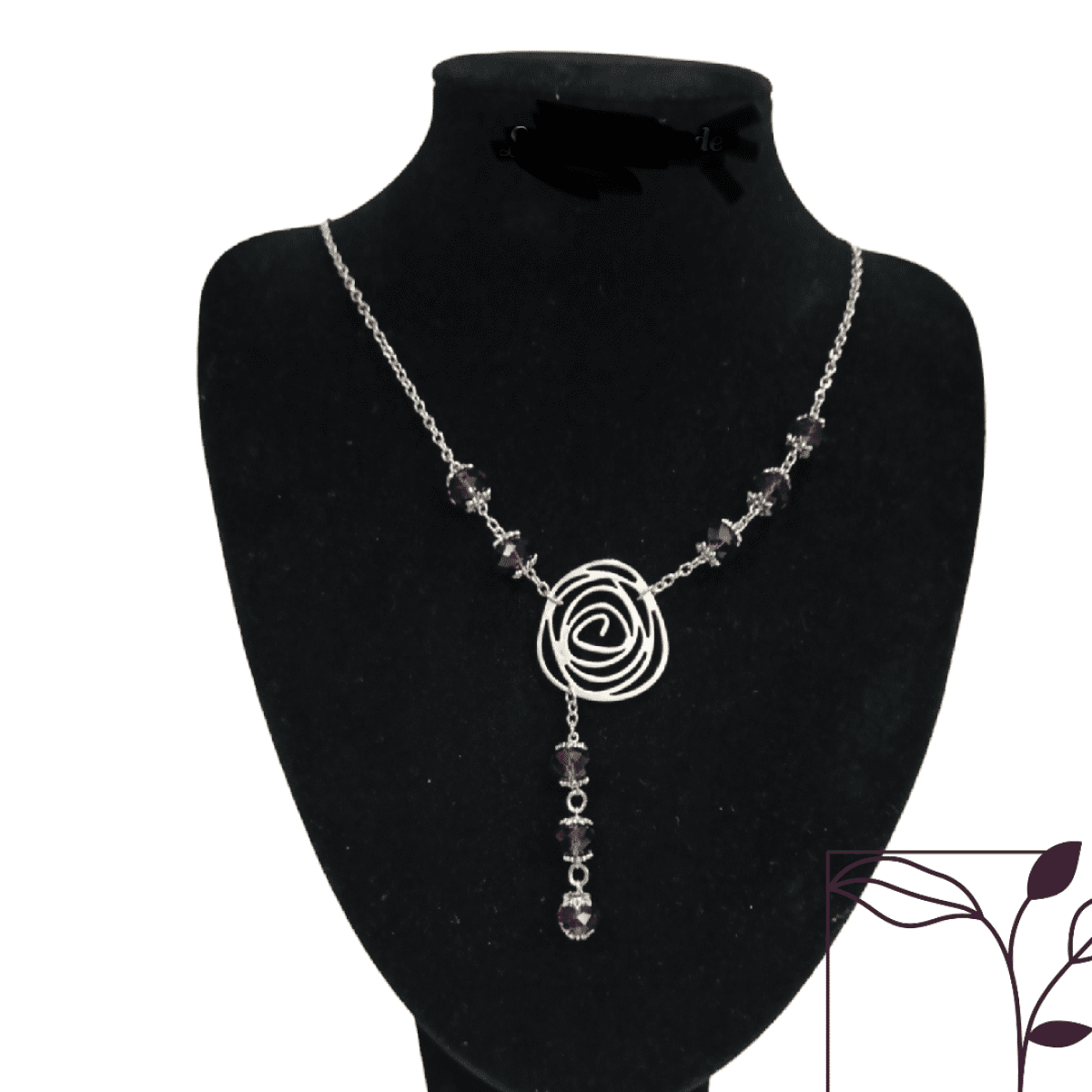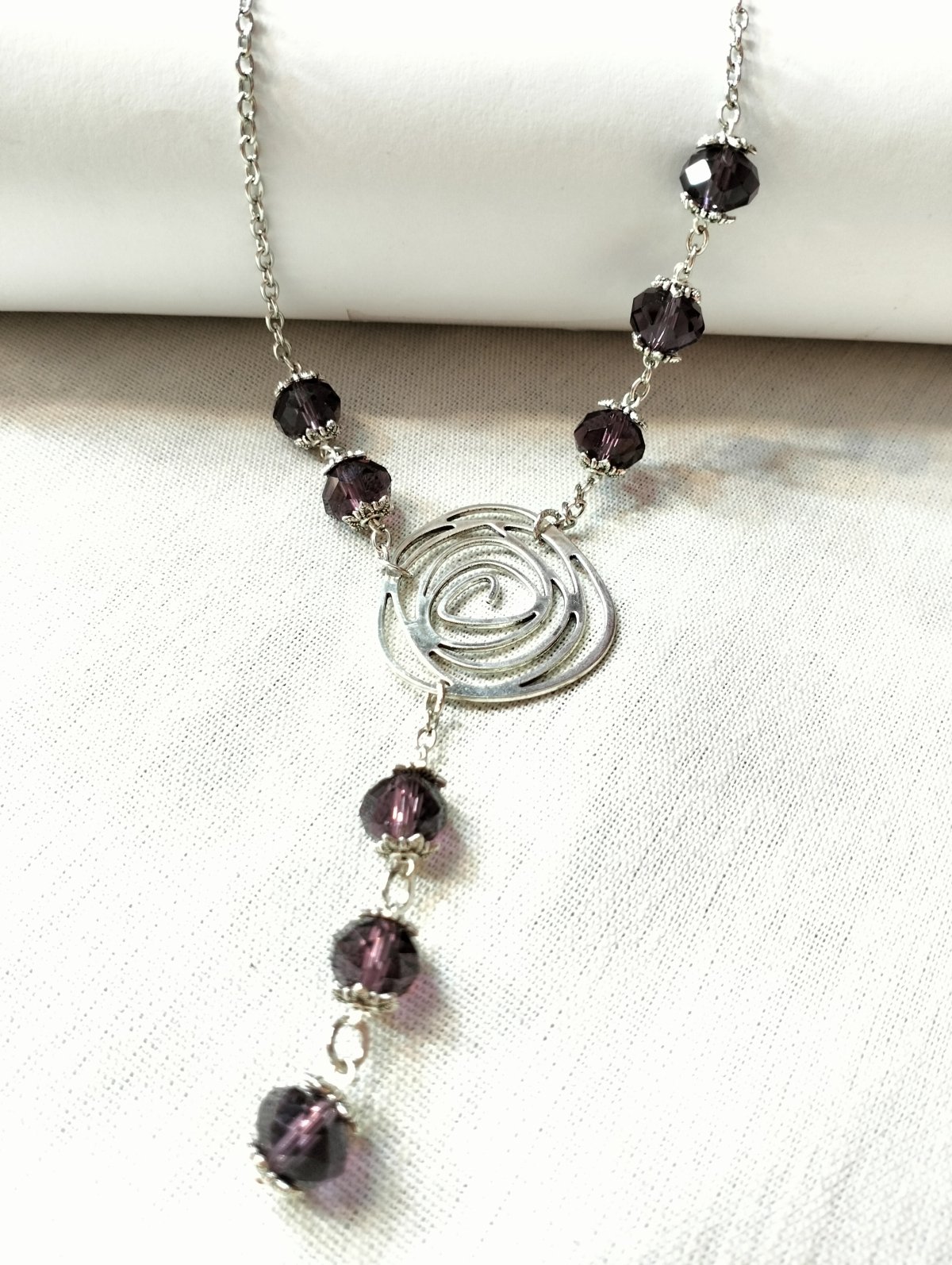 سلسلة من الكريستال الأرجواني مرصعة بقلادة على شكل وردة فضية اللون، بطول 32 سم