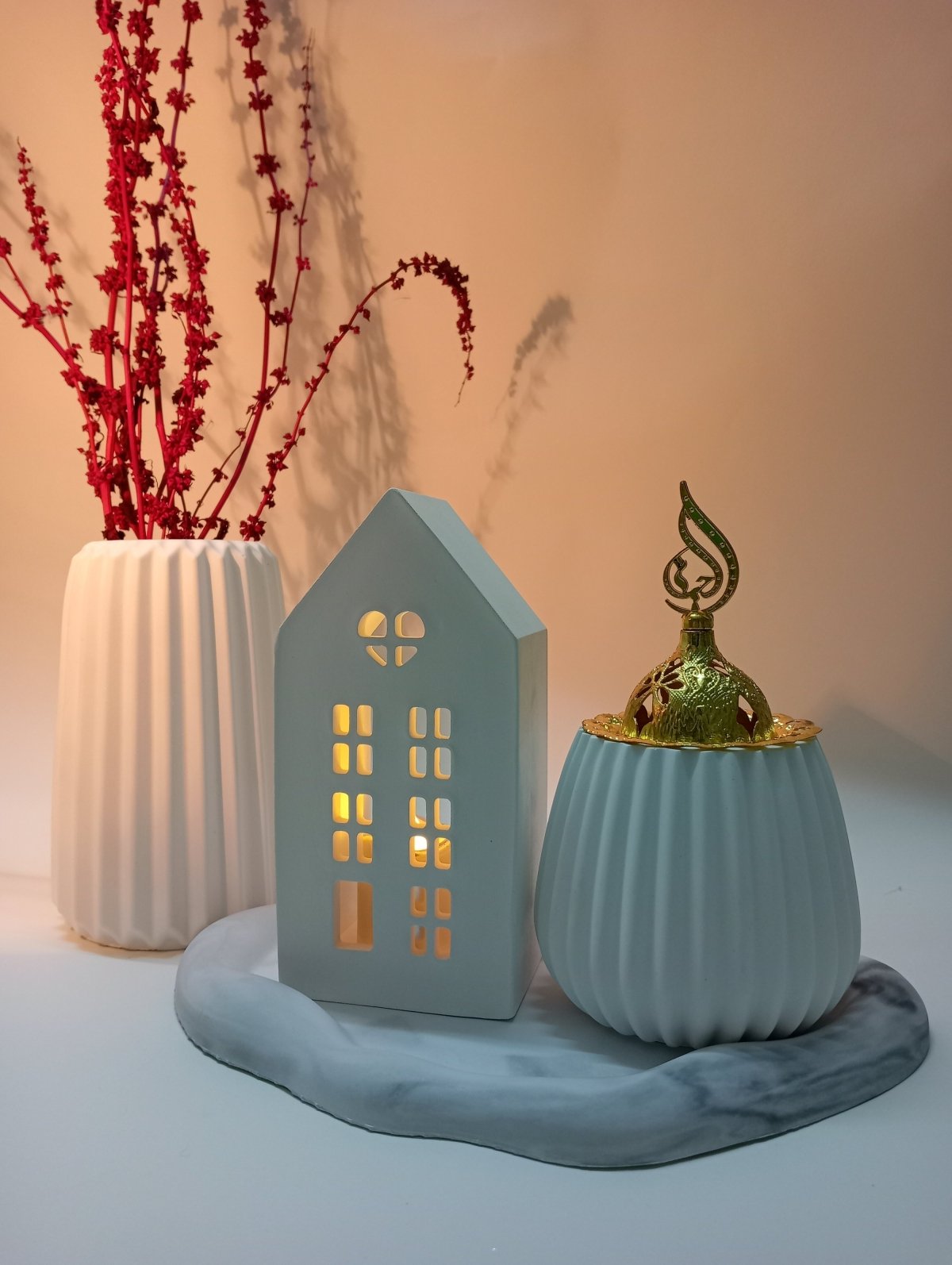 Concrete set consisting of a polygonal vase, a cloud coaster, an incense burner with a golden cover, and a waterproof insulated house.