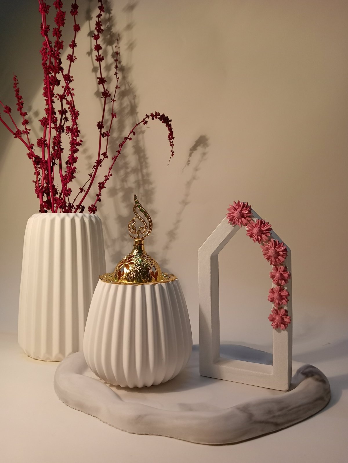 Concrete set consisting of a polygonal vase, a cloud coaster, an incense burner with a golden cover, and a waterproof insulated house.