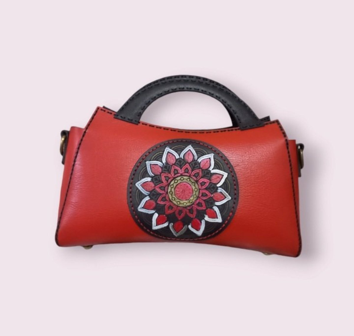 Women's bag, natural leather, red color, short handle, long arm, copper zipper