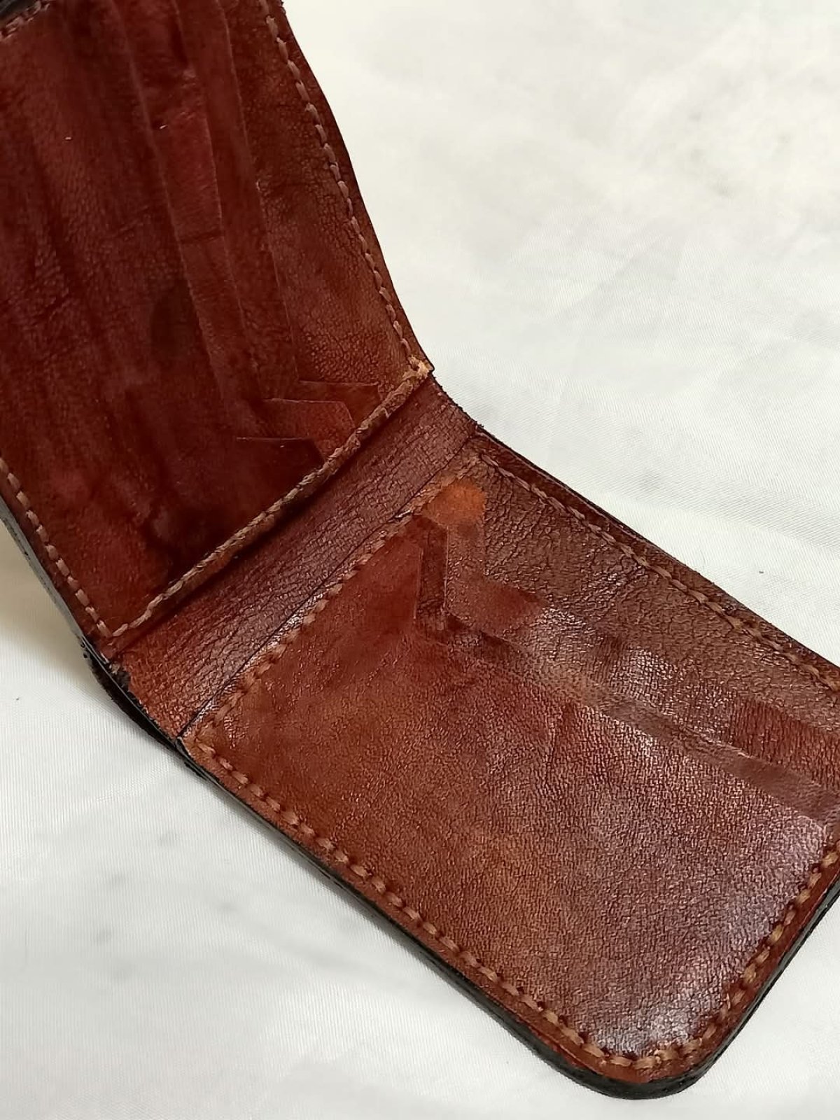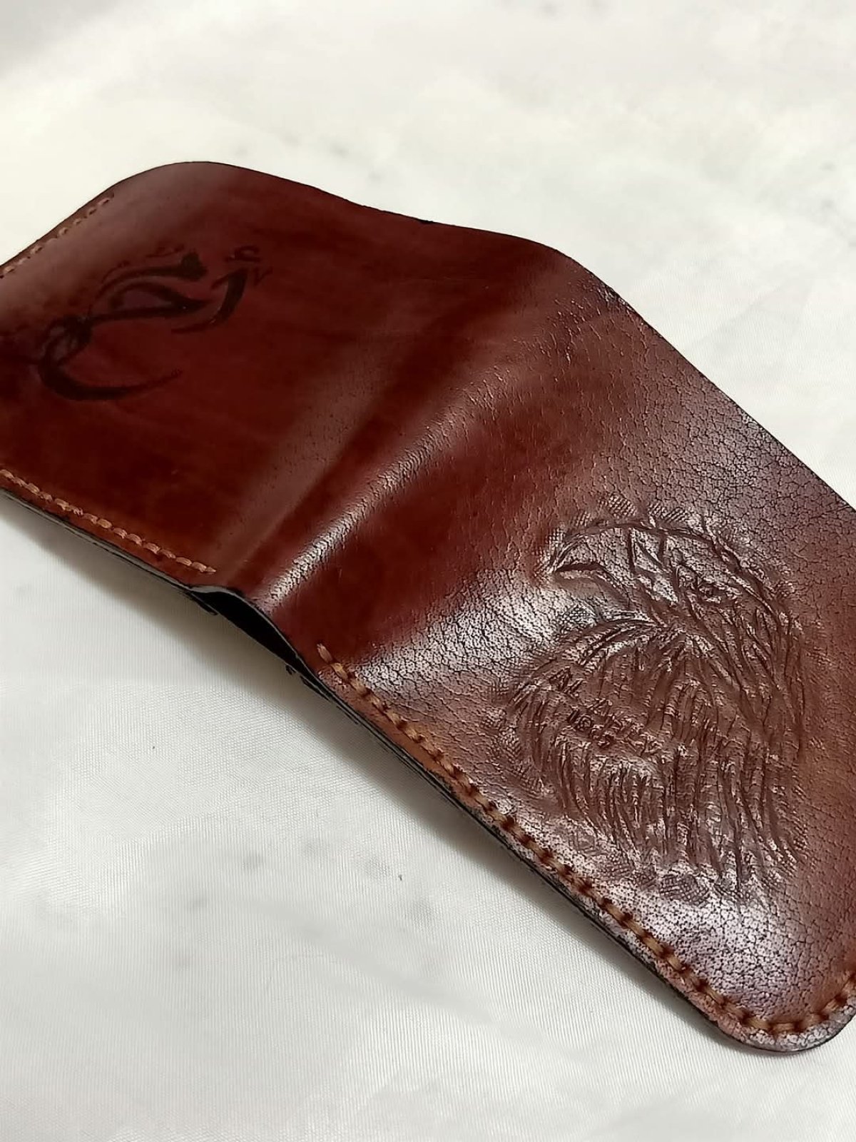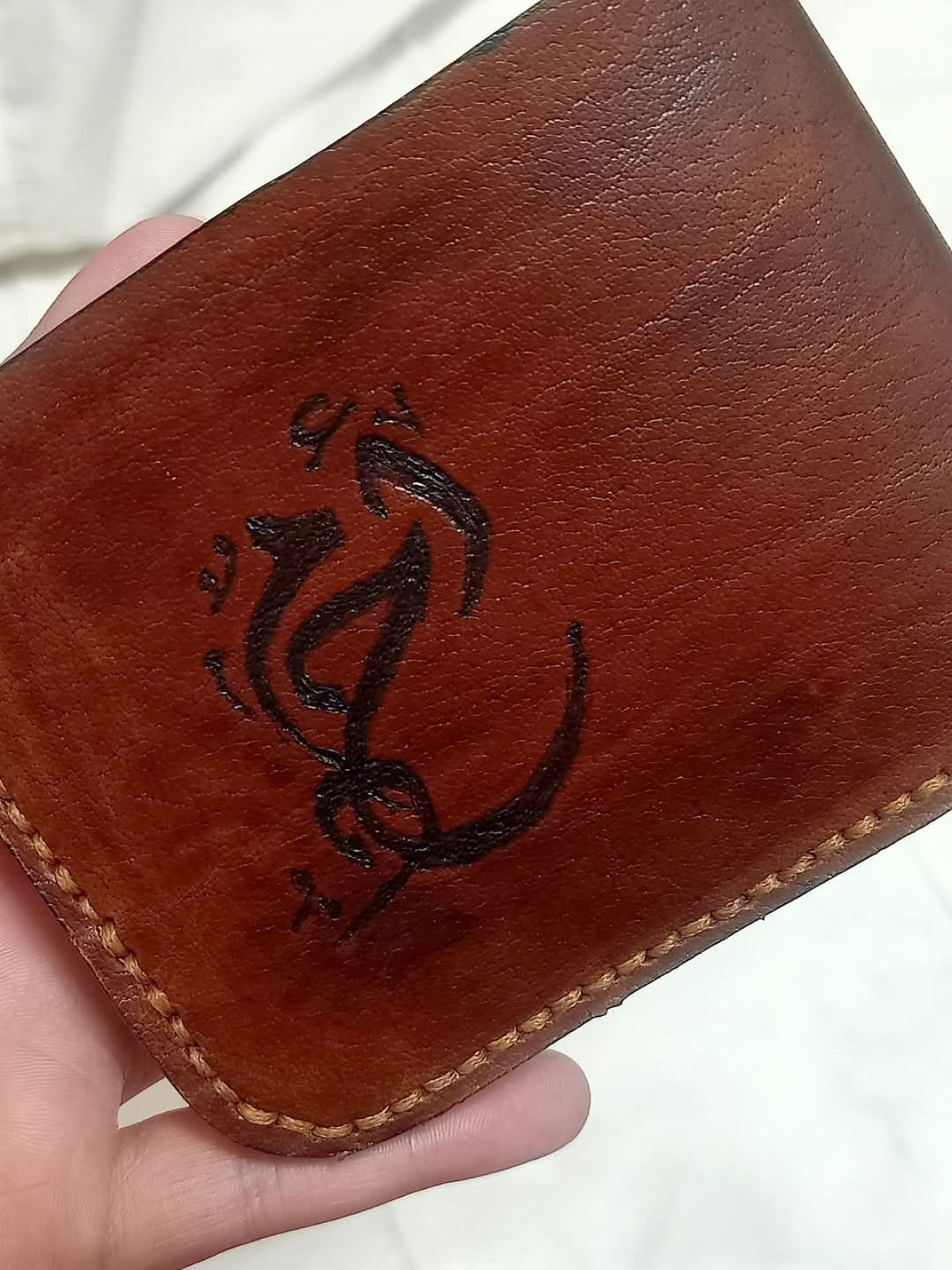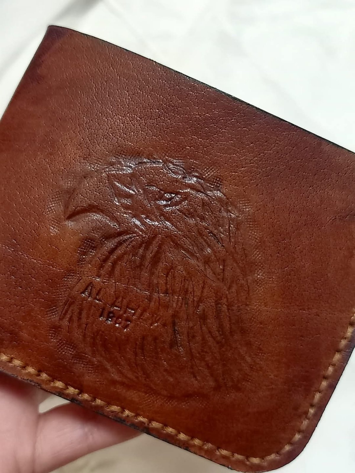 Men's wallet, 100% genuine leather, size 18 x 8 Designed with the Al-Ahly eagle using precise engraving techniques Embroidered with the name Ahmed using a burning technique Contains 8 internal pockets and a large pocket Colored in Havana, with color and design options available