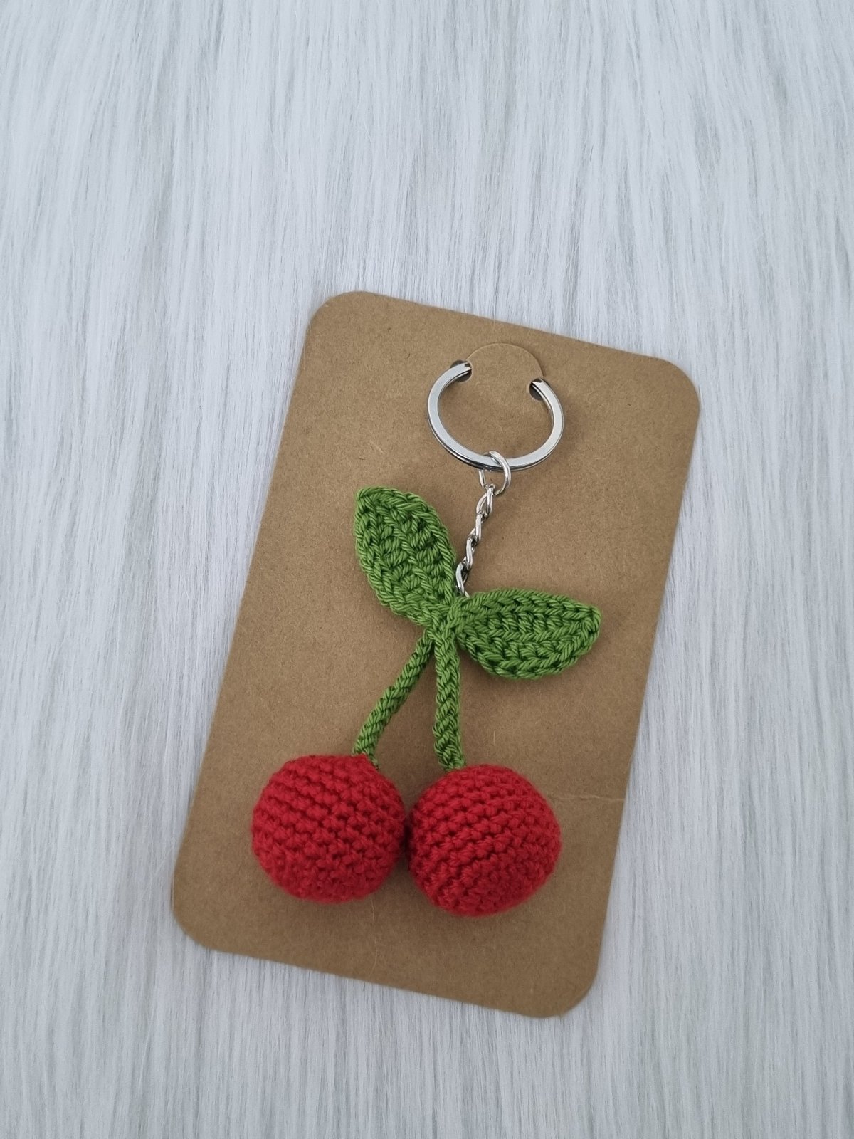 Add a cute and refreshing touch to your keys with this handmade crochet cherry keychain Featuring two vibrant red cherries with green leaves, this keychain brings the beauty of nature into your daily accessories Crafted with soft yarn and a strong metal ring, it's perfect for keys, bags, or even your car mirror