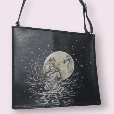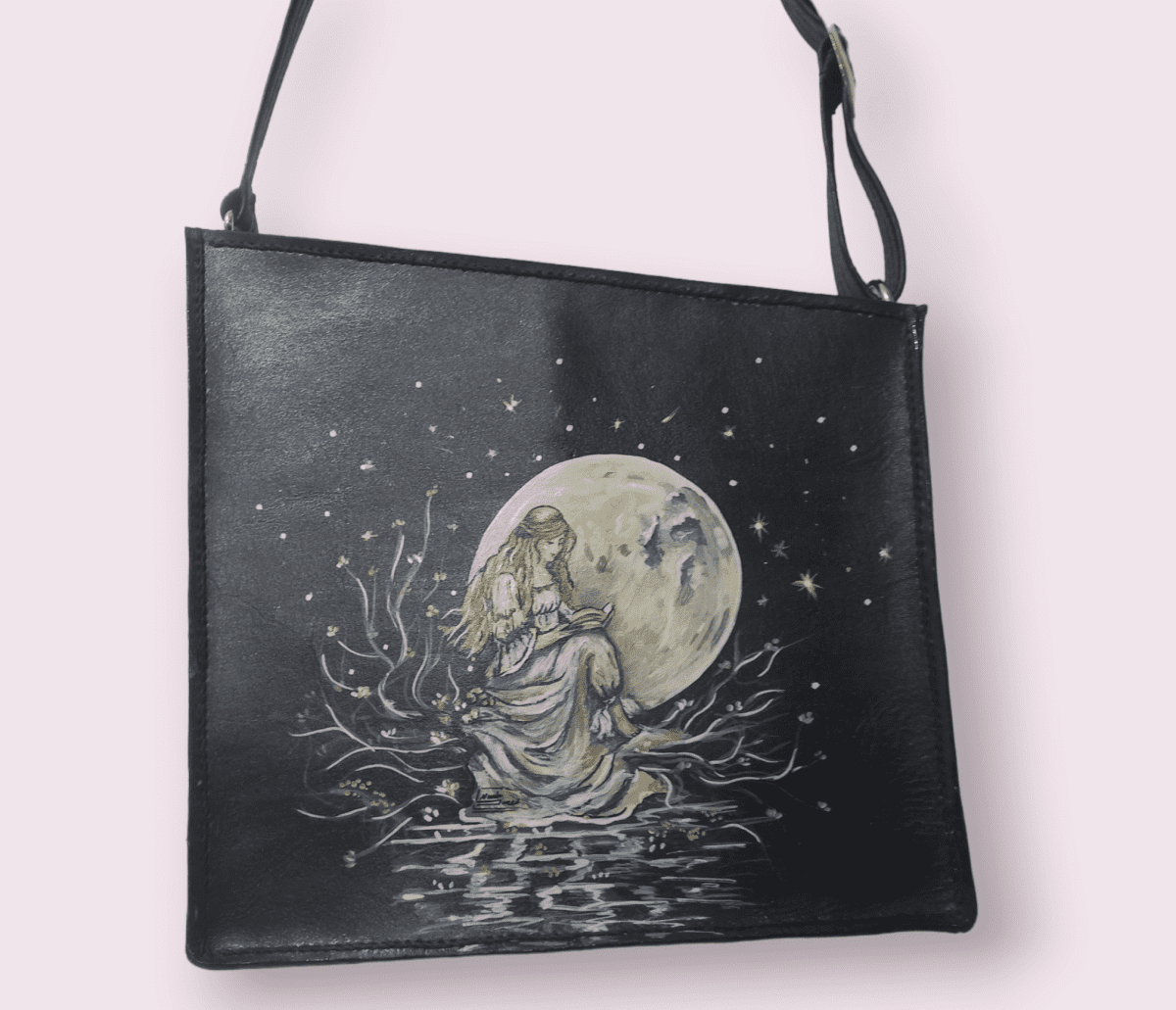 Handmade women's tote bag, natural leather Black color Handmade moonlight drawing Natural leather lining, inner pocket Long handle