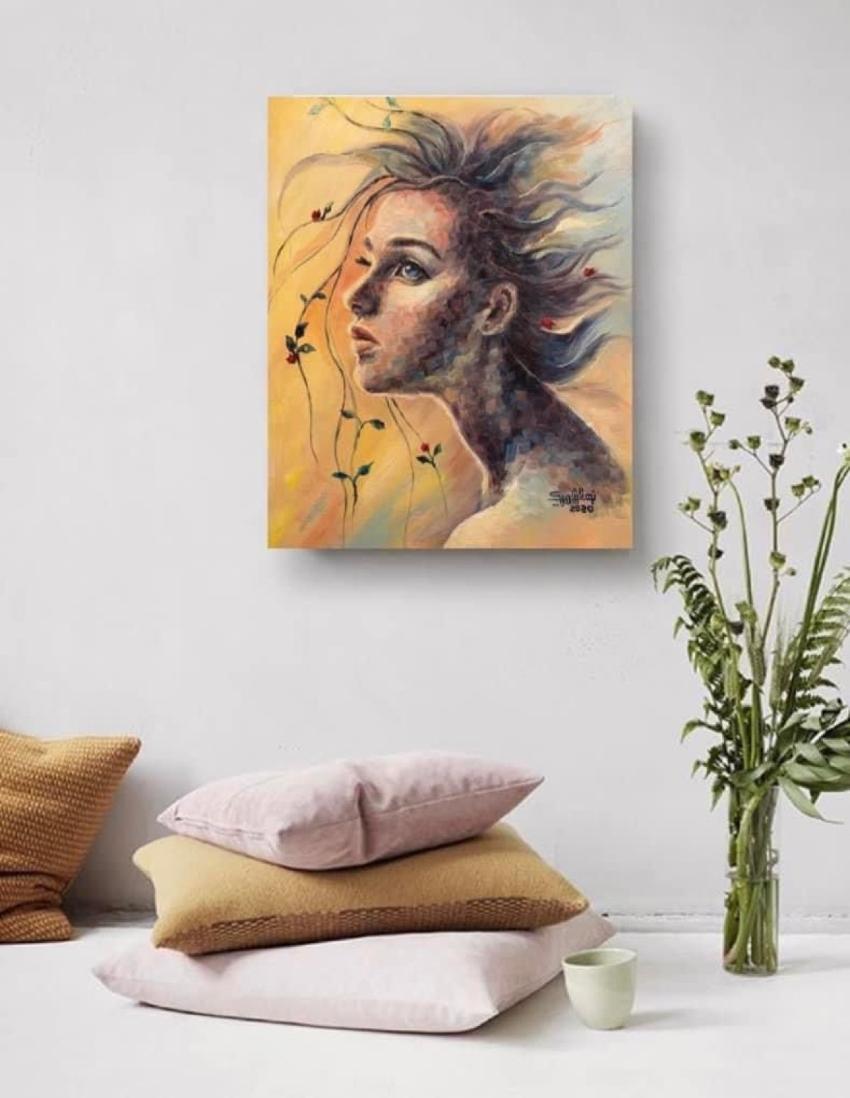 Hand made portrait tableau of oil colors on fabric streched on wooden frame size 50*70 cm.