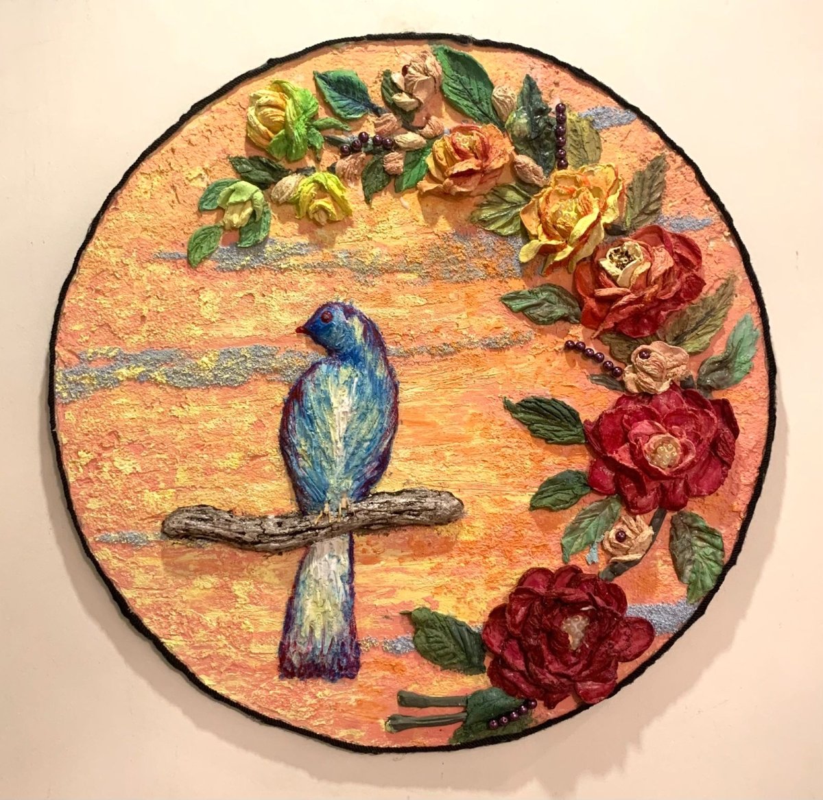 Sculpture painting on wooden round tableau colored with acrylic colors. Diameter 40 CM