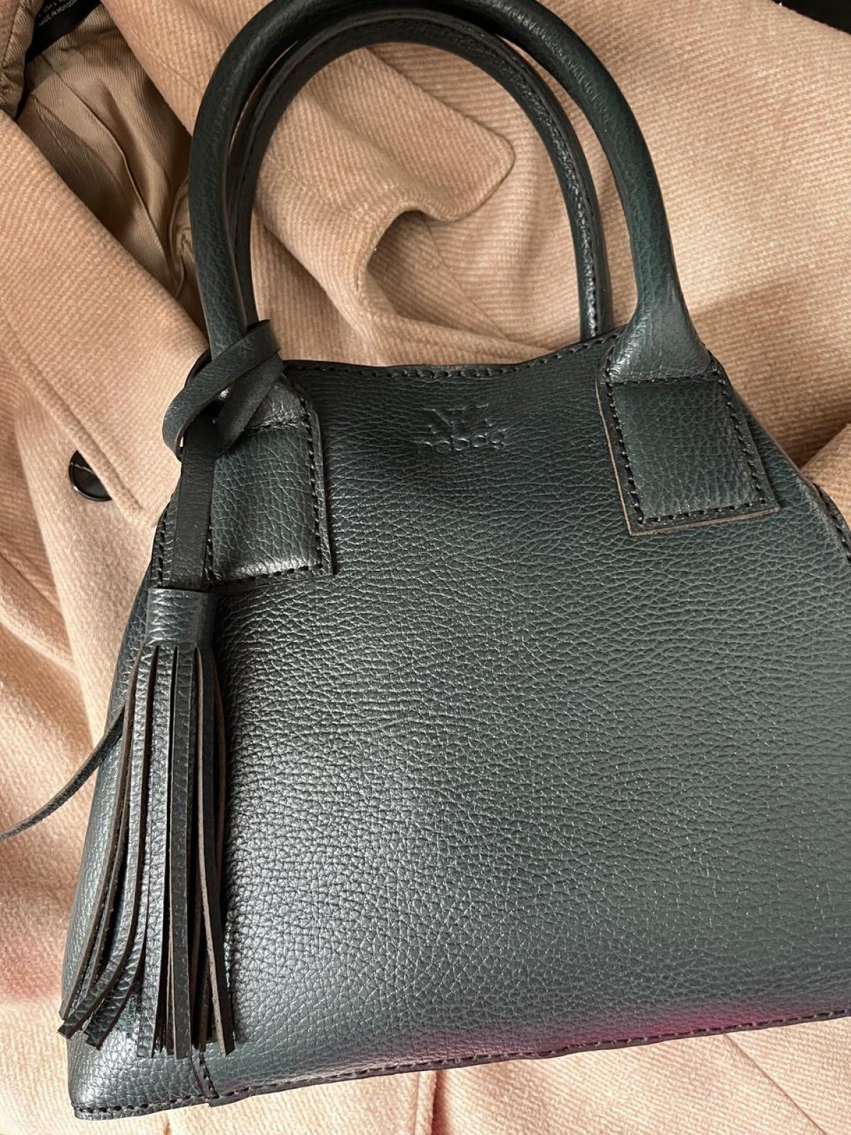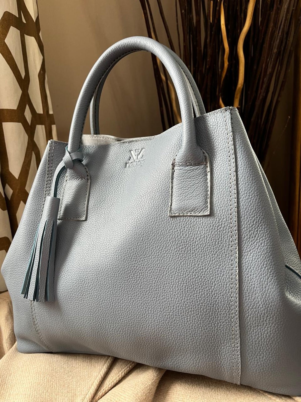 A handcrafted bag made of genuine leather in a distinctive sky blue color.
