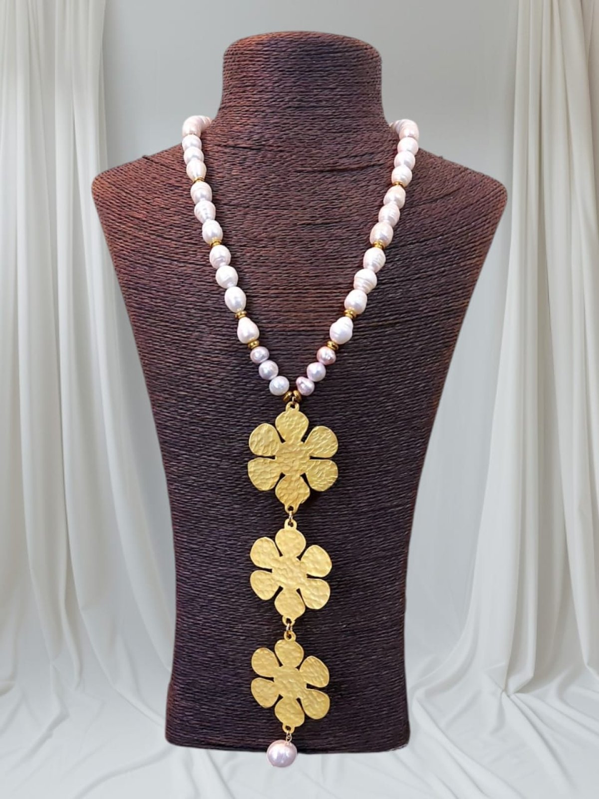 A necklace made of large-sized cultured natural pearls, featuring pure copper pendants, handcrafted in a workshop and gold-plated. Custom lengths available upon request. Comes with an adjustable chain for length control
