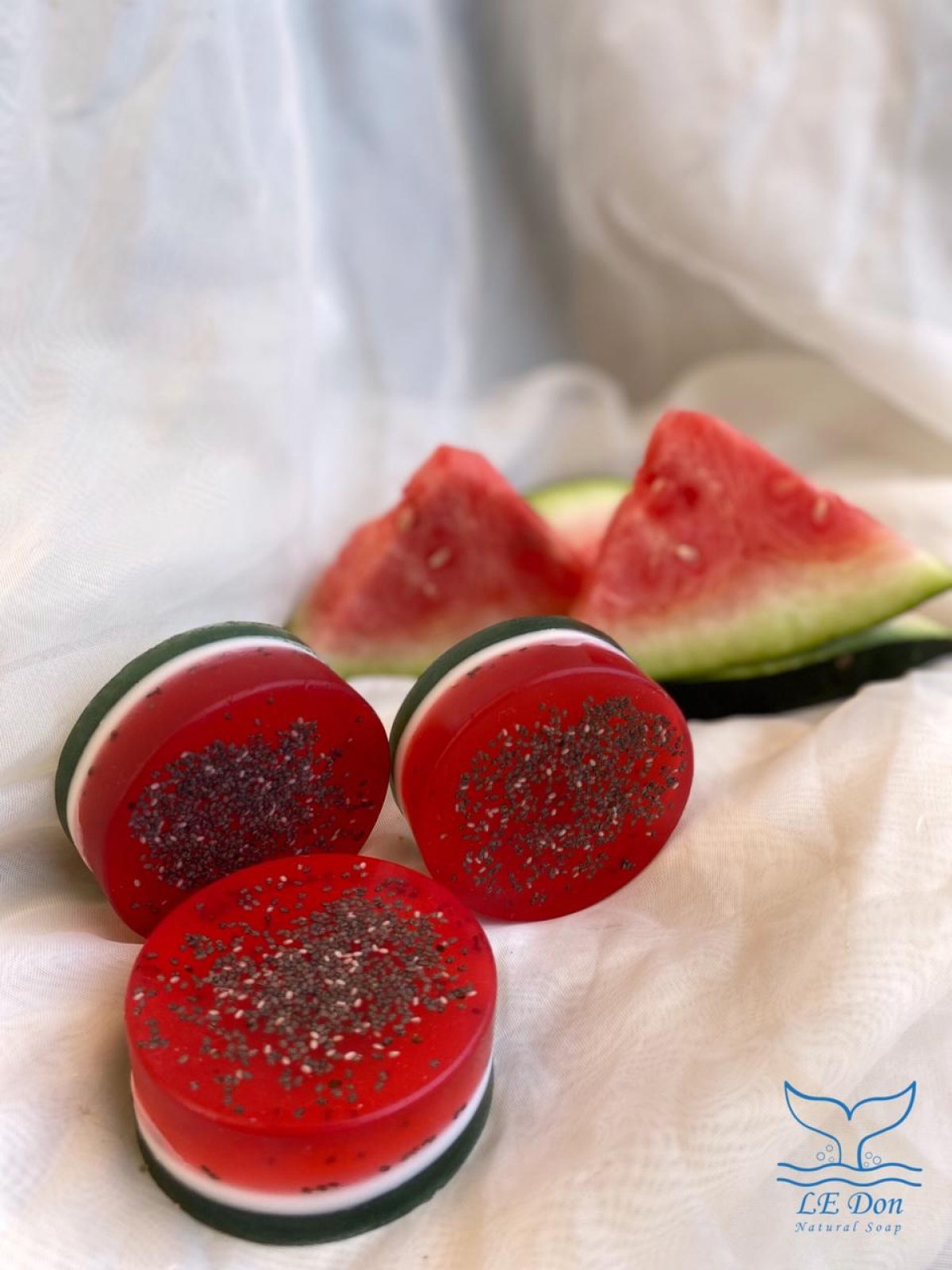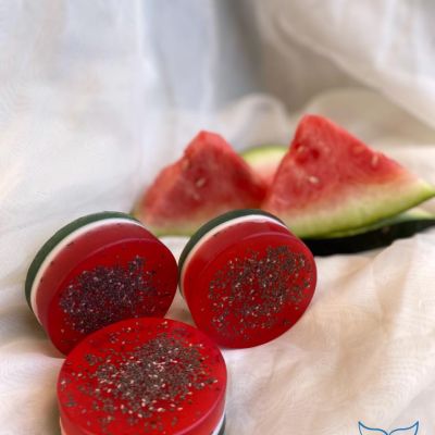 Crazy watermelon soap for all skin especially dry skin has three layers, the first layer of chia seeds for light skin peeling and removal of dead cells, the second layer of coconut to lighten and moisten the skin, the third layer of sweet almond oil which makes the skin healthy.