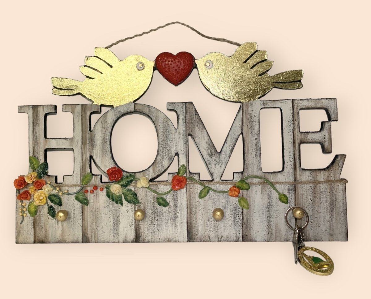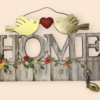 Wooden decoupage key chain holder painted with acrylic colors and golden leaf and oriented with sculpture roses. Size 46*26 cm.
