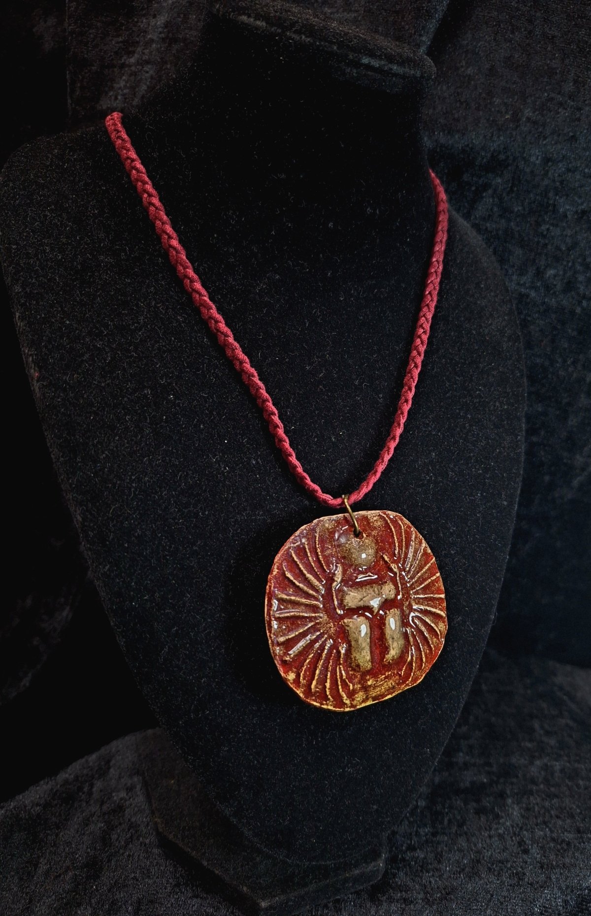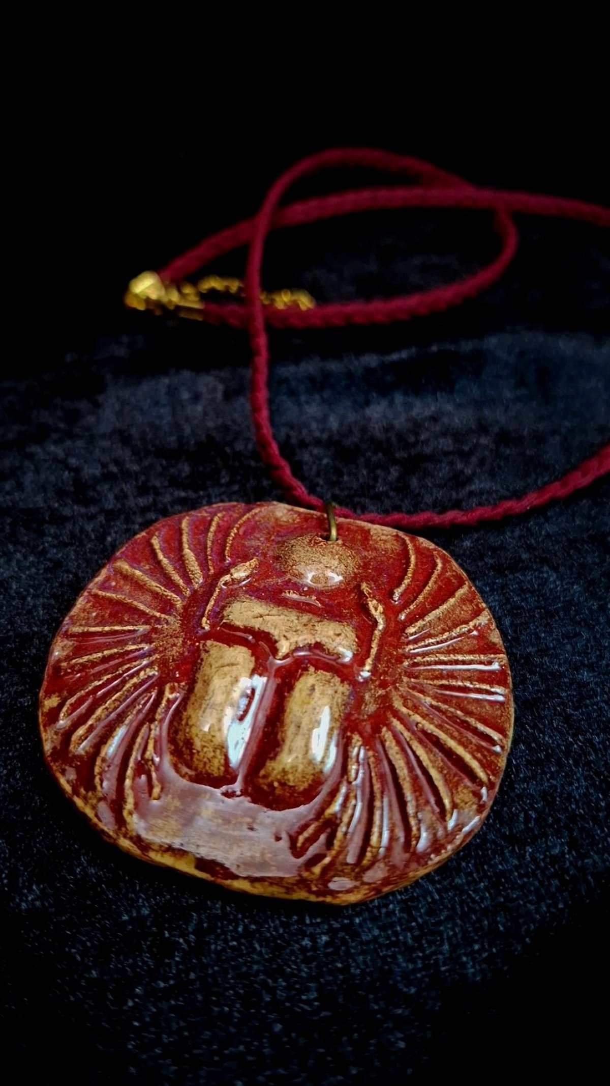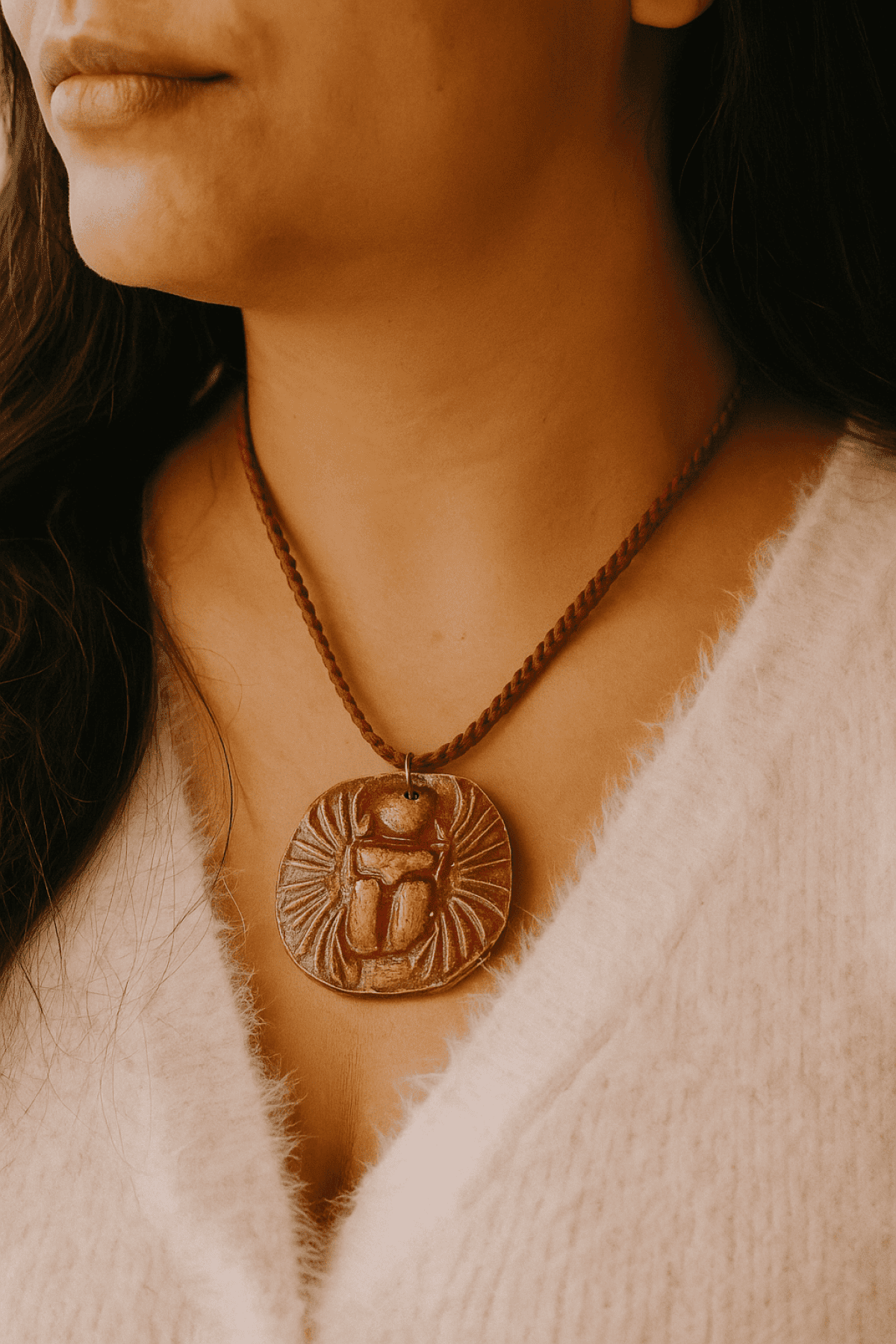 A ceramic pendant crafted in a contemporary style with copper and leather, inspired by the ancient Egyptian style (scarab). Length: 30 cm, adjustable from the back. Dimensions: 5.5 * 6 cm. A distinctive piece of art that will add a different and distinctive look to the outfit. The first brand to produce ceramic fashion accessories using CNC digital control technology.