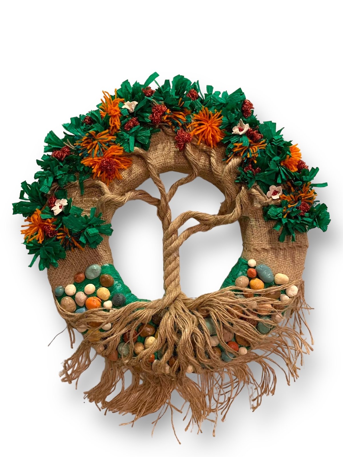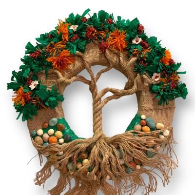 A round decorative piece of woden ring has a tree of rope, colored paper, and ceramic paste. To hang up on doors or walls. Diameter 34 cm.