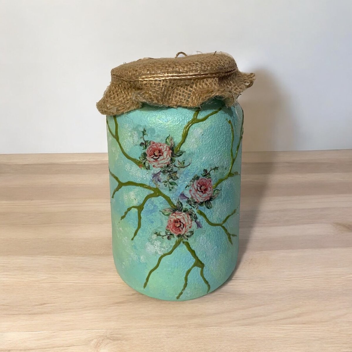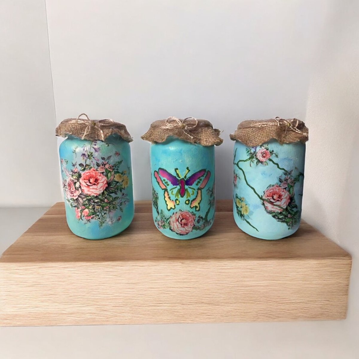A set of 3 dry food decoupage glass containers. Colored with acrylic colors. Each one is a1 liter capacity