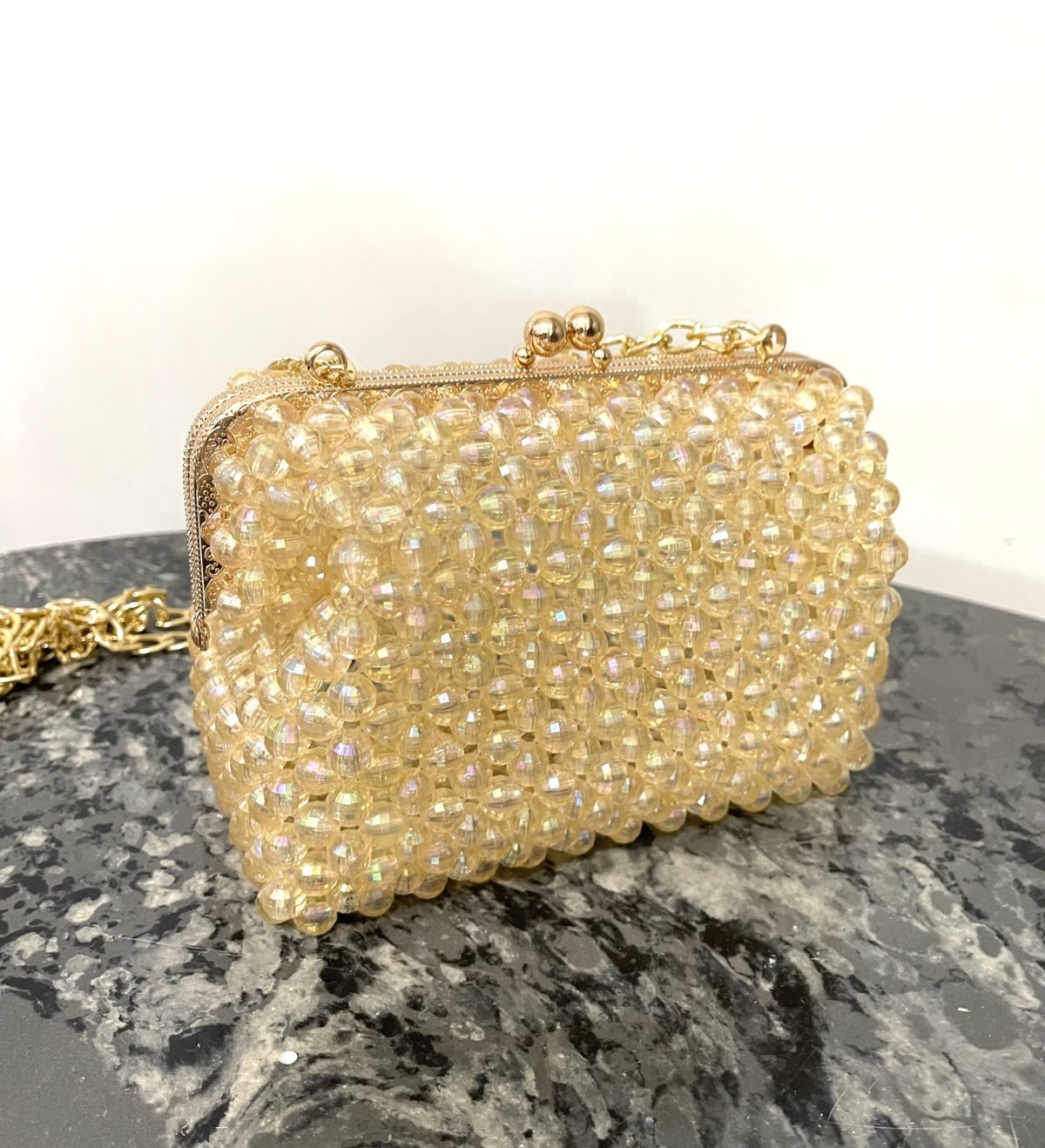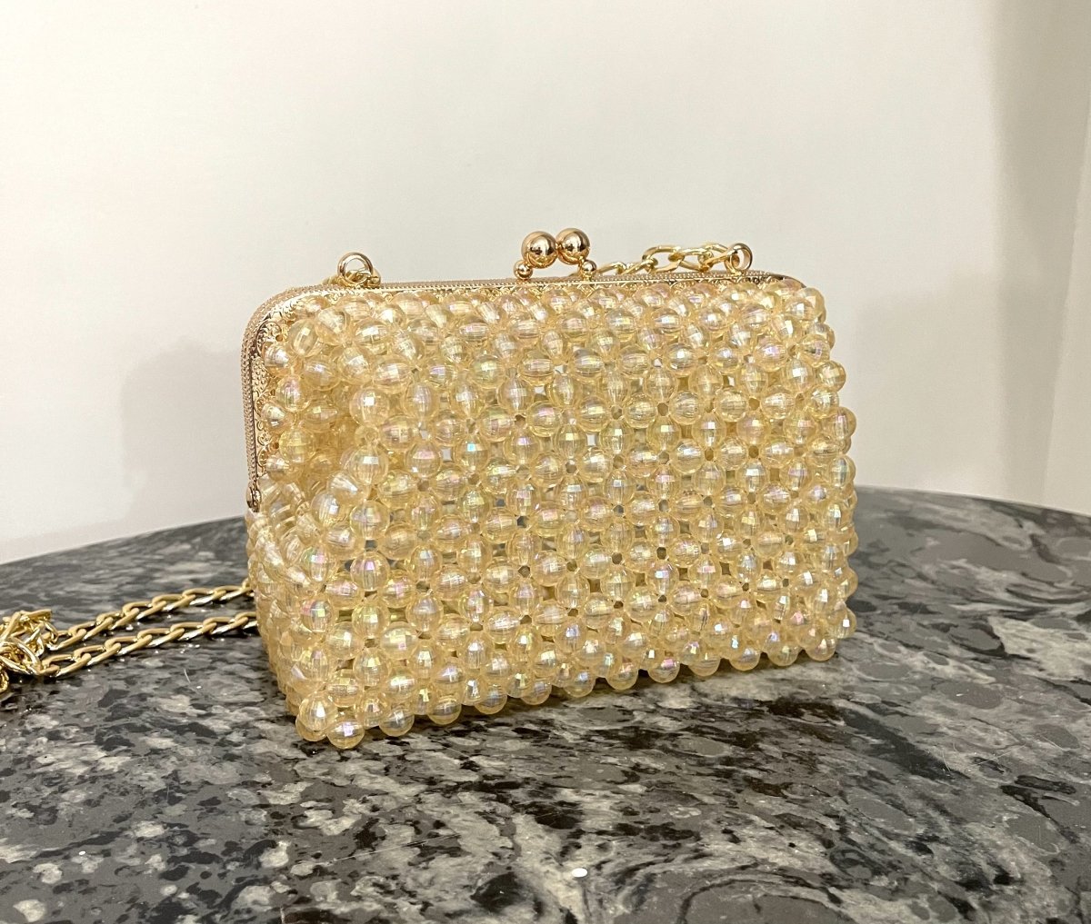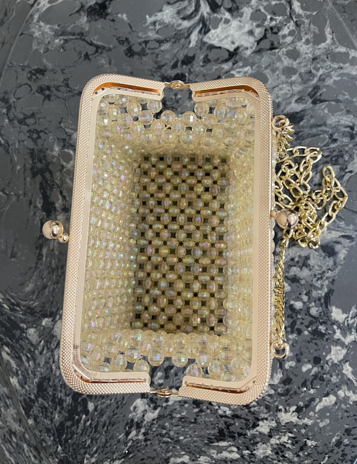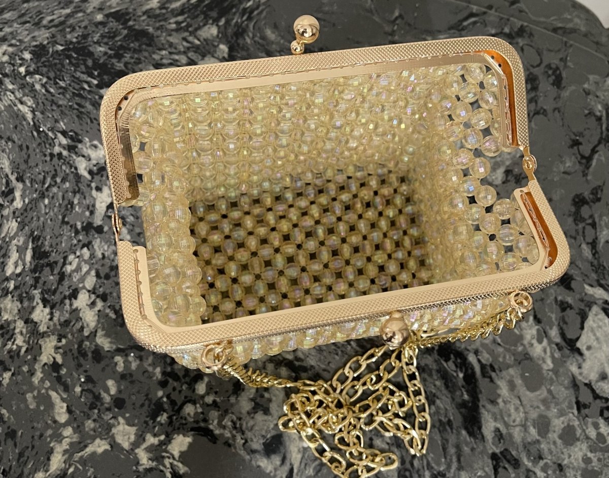 High quality plastic crystal bag with a spectrum of colors, a golden frame and a golden belt. It can hold a mobile phone, a wallet, and several other items. Length: 12 cm, width: 17 cm, and depth: 9 cm.