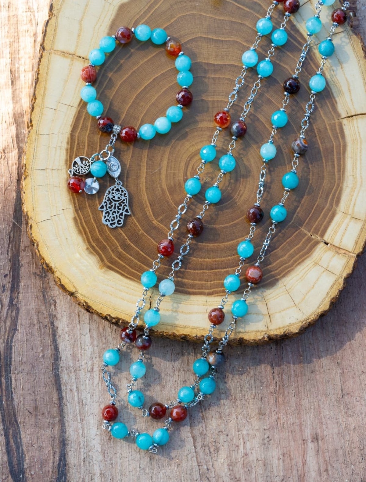 A necklace and bracelet made of Suleimani agate and jade with silver separators .