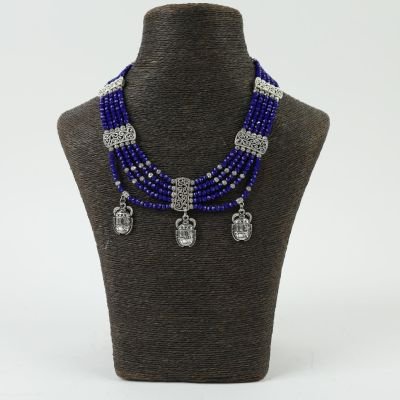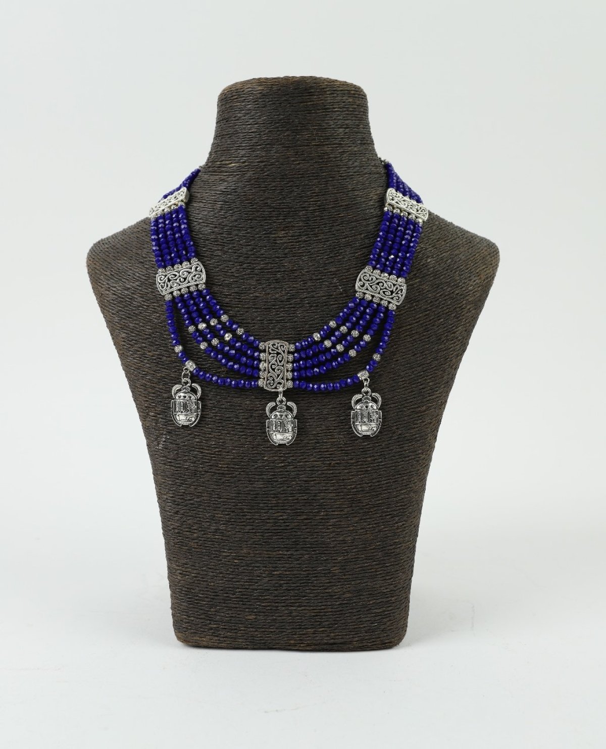 Pharaonic necklace made of Pharaonic scarab pendants, silver plated brass, with matte crystal and plated spacers.
