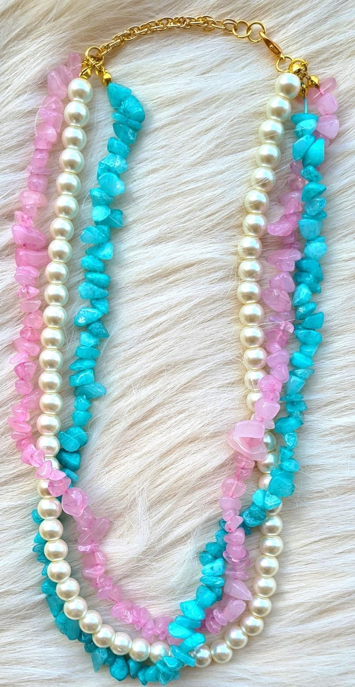 "A three-layered, intertwined pearl necklace with broken pink agate and broken light blue agate."