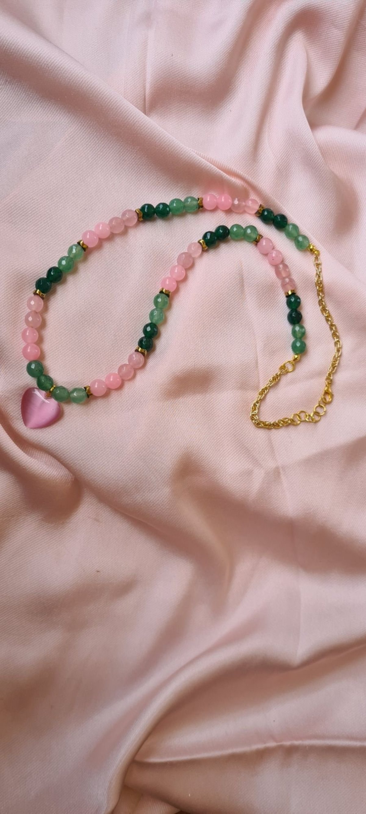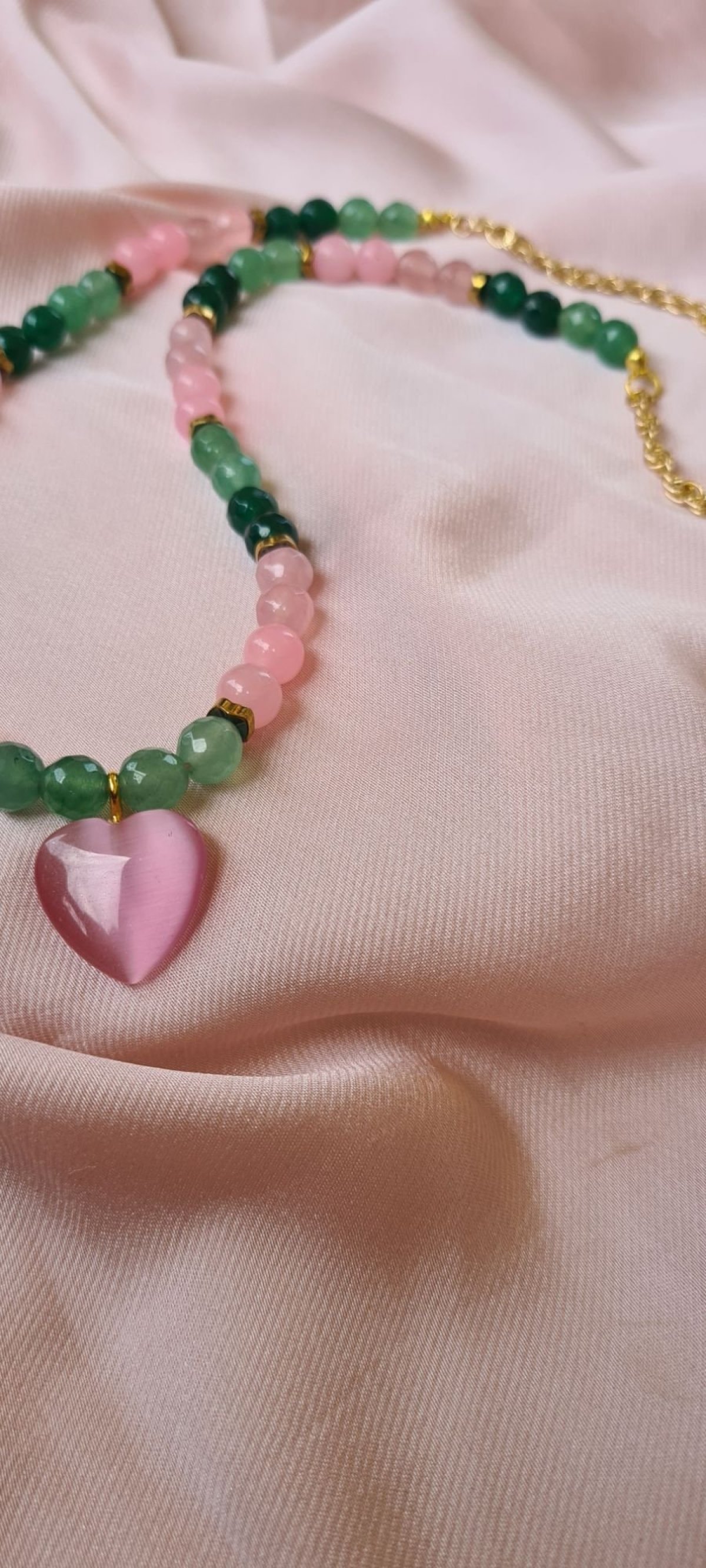 A necklace made of agate, rose quartz, and aventurine in shades of pink and green, featuring a heart-shaped cat's eye pendant and gold hematite spacers.