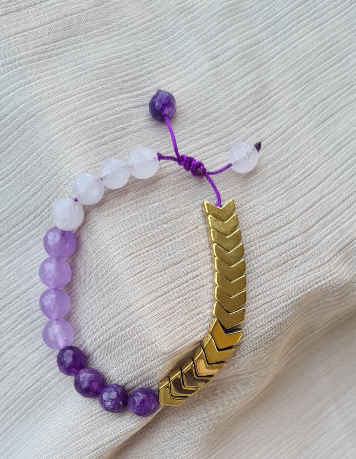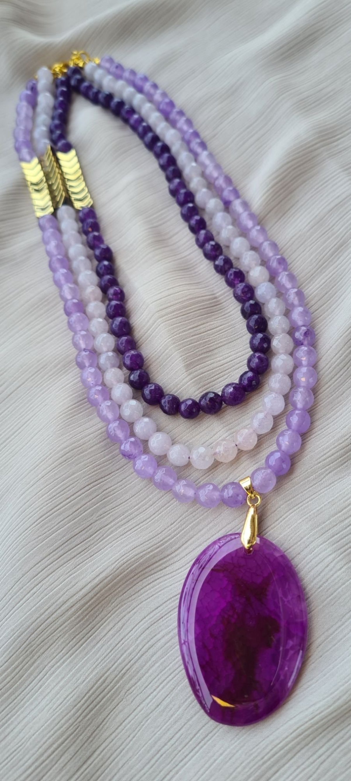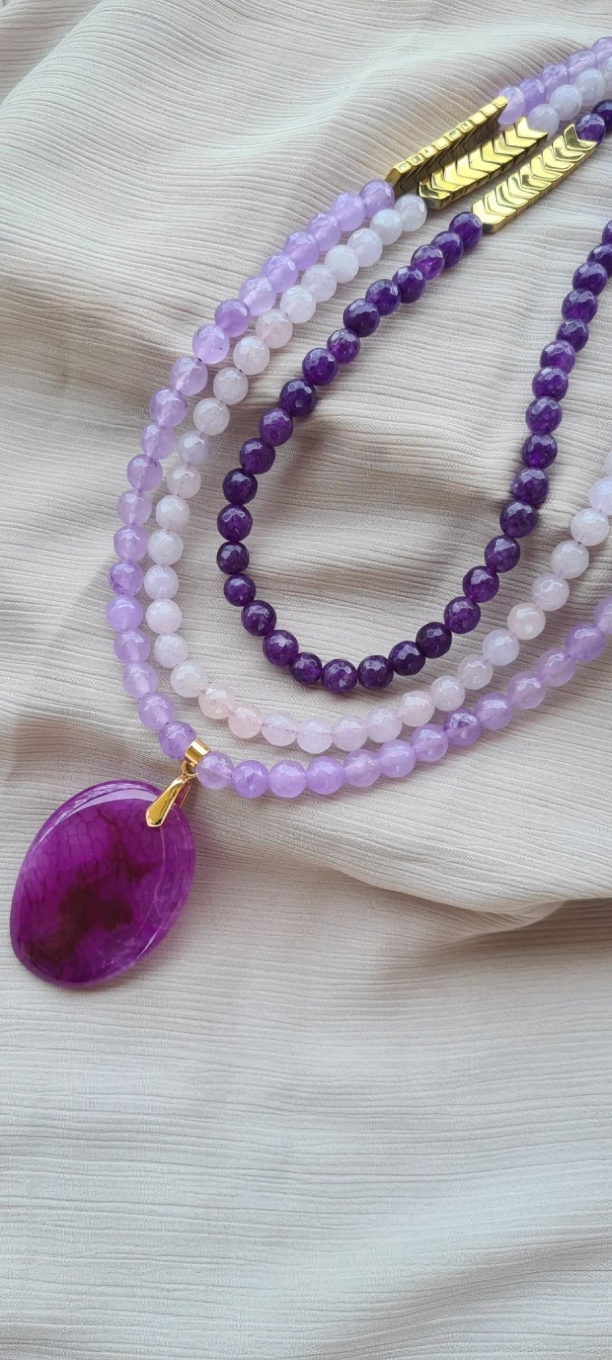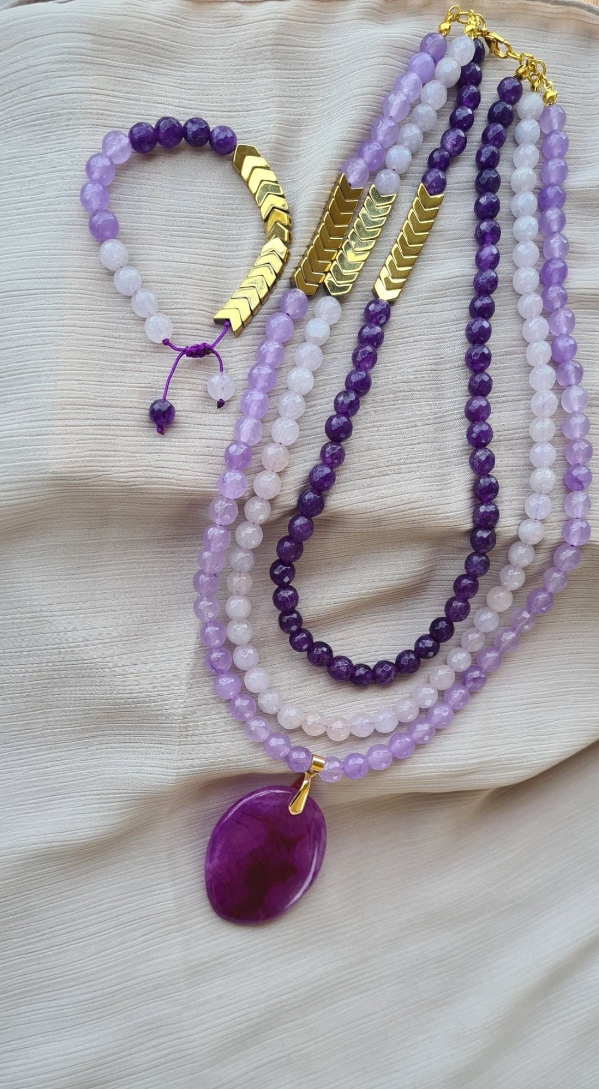 "A three-layer necklace made with varying shades of mauve agate stones, featuring a mauve agate pendant and gold-plated hematite spacers. And a bracelet made from natural agate stones with golden hematite spacers."