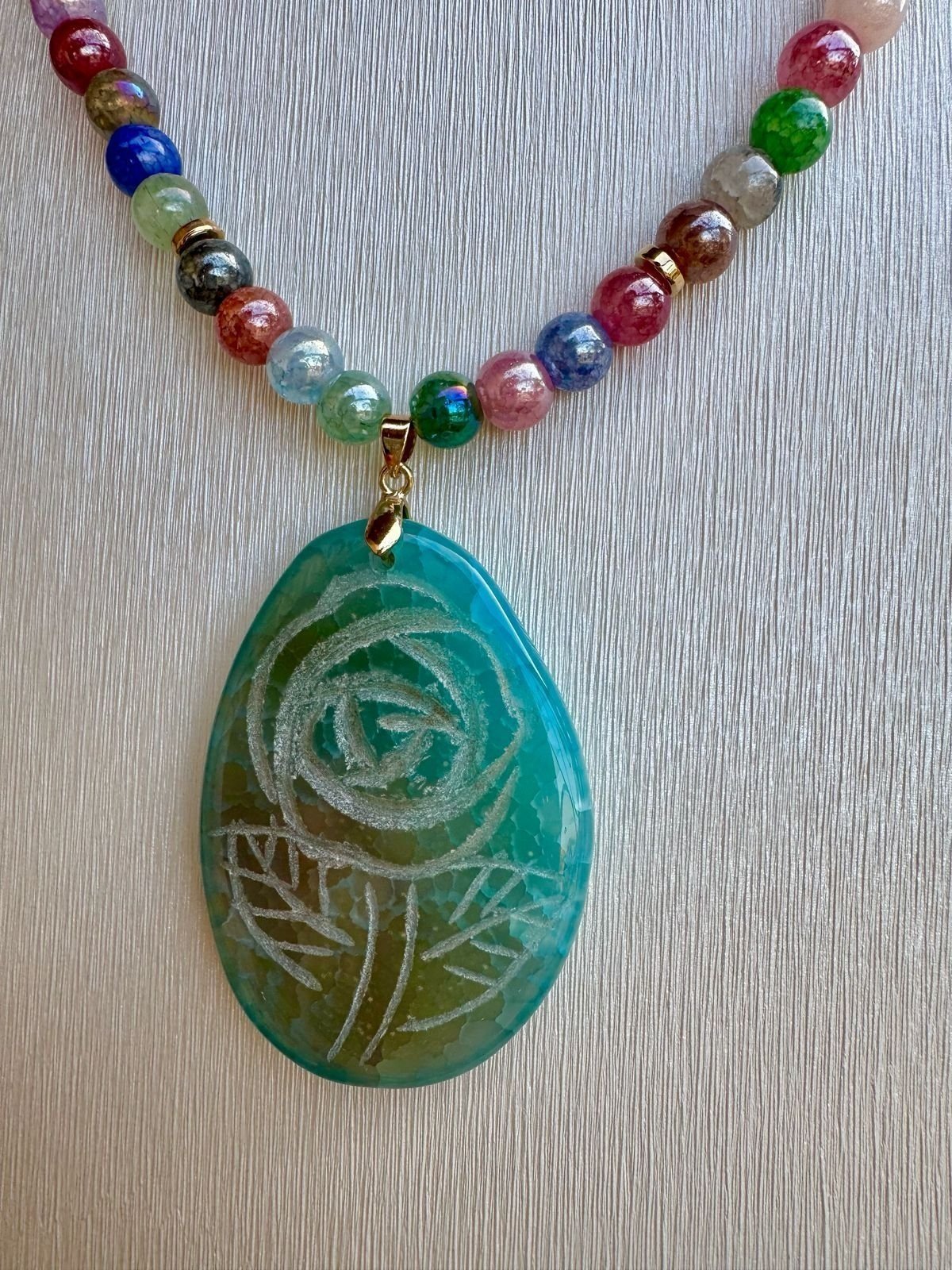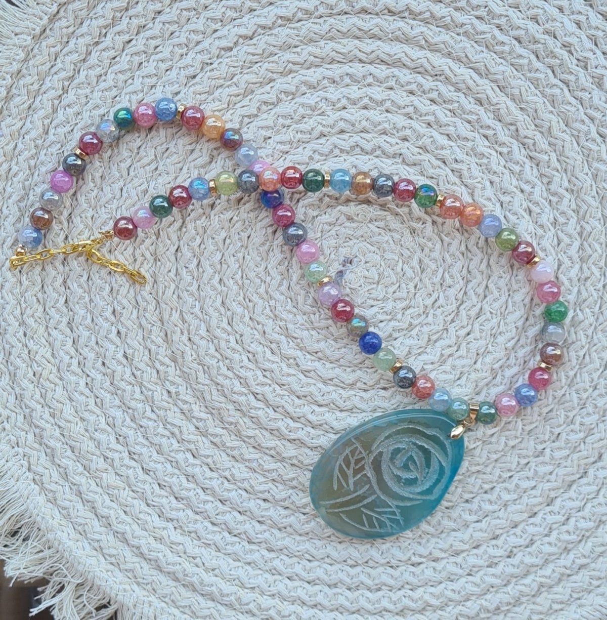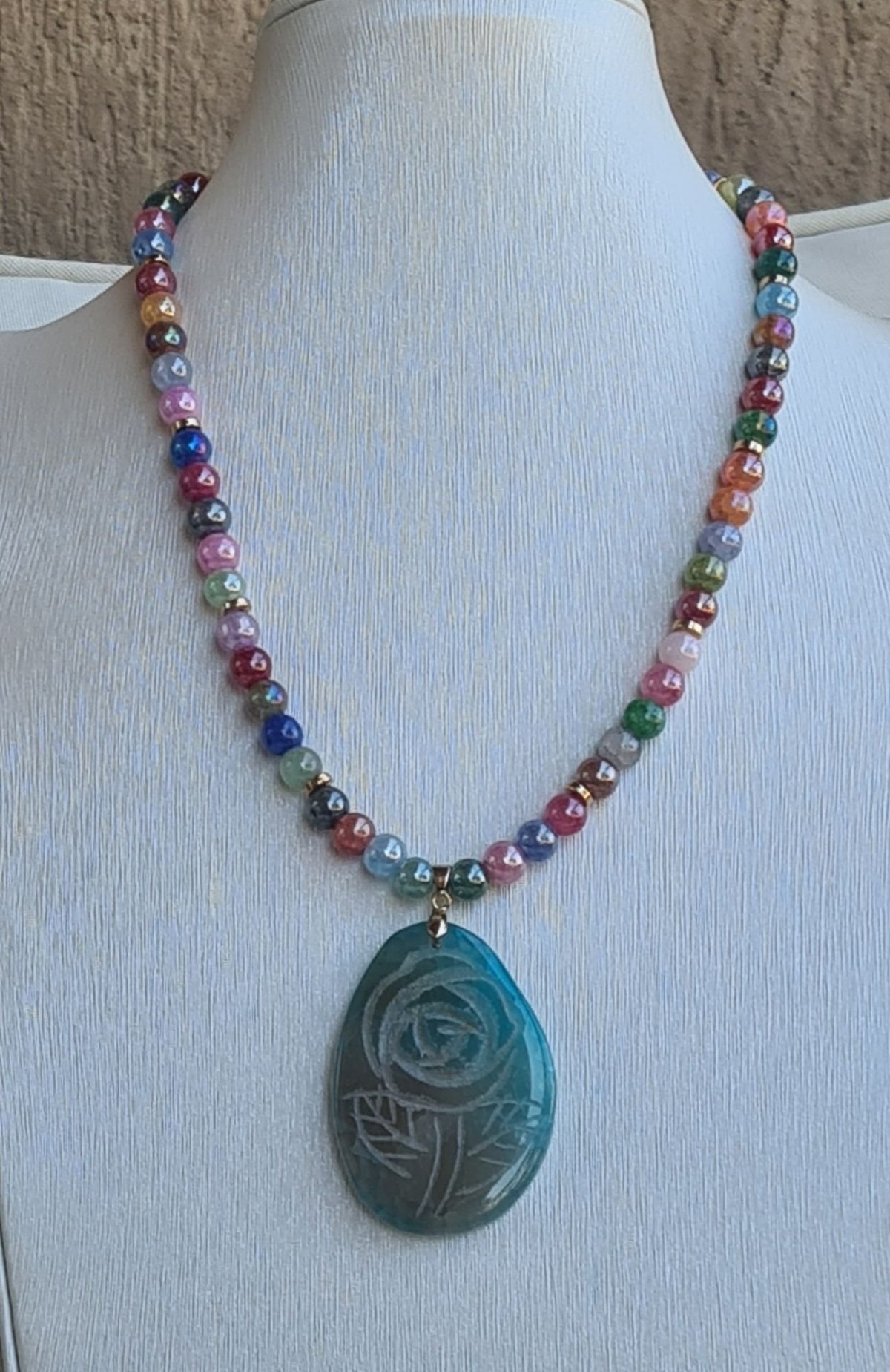 A necklace made of iridescent agate beads, hematite spacers, and an agate pendant.