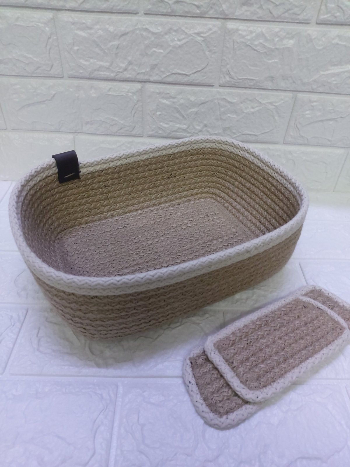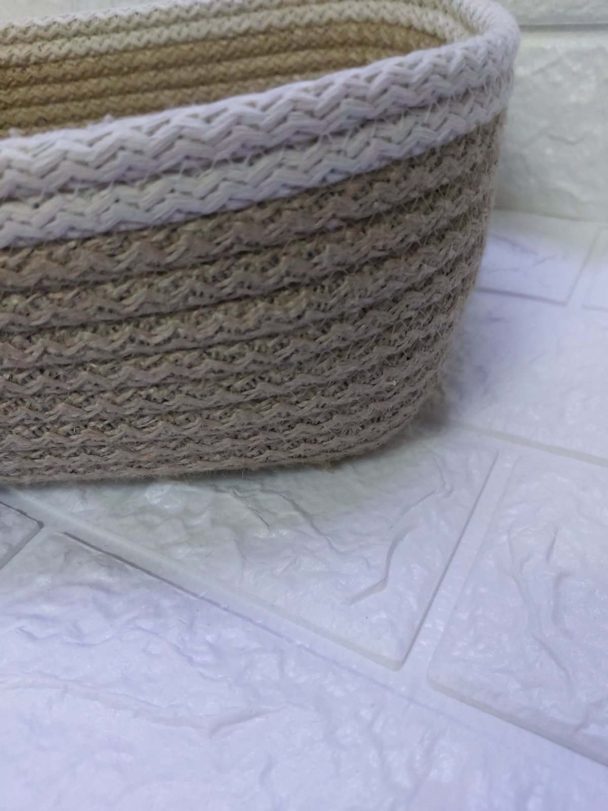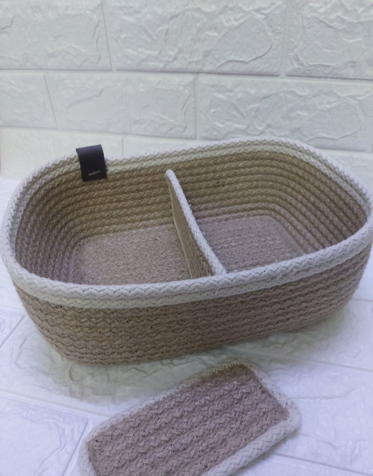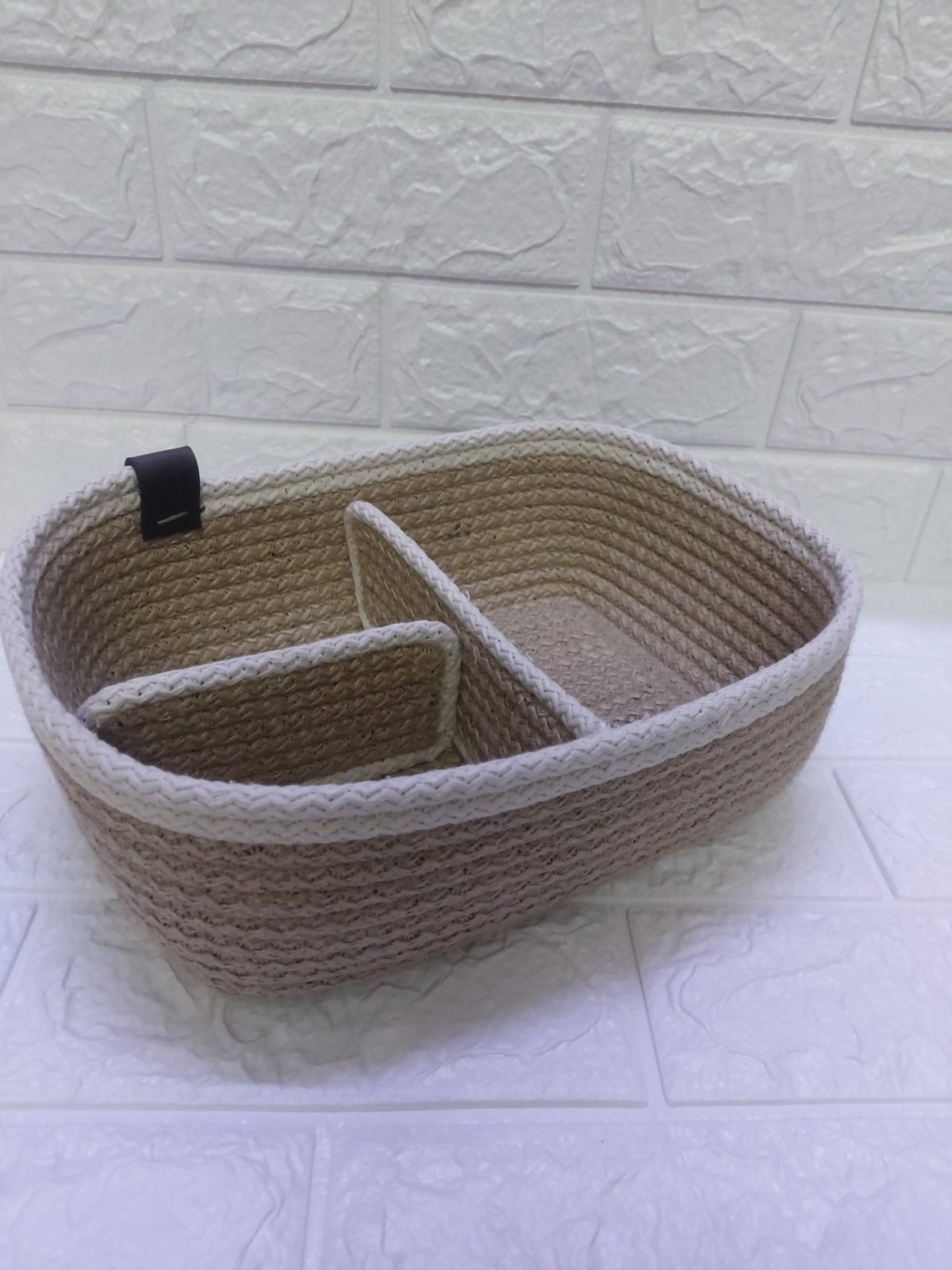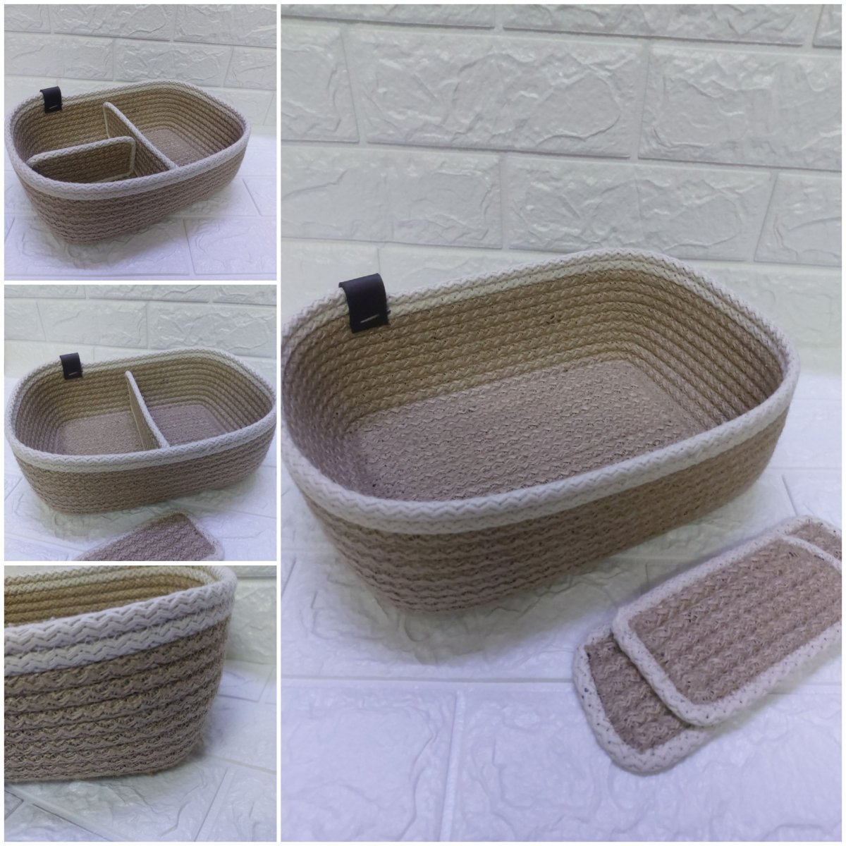 Organizing basket Made of jute rope with 2 additional pieces to be divided in several parts Multipurpose can be used for make up , accessories, etc Dimension Bottom 20 *15 cm Uppep 27 *21 cm Height 10 cm Can change size as ordered