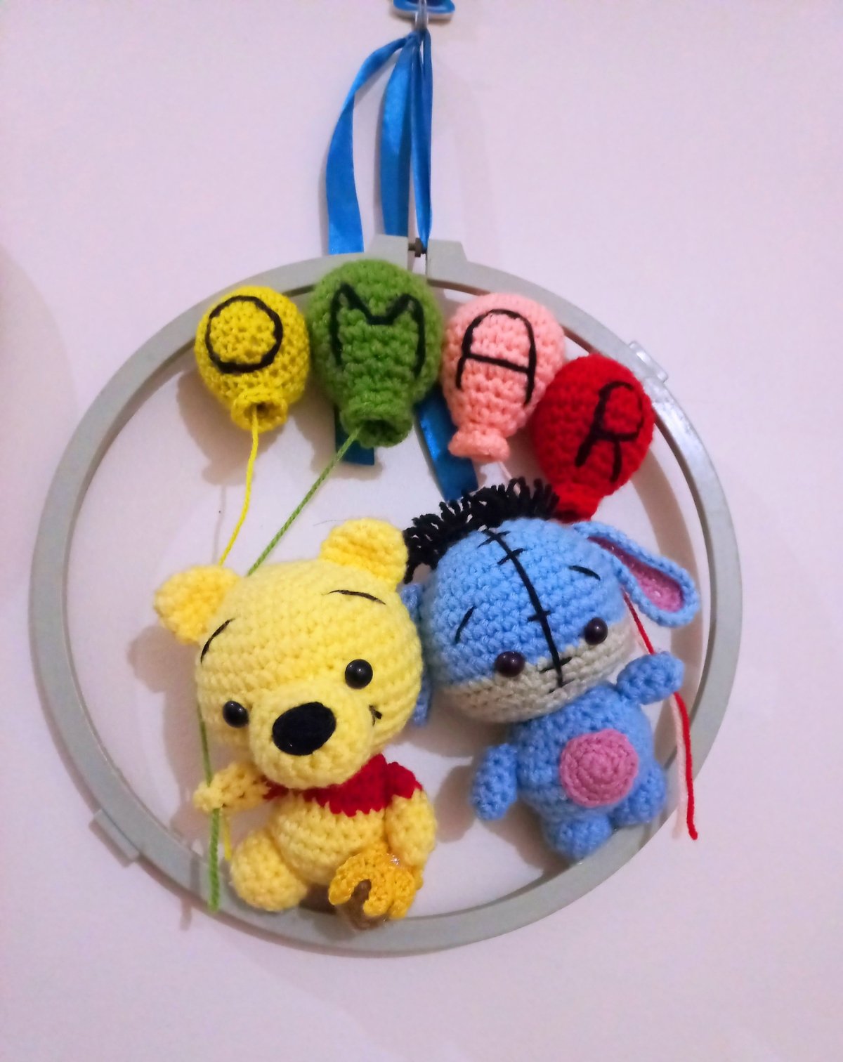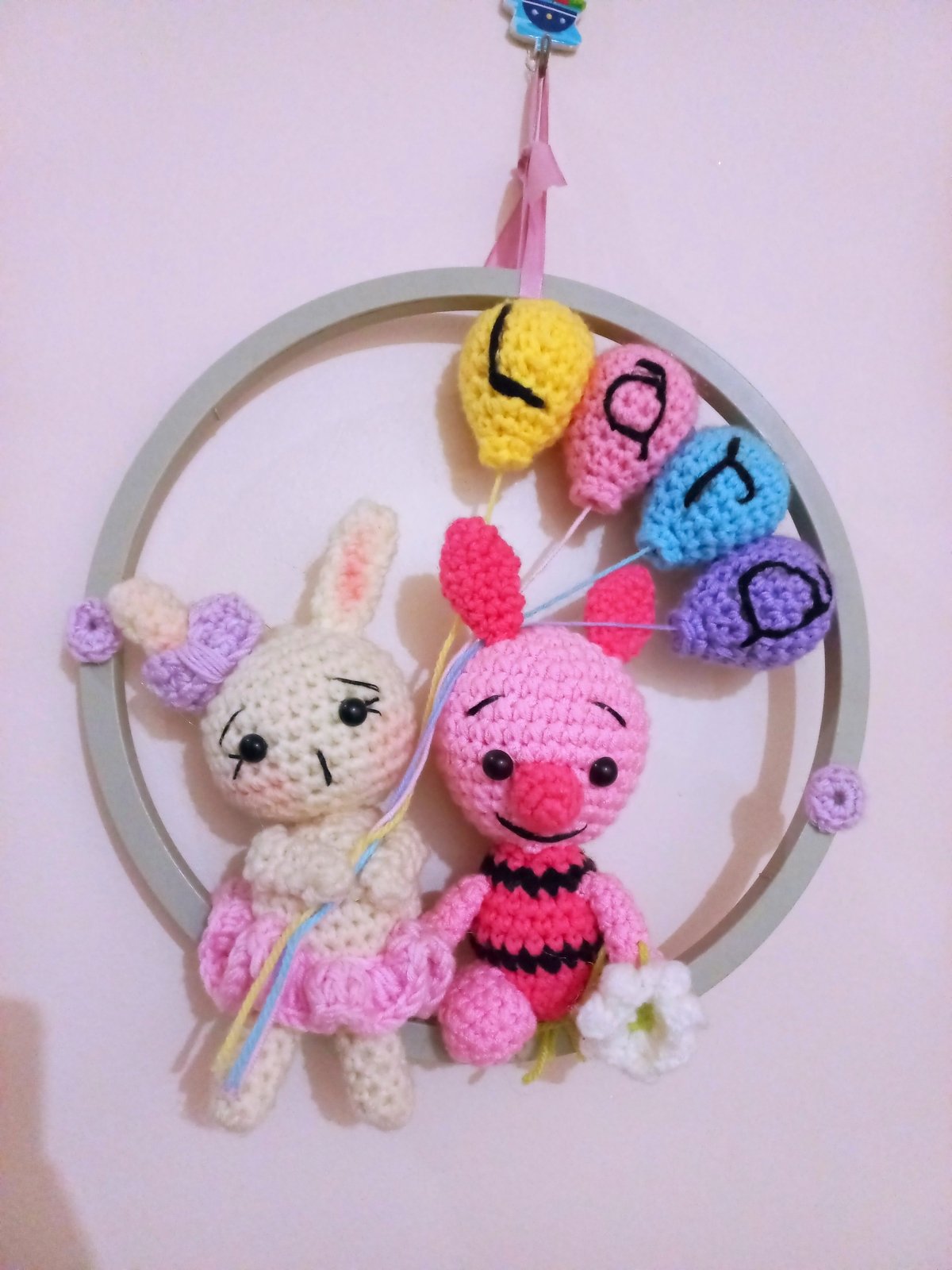 A hanging frame for children in three-dimensional crochet shapes in attractive colors. All names, colors, and designs are available.