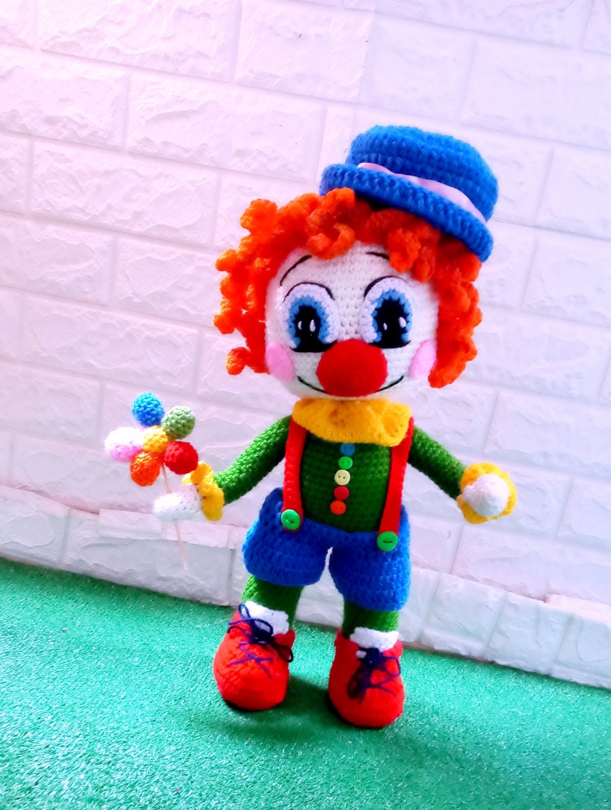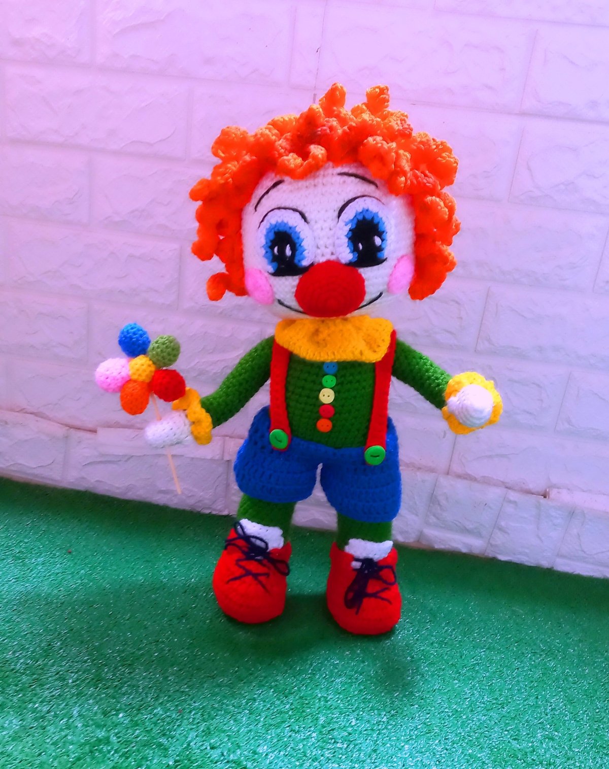 A colorful and very cheerful clown doll, 35 cm long, stuffed with fiber and reinforced with internal wire for easy movement and completely safe for children. 100% handmade.